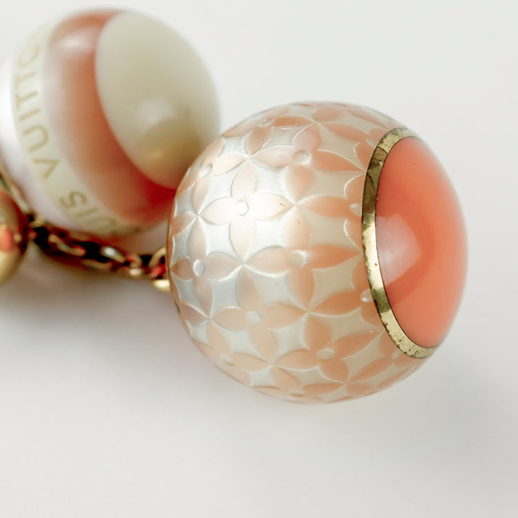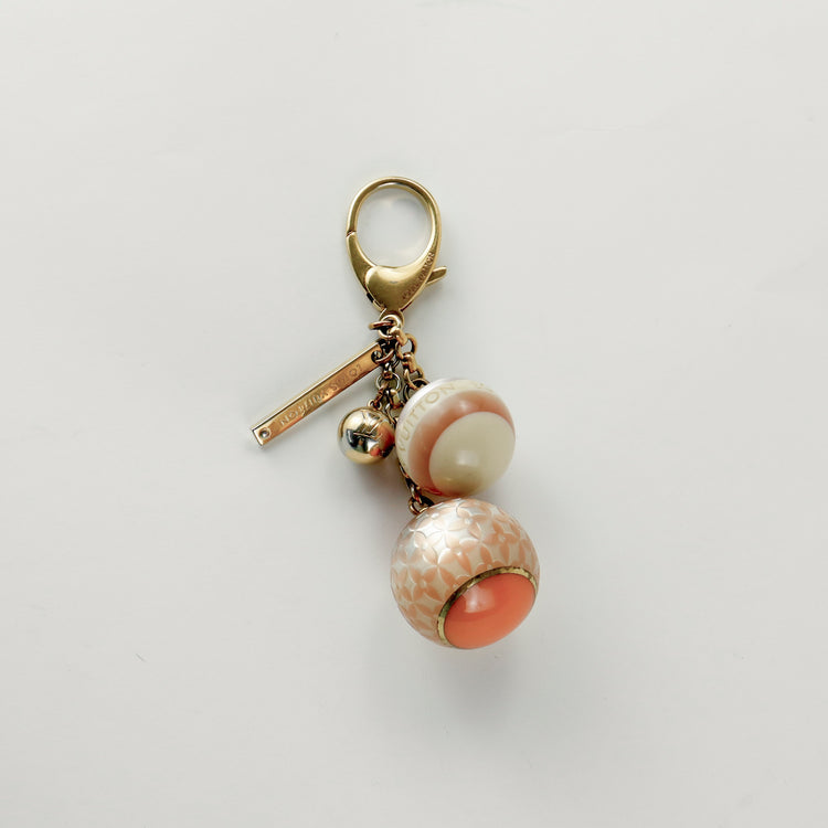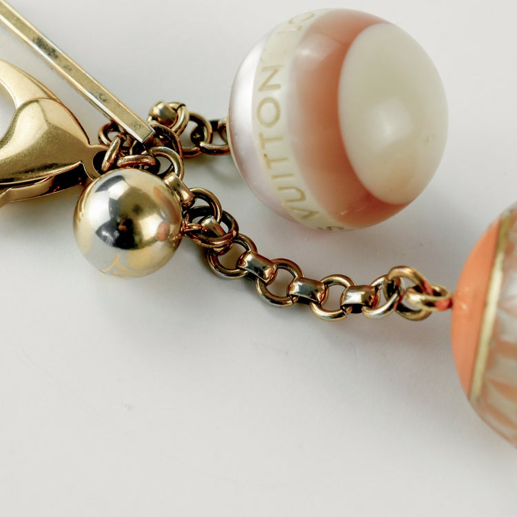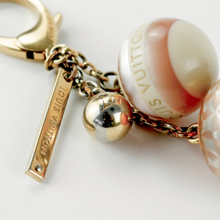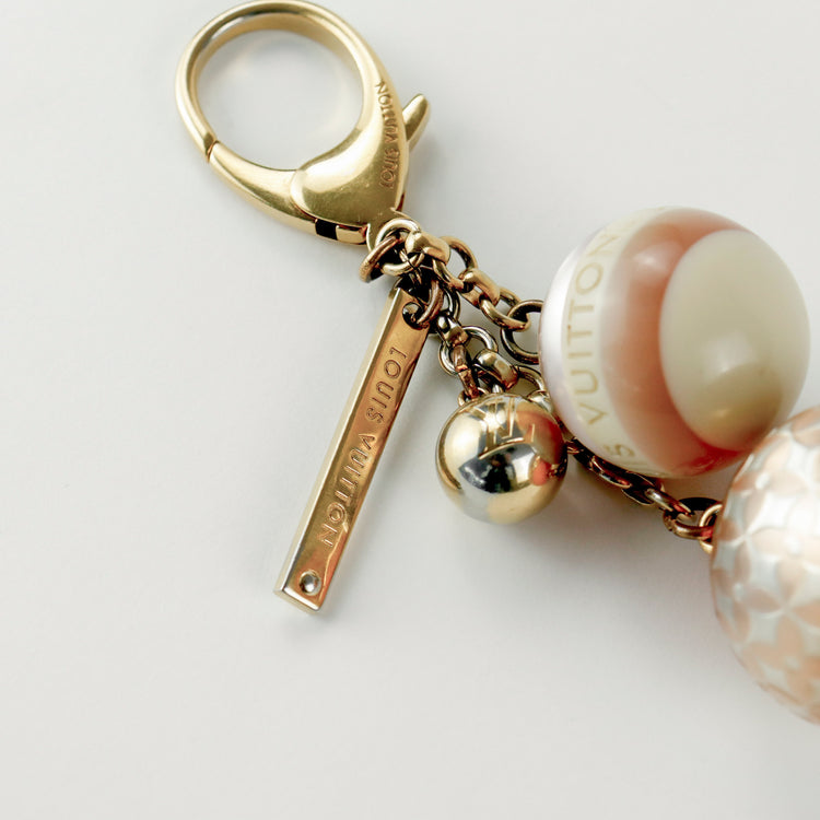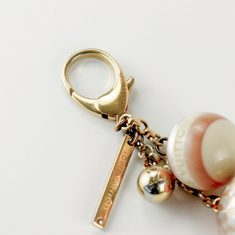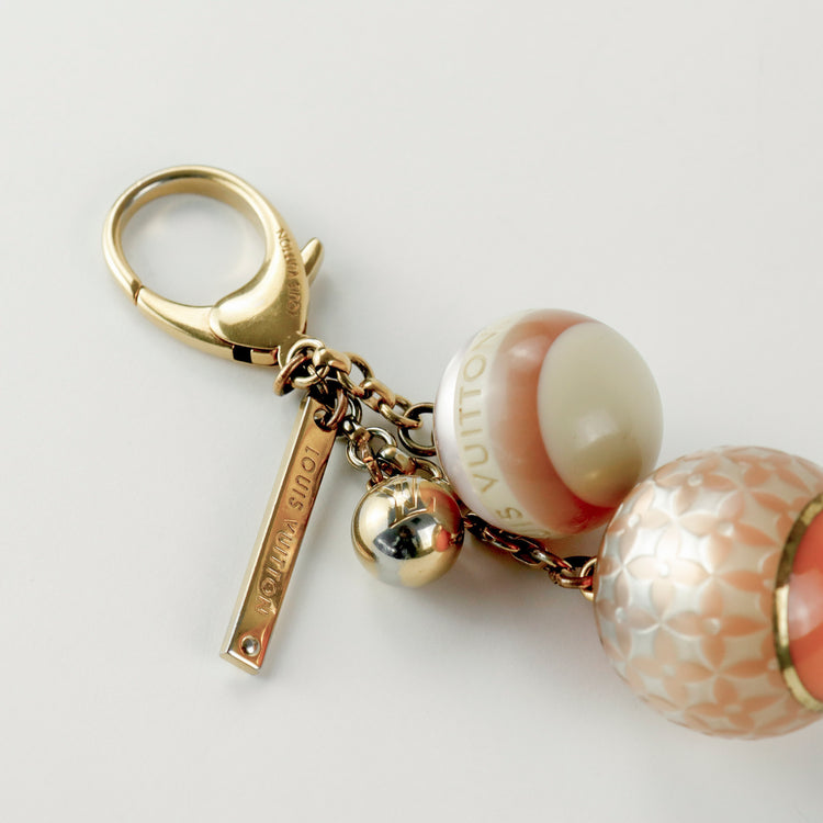 Llavero Miniland Croisette de la marca Louis Vuitton, elaborado en metal dorado con esferas en acrílico, desgaste por uso, deschapado en algunas zonas.