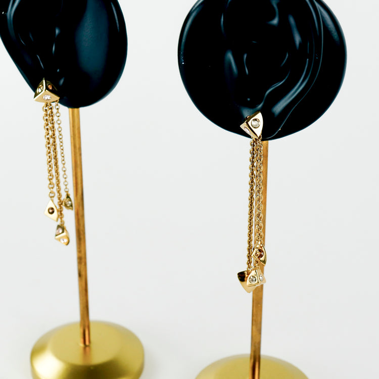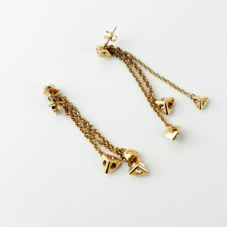 Par de aretes colgantes Louis Vuitton, fabricados en metal dorado, diseñados con barbas y prismáticos adornados con circonias y el característico logo de la marca.