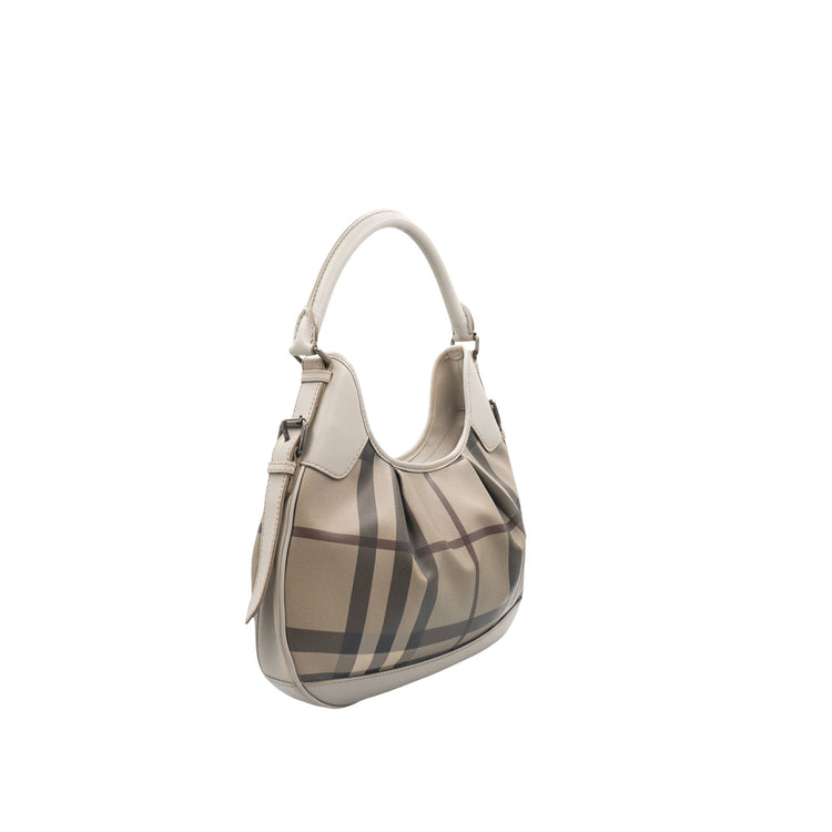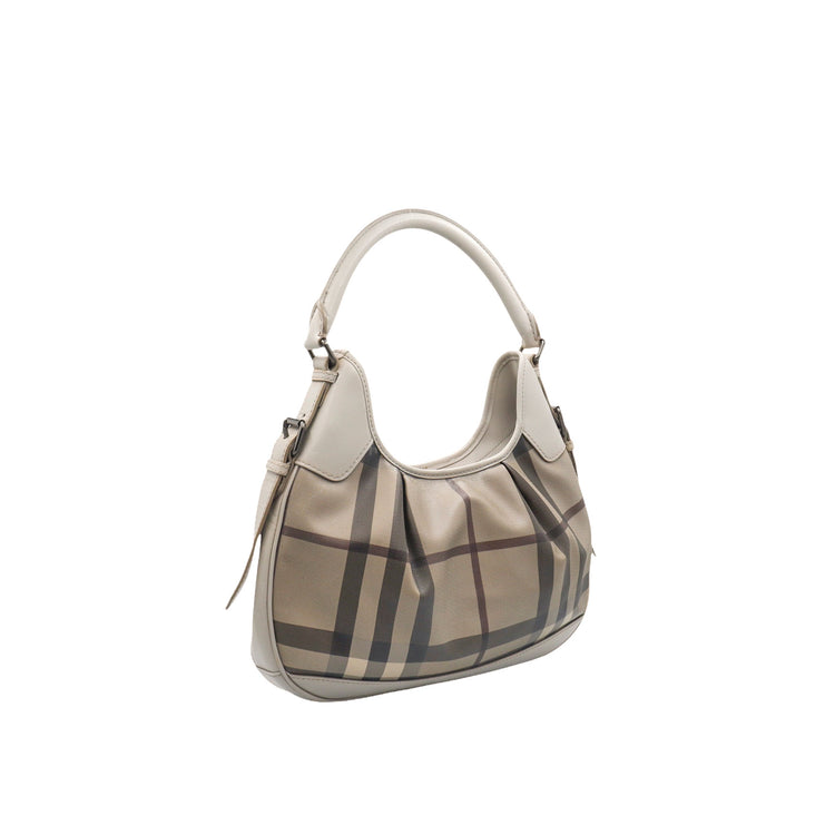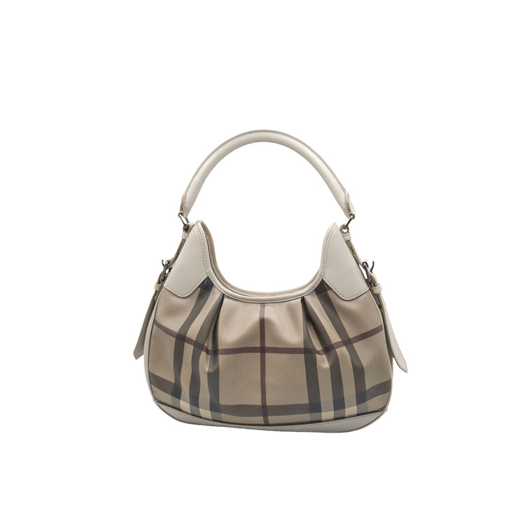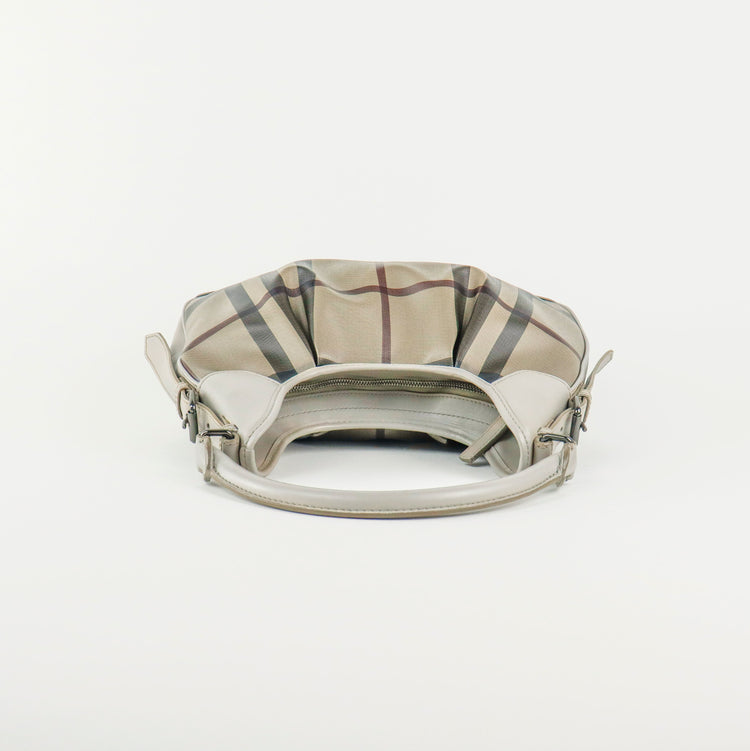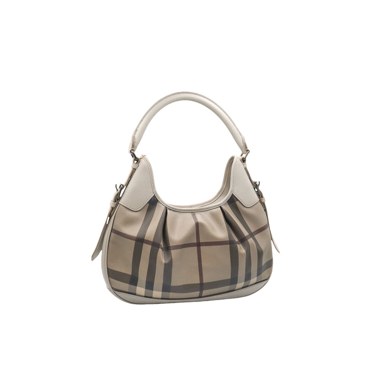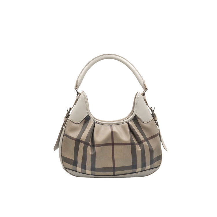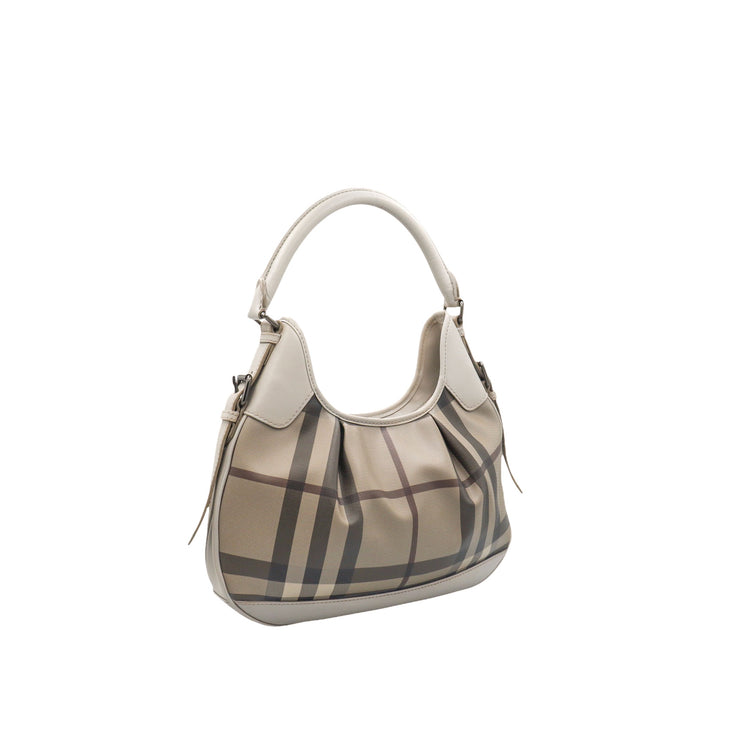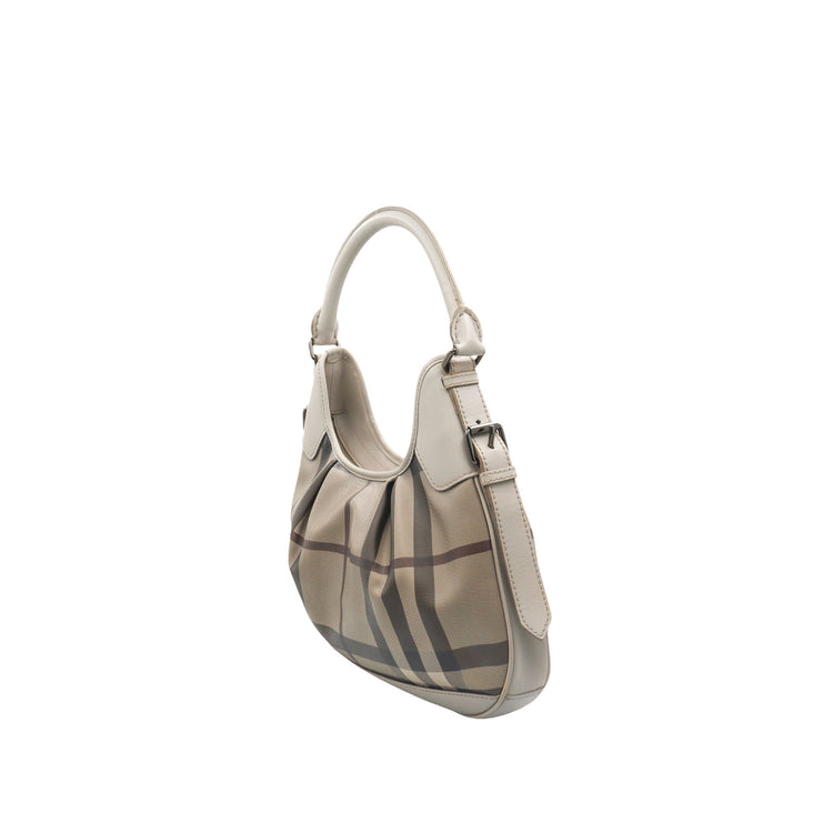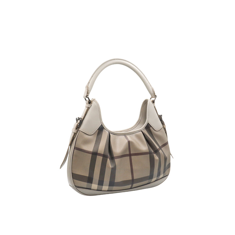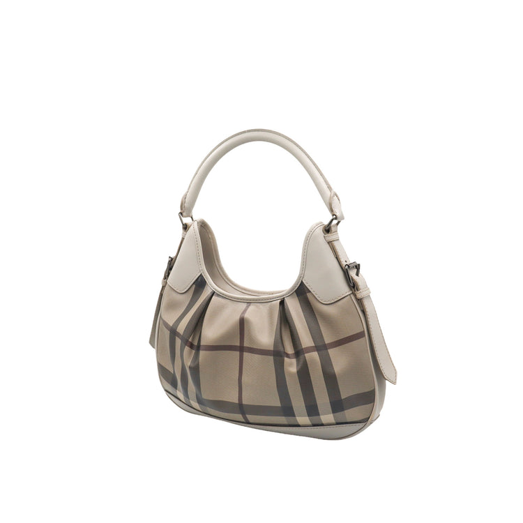 Bolso hobo Burberry de la línea Brooklyn, confeccionado en lona beige revestida con el patrón Nova Check, asa rígida superior, forro interno en tela café con tres compartimentos internos, cierres tipo cremallera y herrajes cromados.