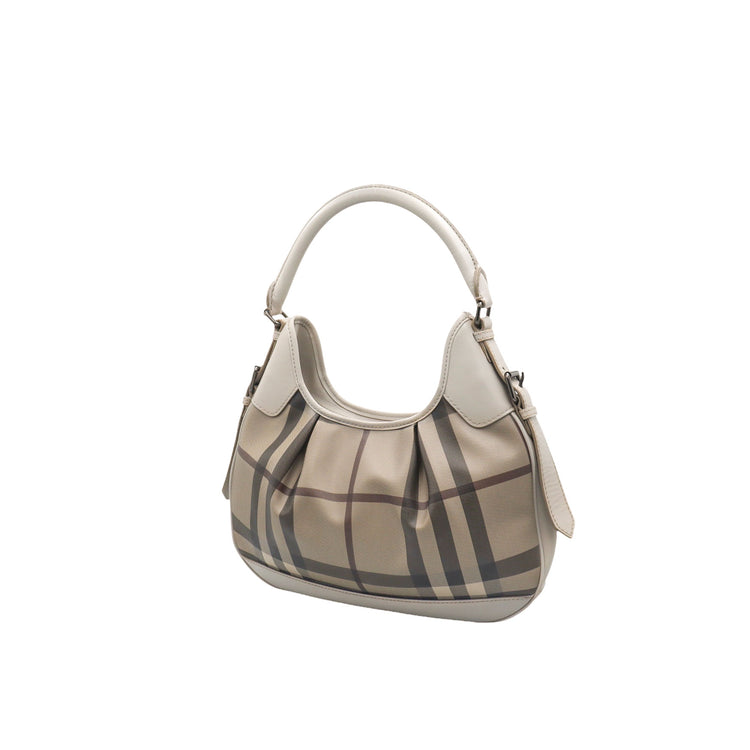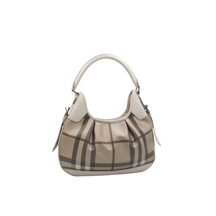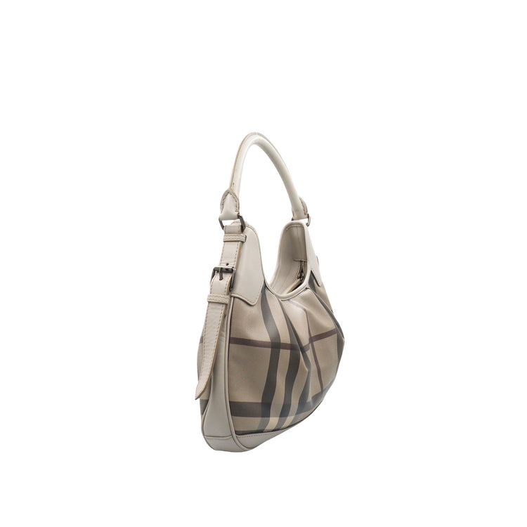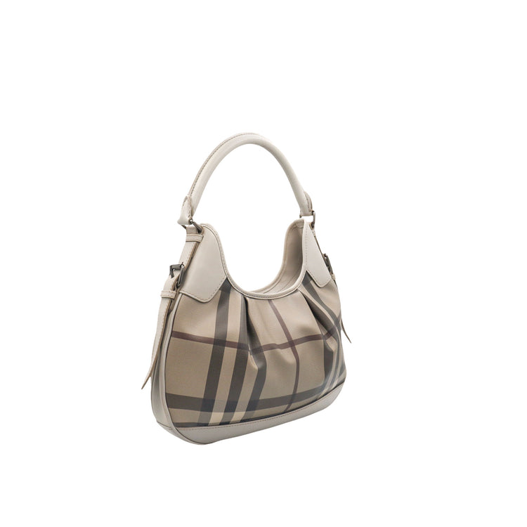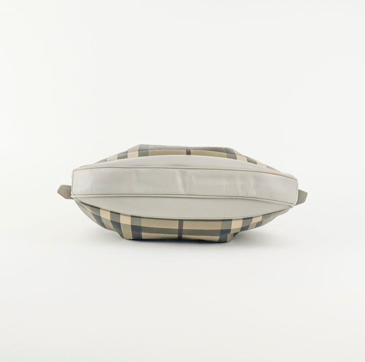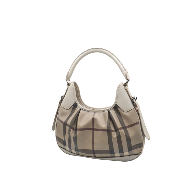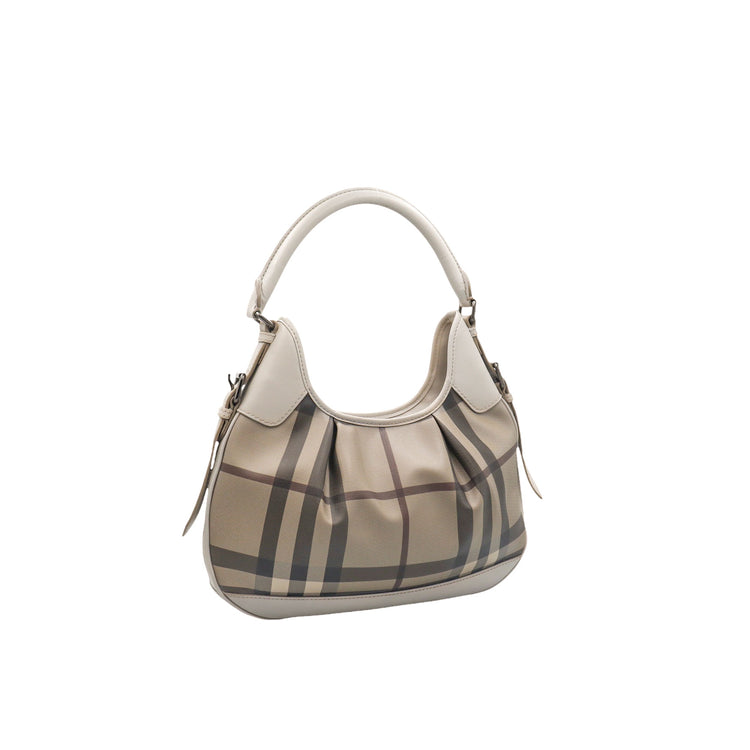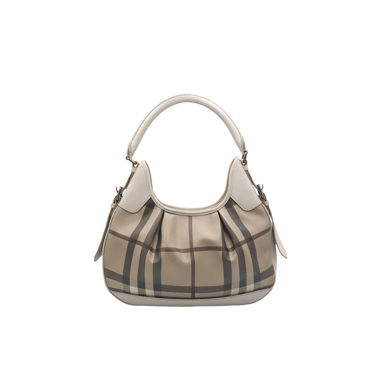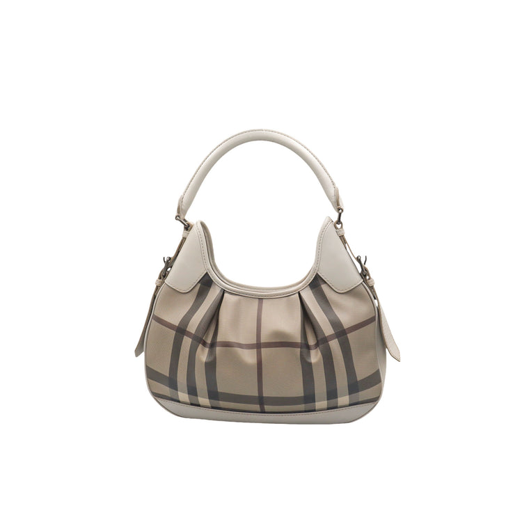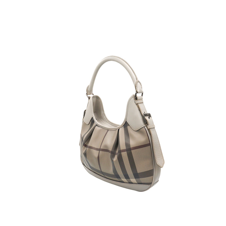 Bolso hobo Burberry de la línea Brooklyn, confeccionado en lona beige revestida con el patrón Nova Check, asa rígida superior, forro interno en tela café con tres compartimentos internos, cierres tipo cremallera y herrajes cromados.