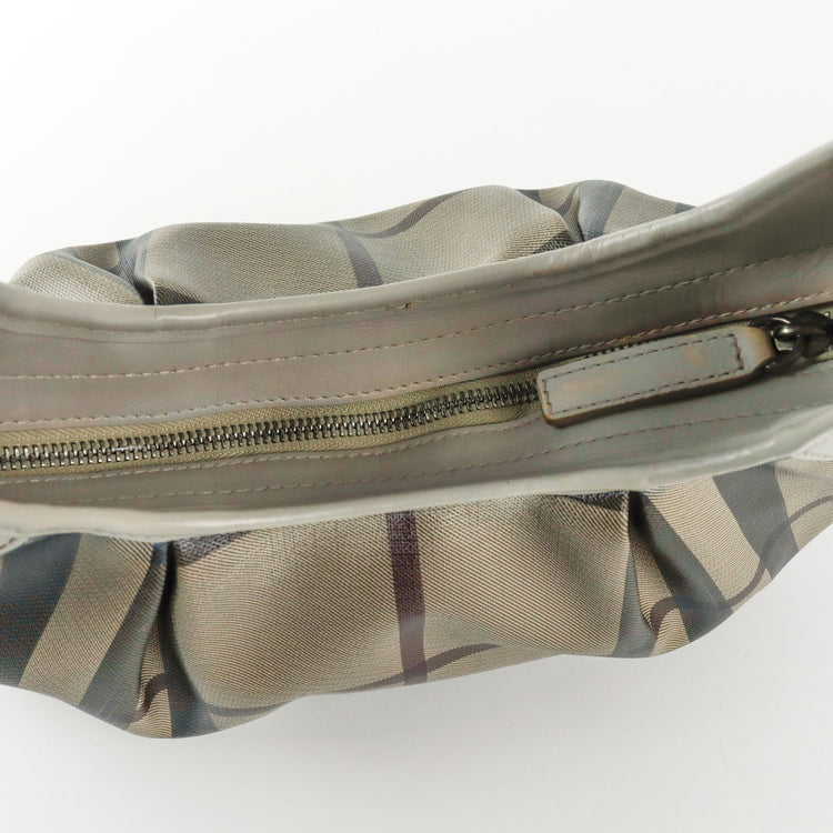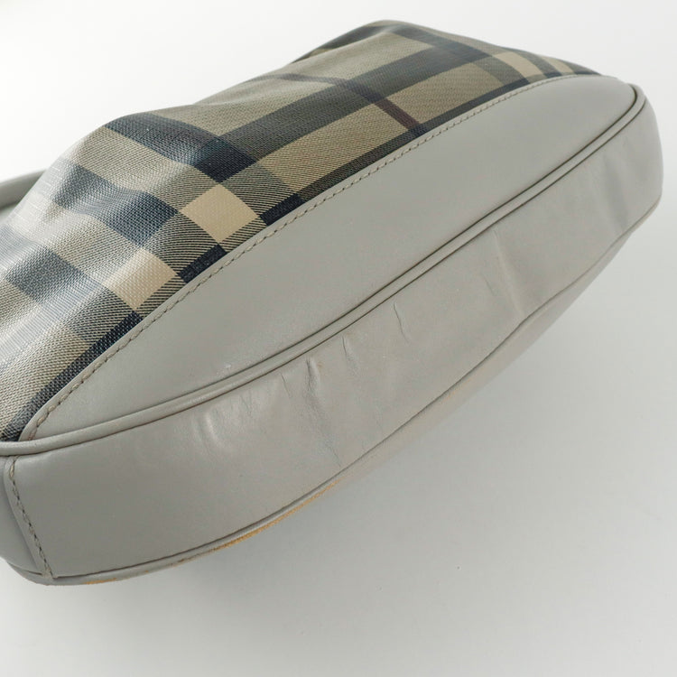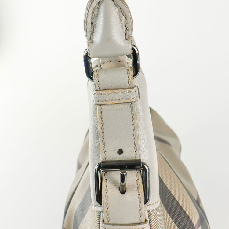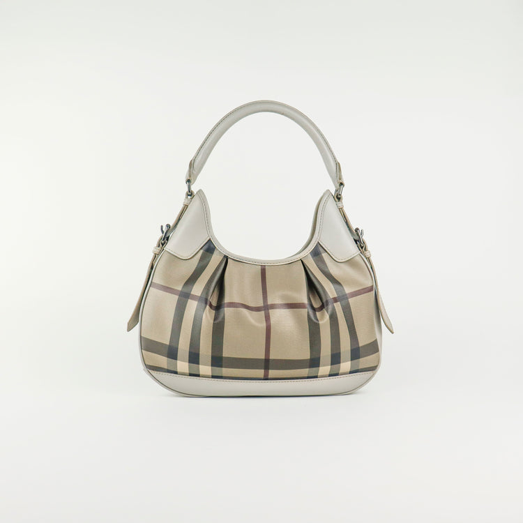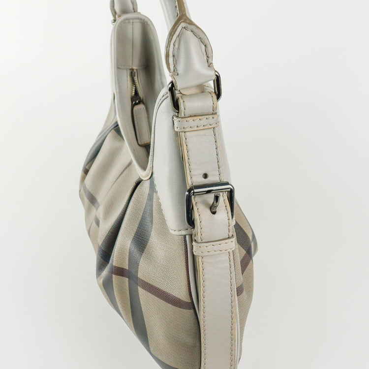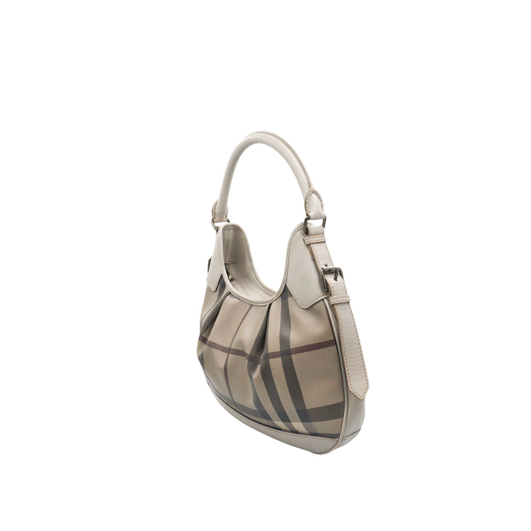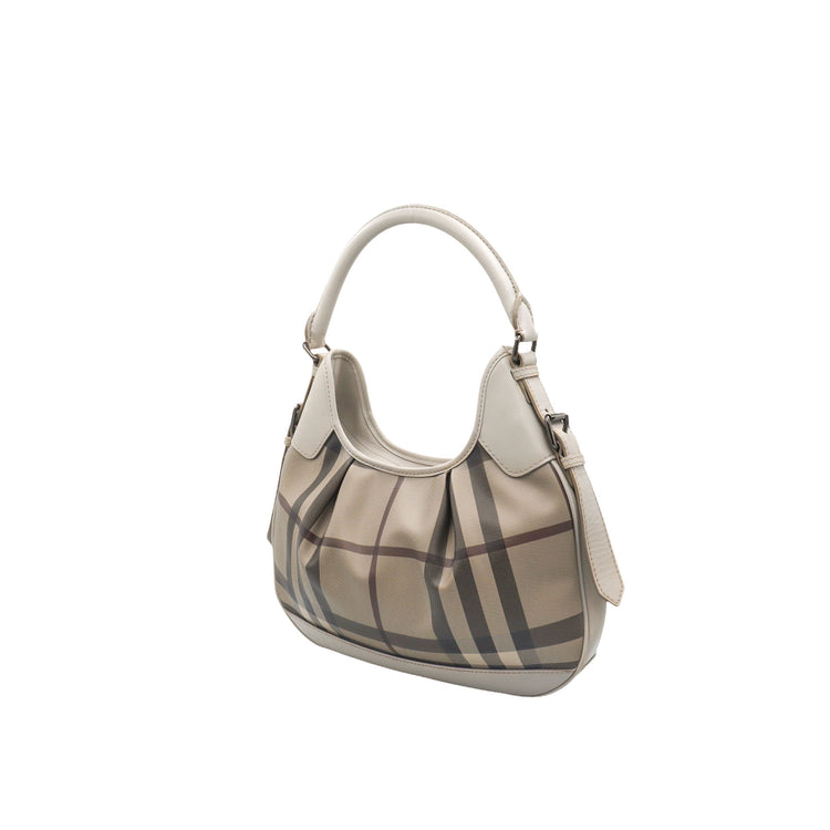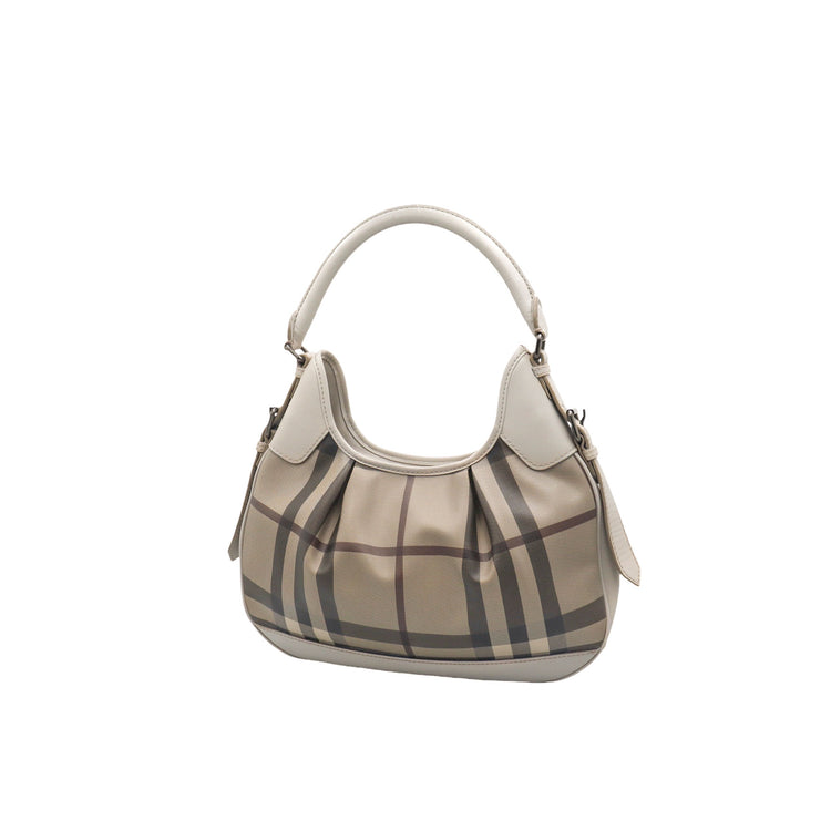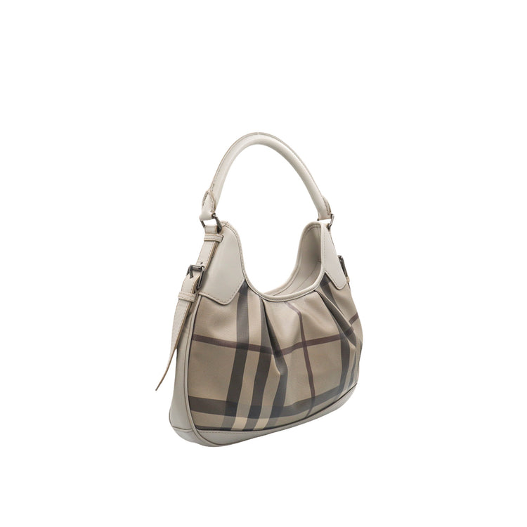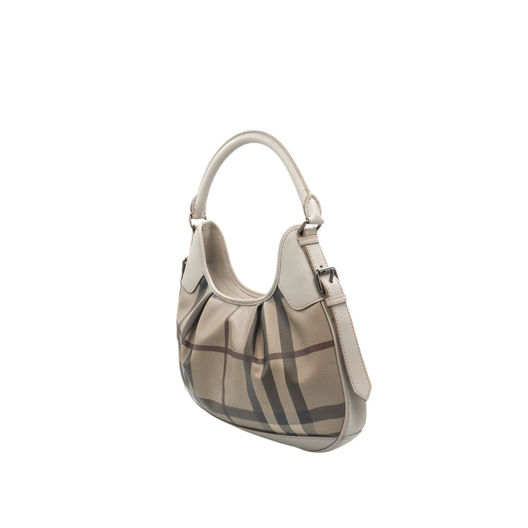 Bolso hobo Burberry de la línea Brooklyn, confeccionado en lona beige revestida con el patrón Nova Check, asa rígida superior, forro interno en tela café con tres compartimentos internos, cierres tipo cremallera y herrajes cromados.
