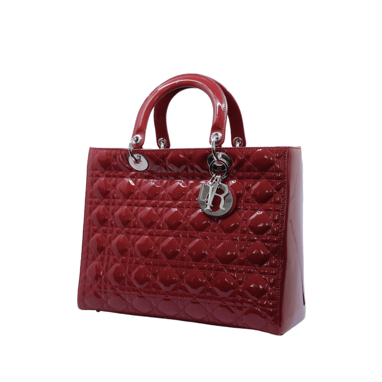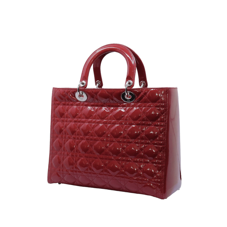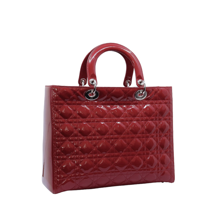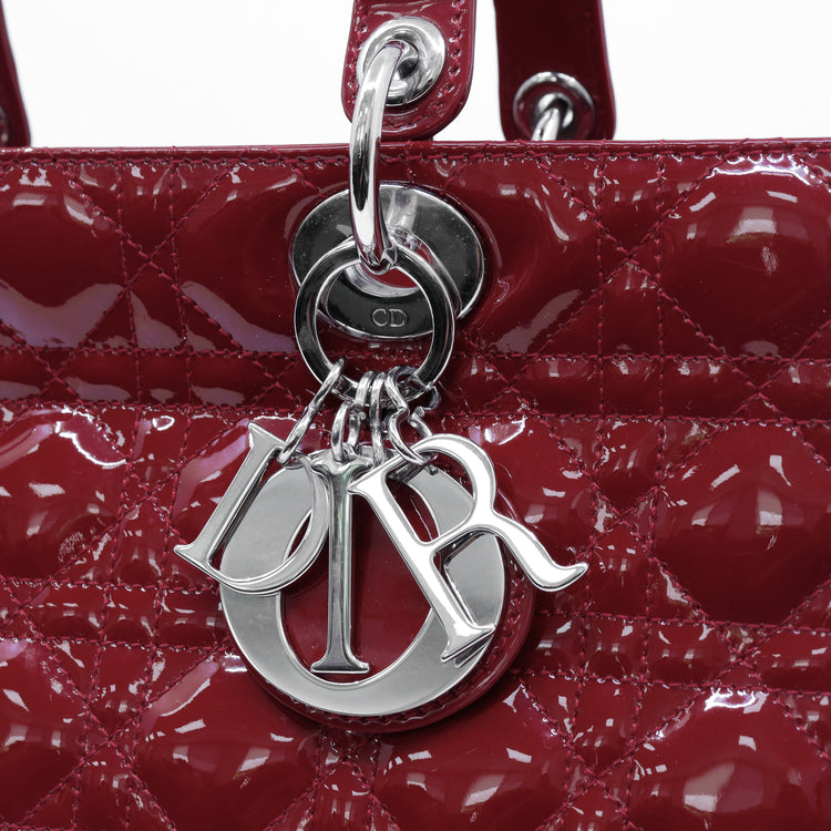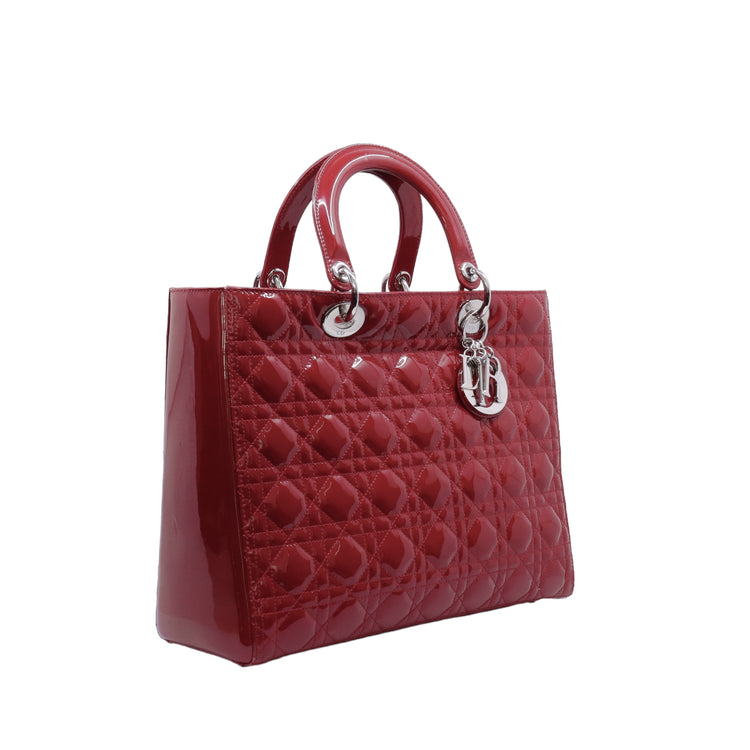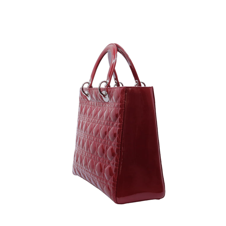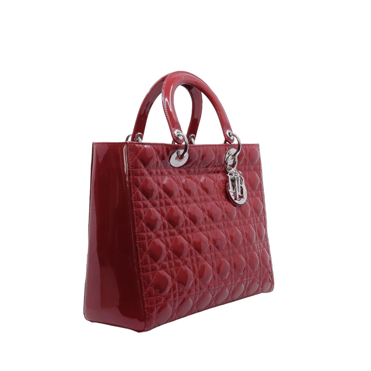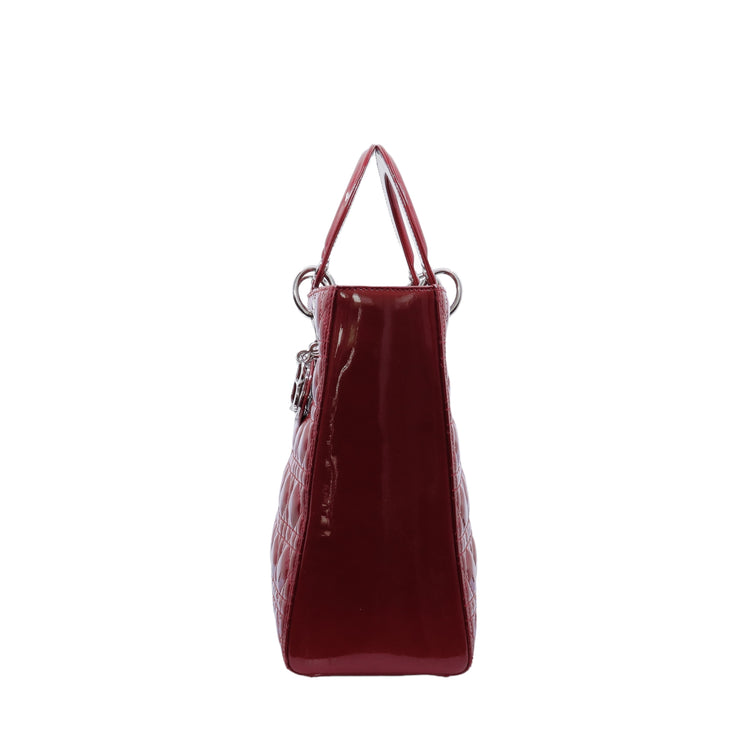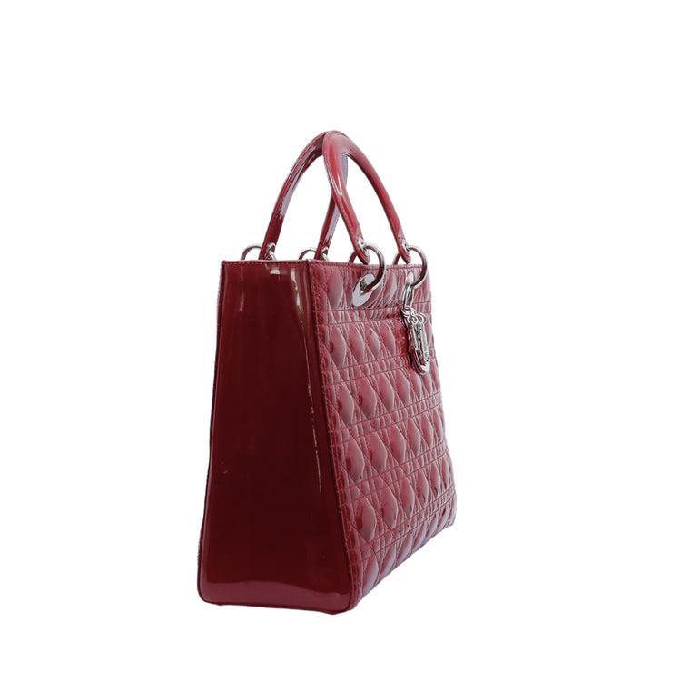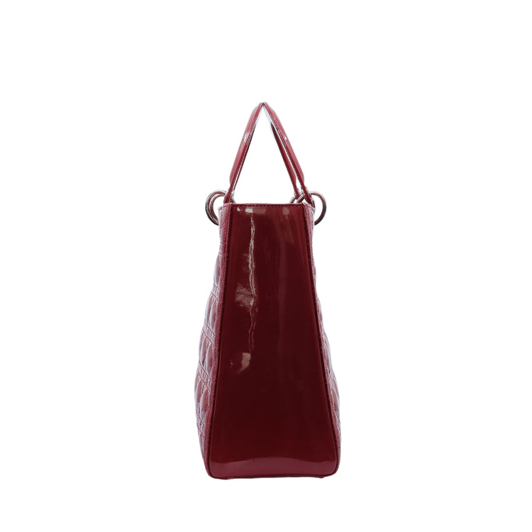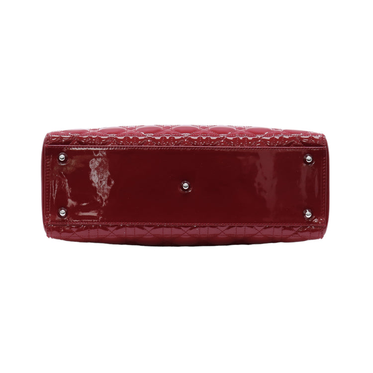 Bolso clásico Christian Dior, de la línea Lady Dior confeccionado en piel de becerro Cannage acharolada en color rojo, con 2 asas rígidas, zipper, charm y herrajes metálicos en color plata, cuenta con strap ajustable.