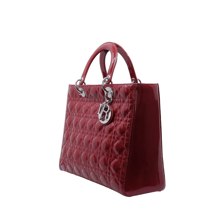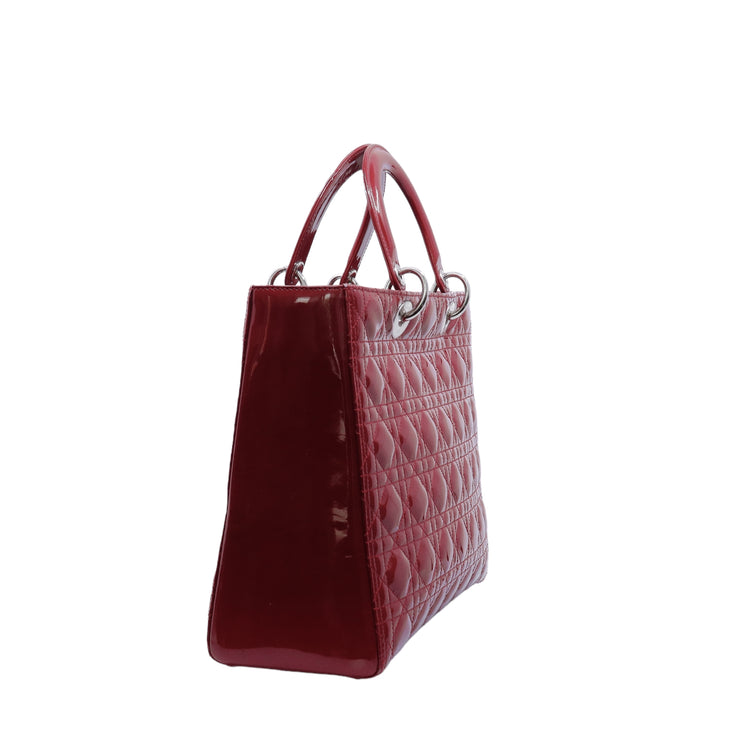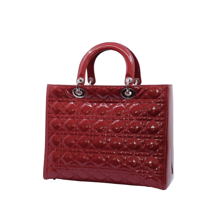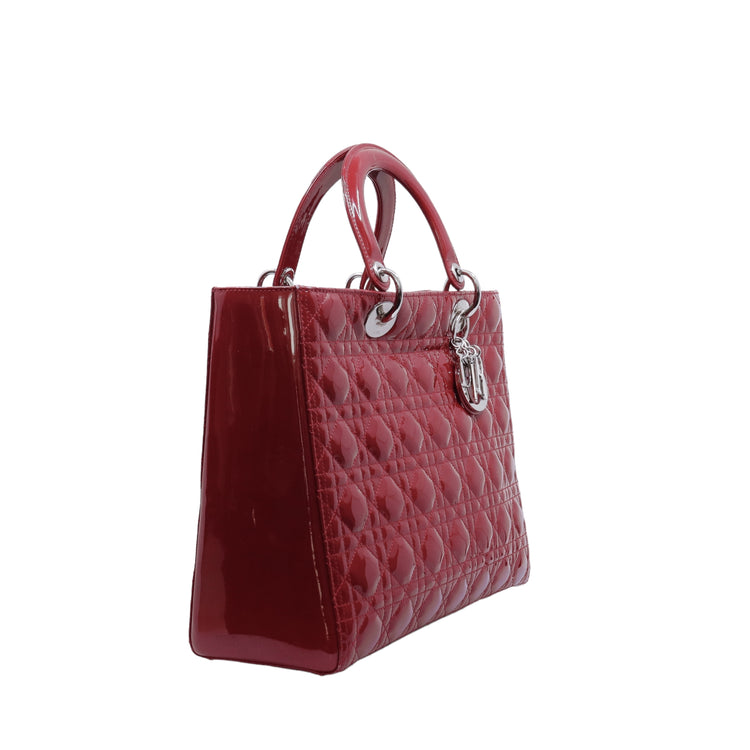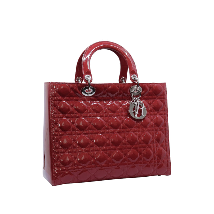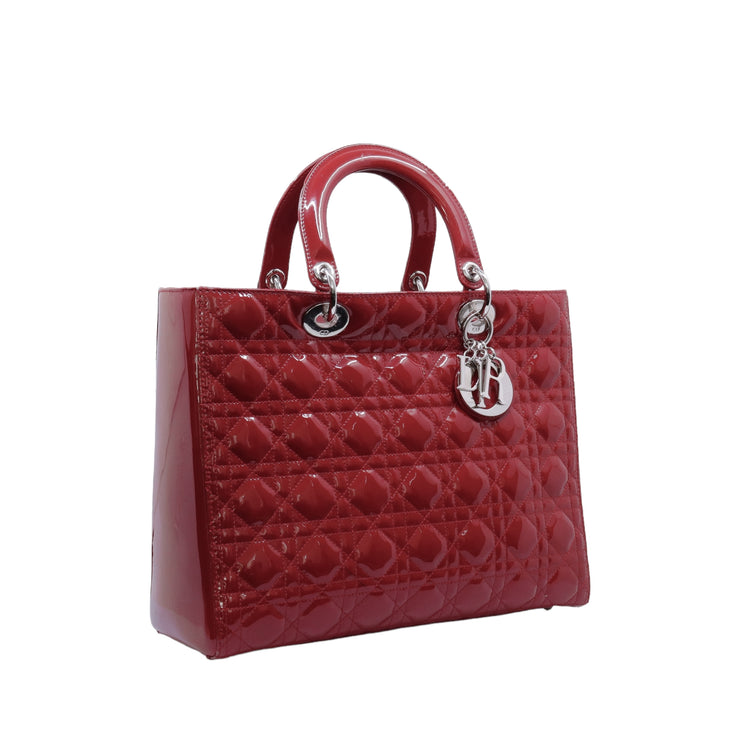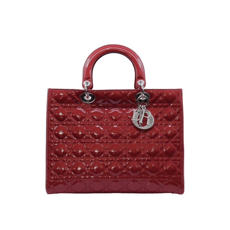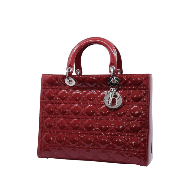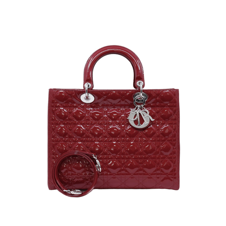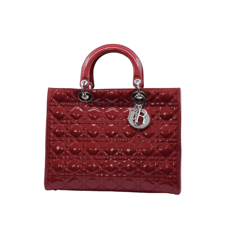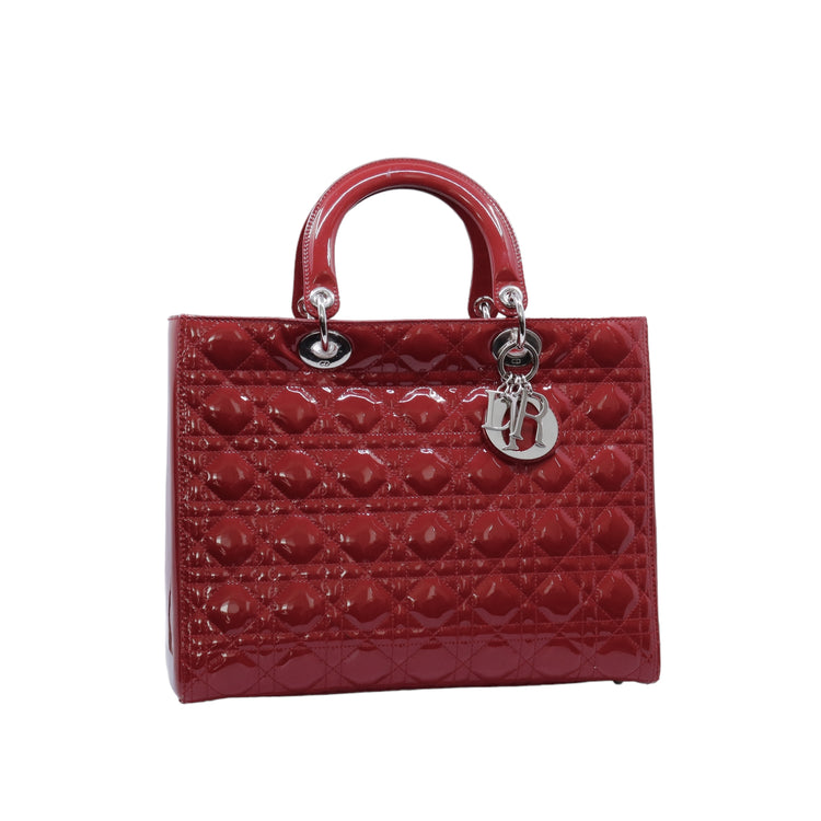 Bolso clásico Christian Dior, de la línea Lady Dior confeccionado en piel de becerro Cannage acharolada en color rojo, con 2 asas rígidas, zipper, charm y herrajes metálicos en color plata, cuenta con strap ajustable.