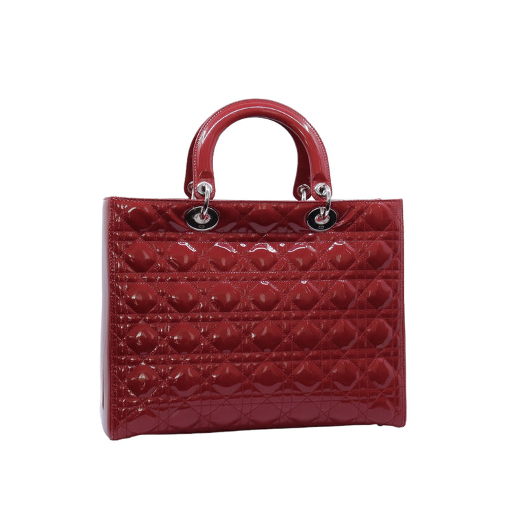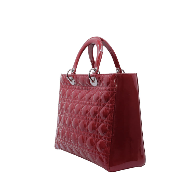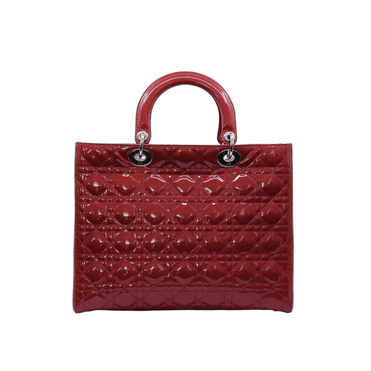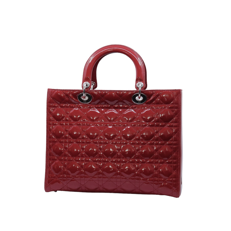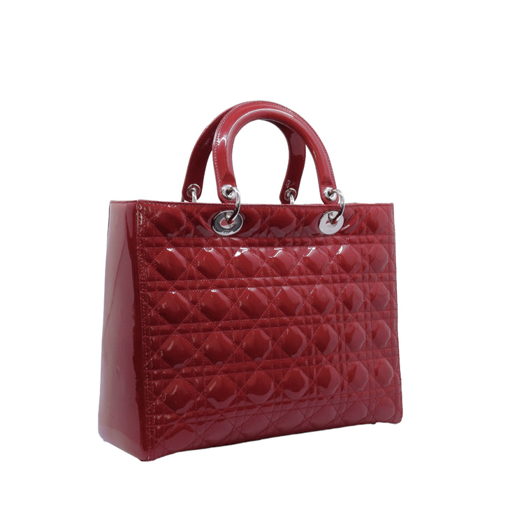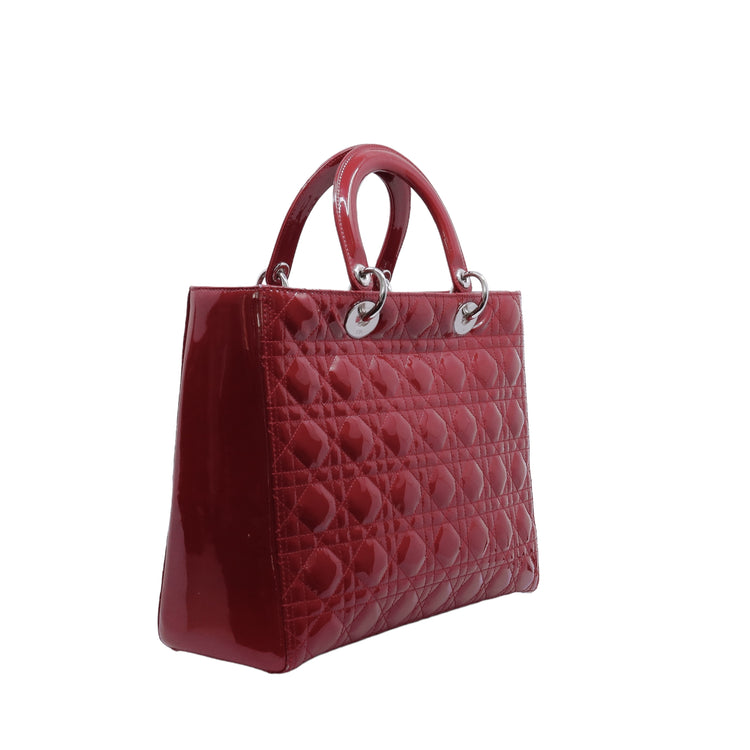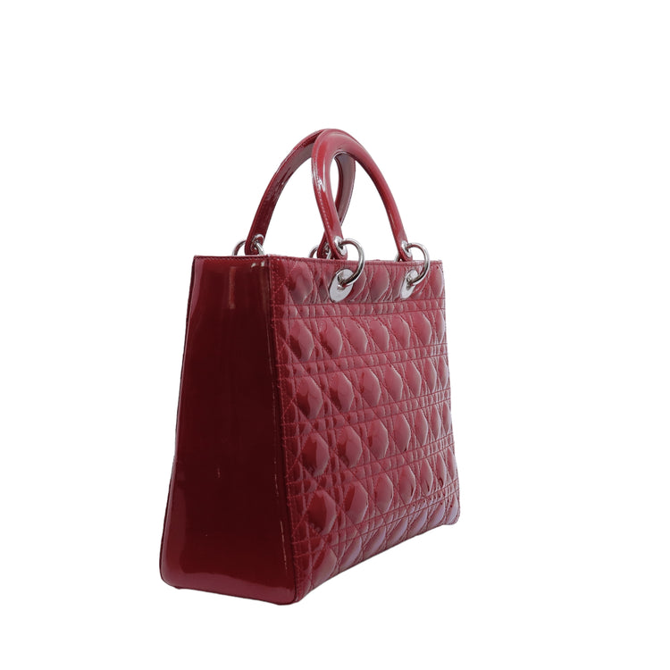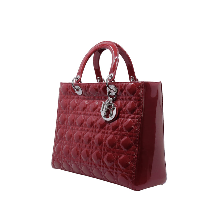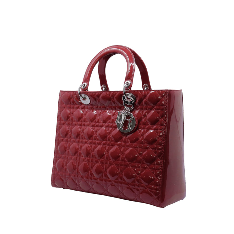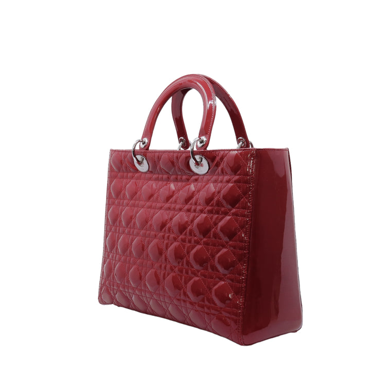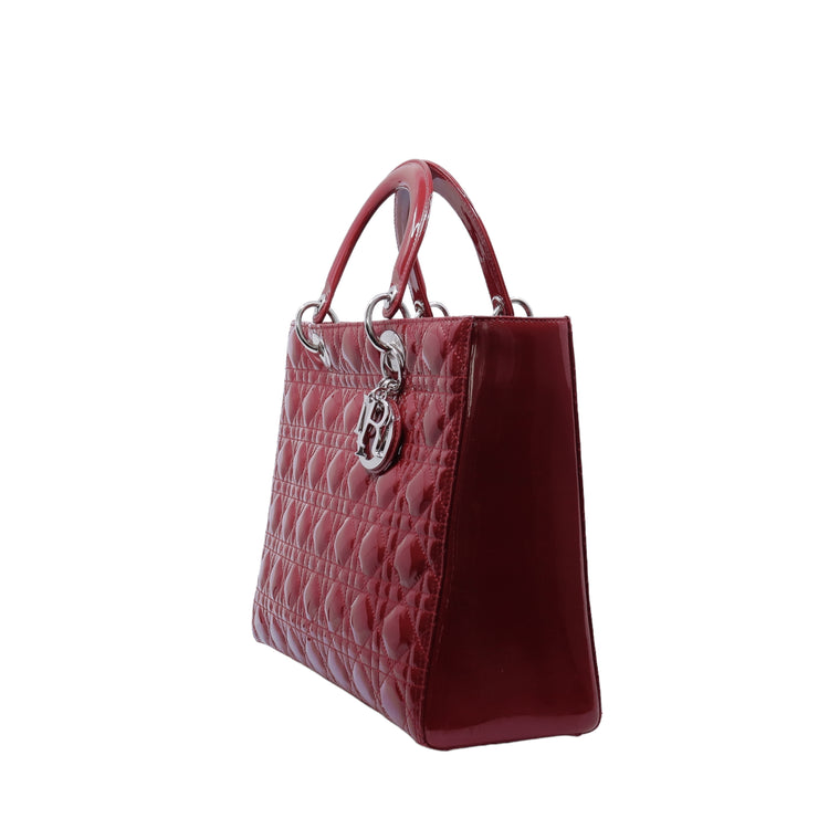 Bolso clásico Christian Dior, de la línea Lady Dior confeccionado en piel de becerro Cannage acharolada en color rojo, con 2 asas rígidas, zipper, charm y herrajes metálicos en color plata, cuenta con strap ajustable.