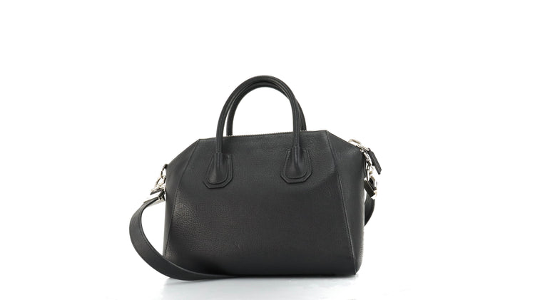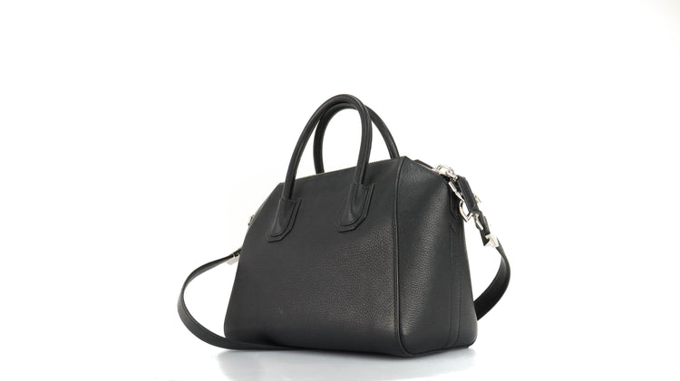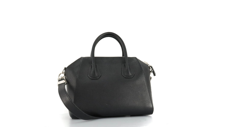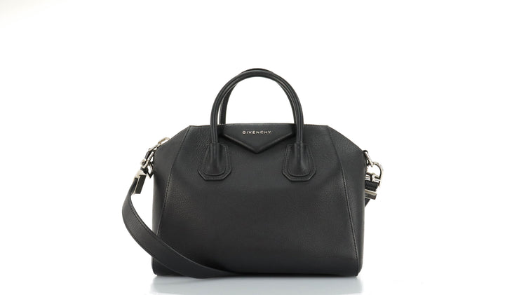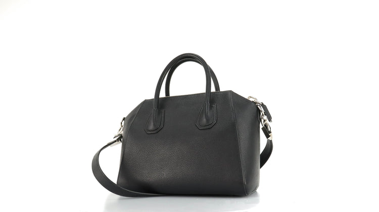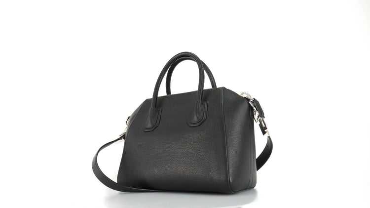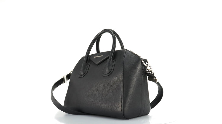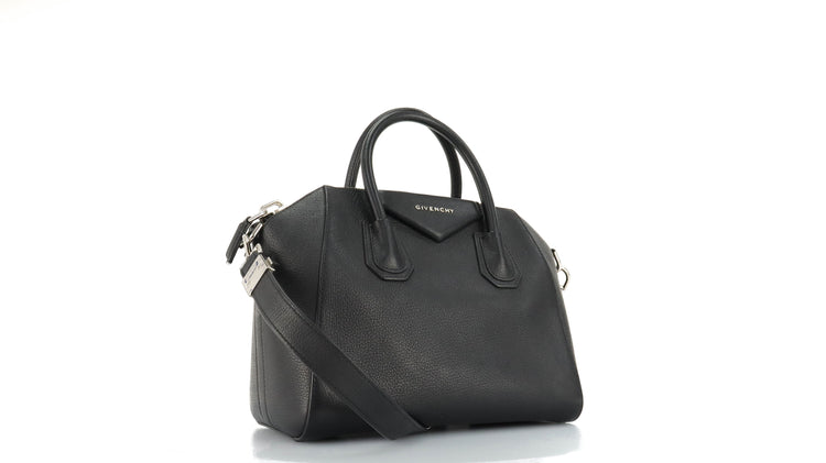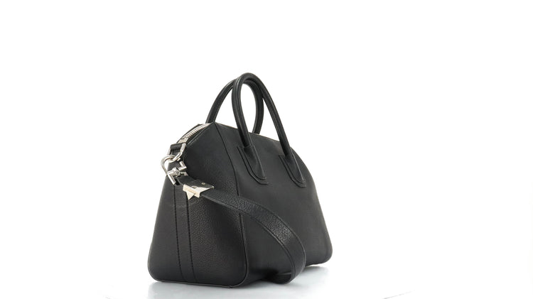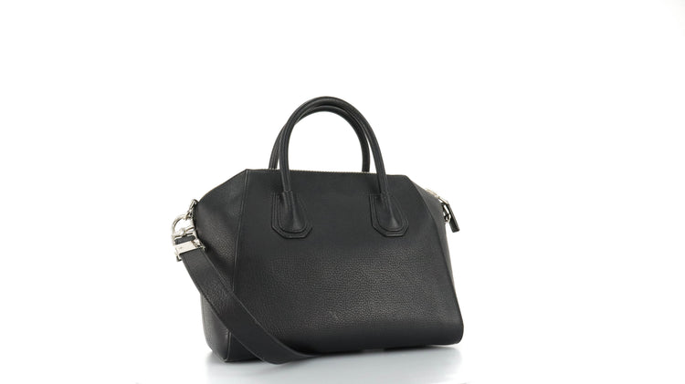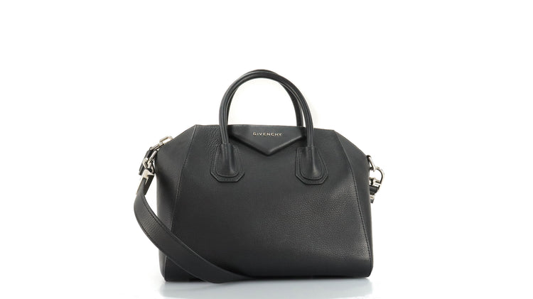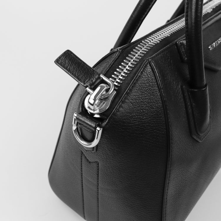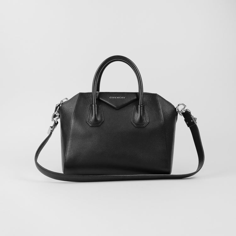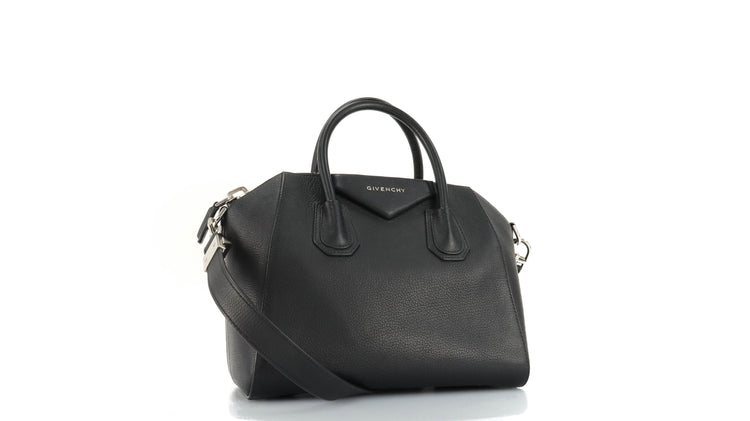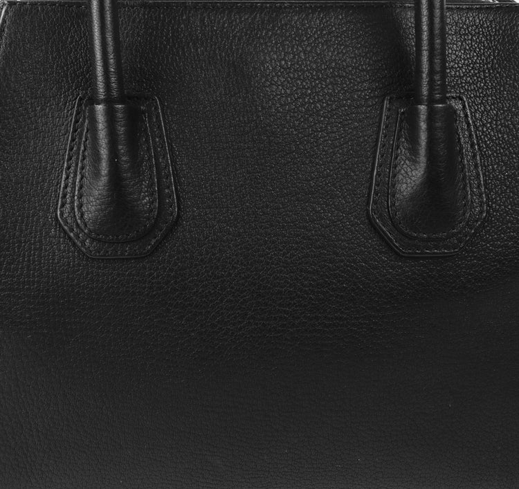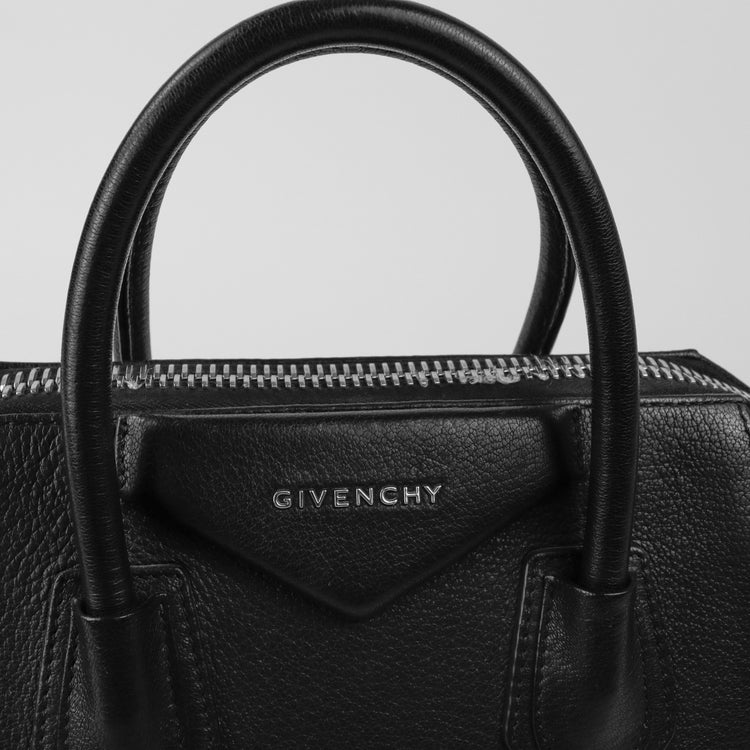 Bolso Givenchy Antígona, confeccionado en piel granulada de cabra color negro, con dos asas y bandolera ajustable para usar al hombro o cruzada, logotipo en metal plateado, interior forrado en tela del mismo tono negro , bolsillos planos interiores y cierre tipo cremallera.