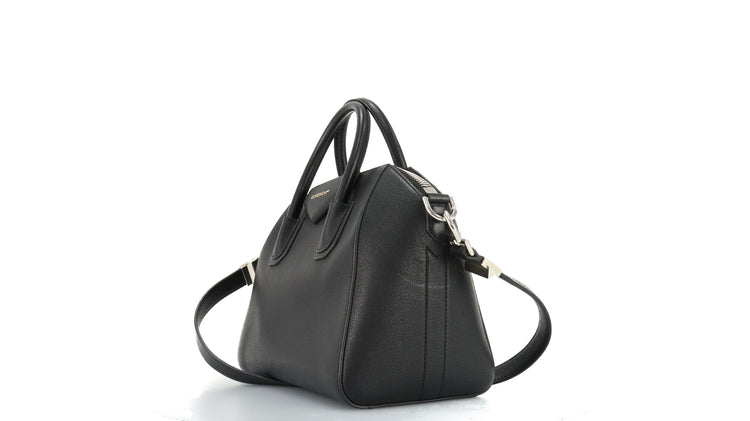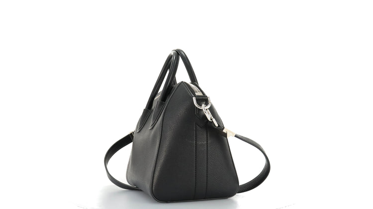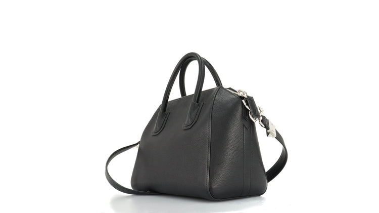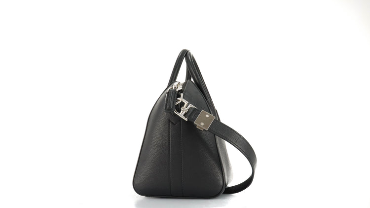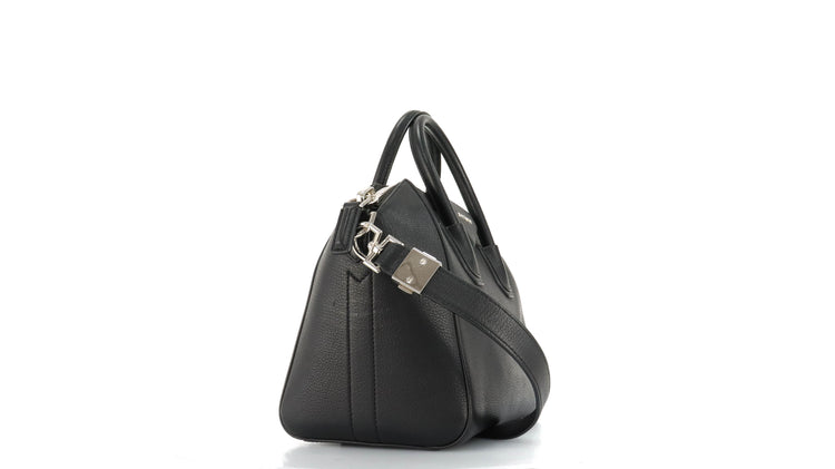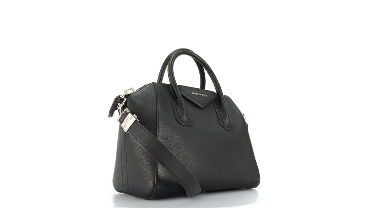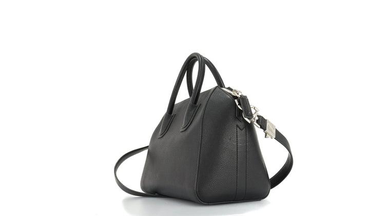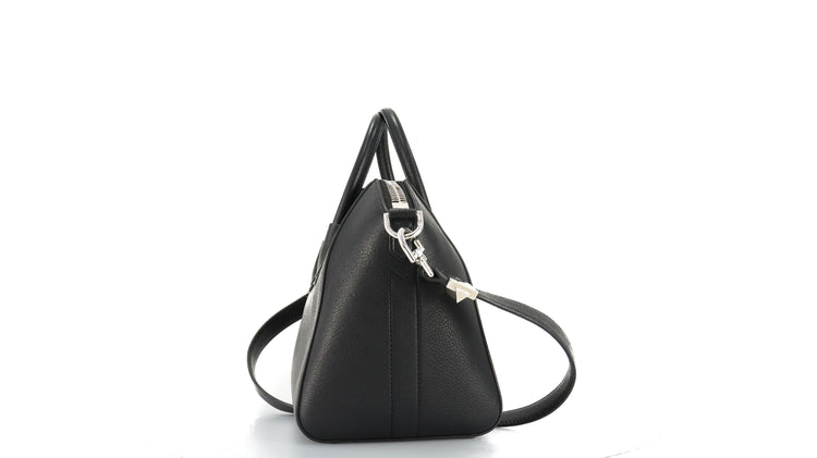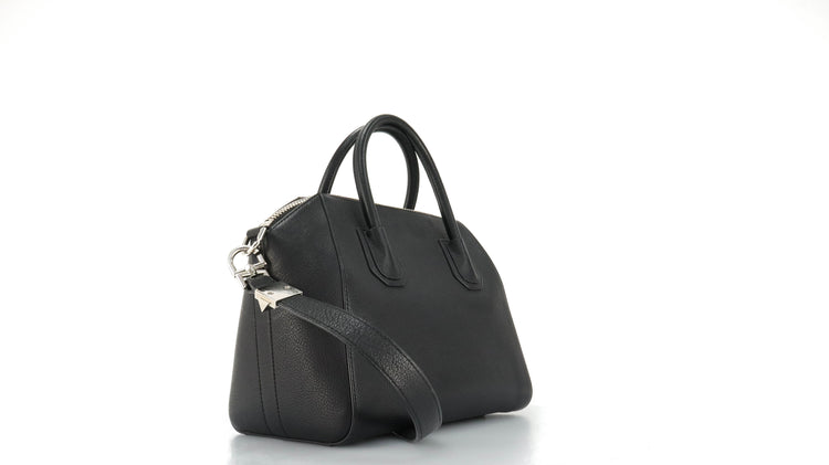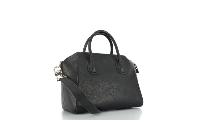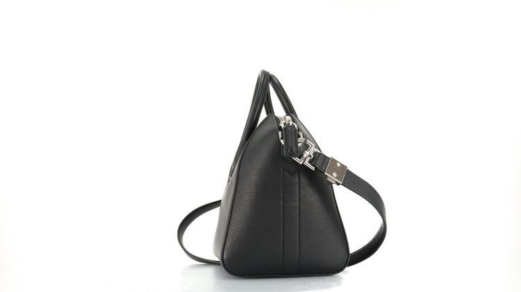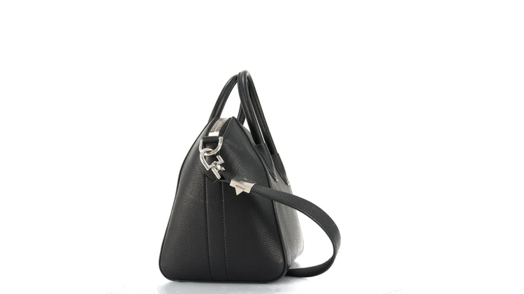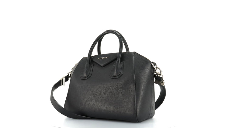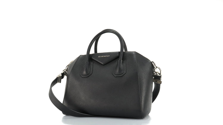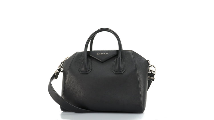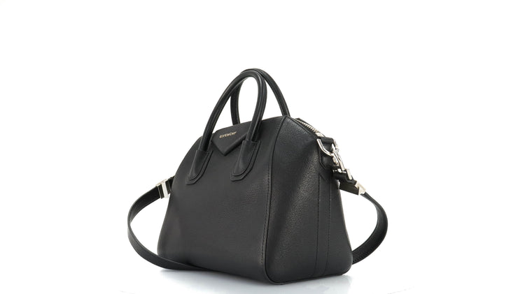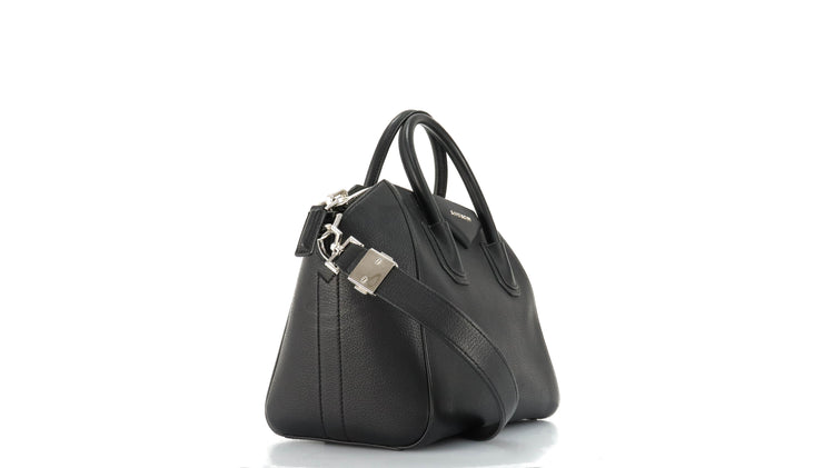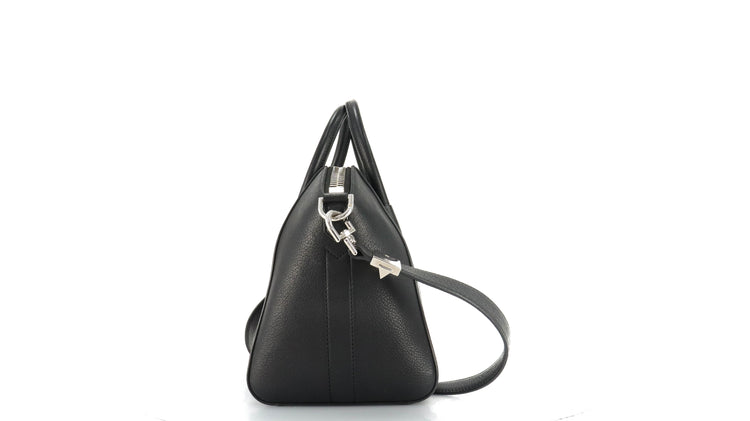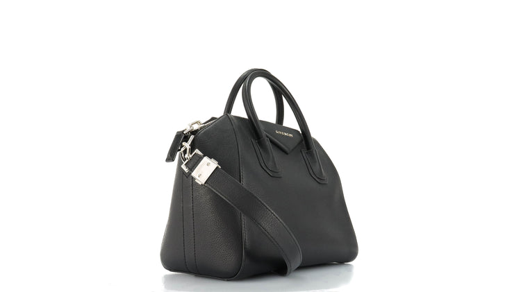 Bolso Givenchy Antígona, confeccionado en piel granulada de cabra color negro, con dos asas y bandolera ajustable para usar al hombro o cruzada, logotipo en metal plateado, interior forrado en tela del mismo tono negro , bolsillos planos interiores y cierre tipo cremallera.