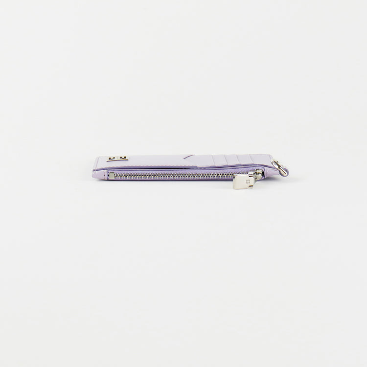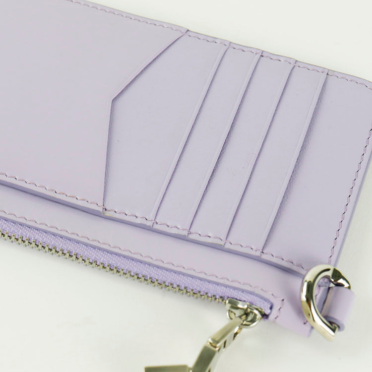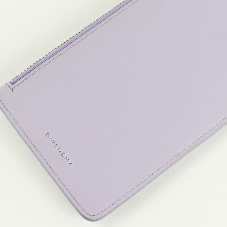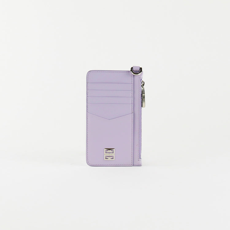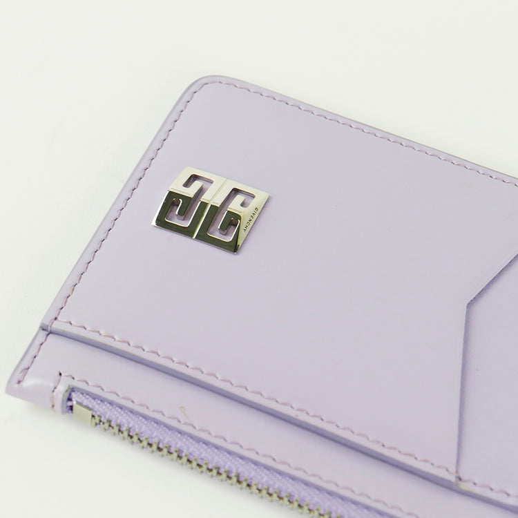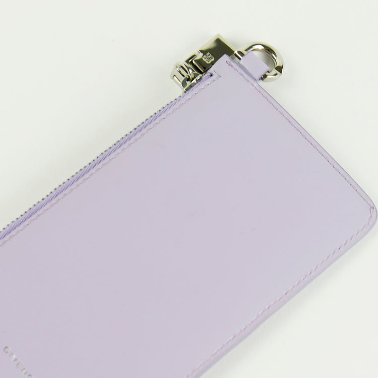 Tarjetero marca Givenchy confeccionado en piel de becerro pulida color lila, cuenta con 5 ranuras para tarjetas, bolsillo lateral con cierre de cremallera, herrajes y logo frontal en color plata. Forro textil en color negro.