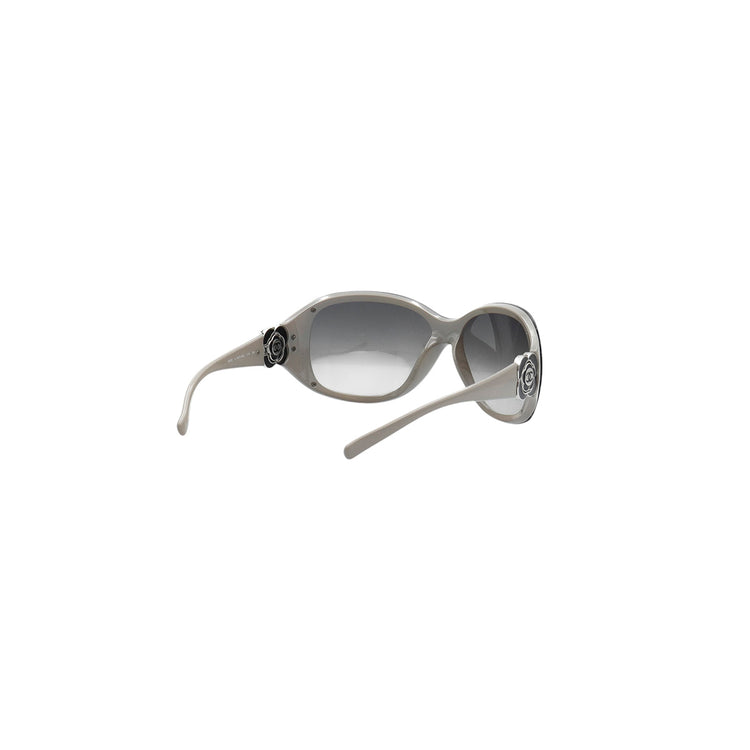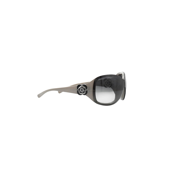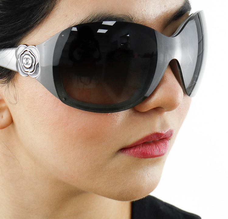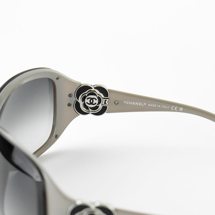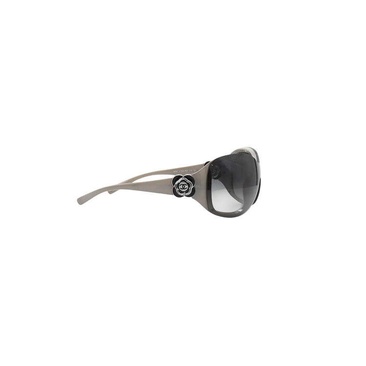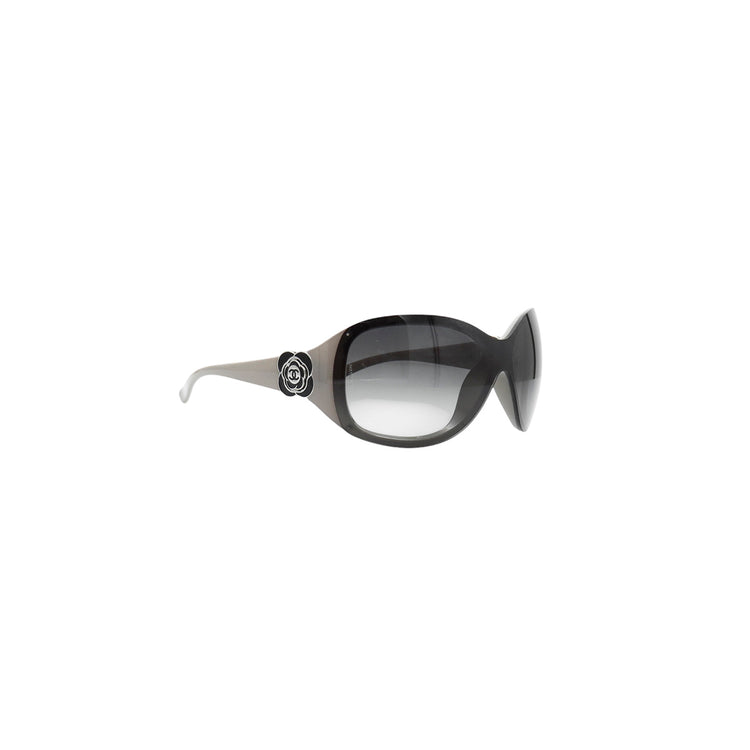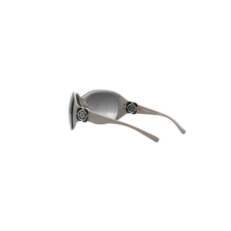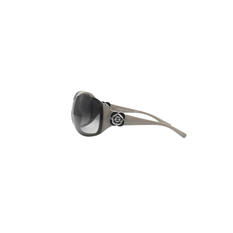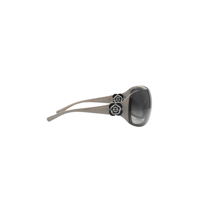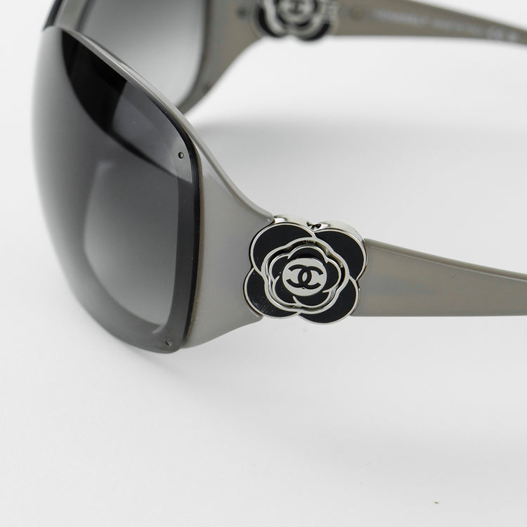 Gafas de sol de la marca Chanel, modelo 6032 Camelia, fabricadas en acrílico gris con aplicaciones metálicas, y micas color humo, folio: KC5087396, poco sucias con ligeros rayones casi imperceptibles.