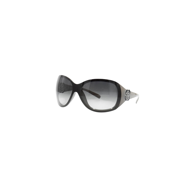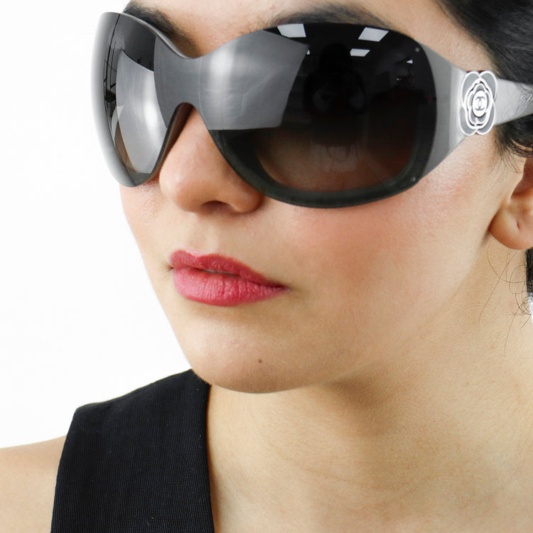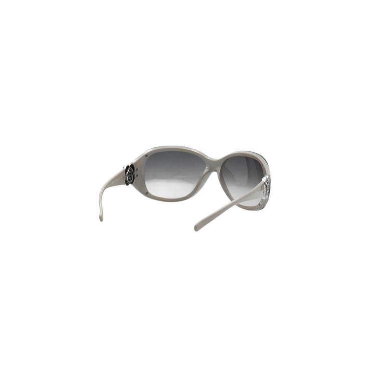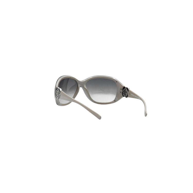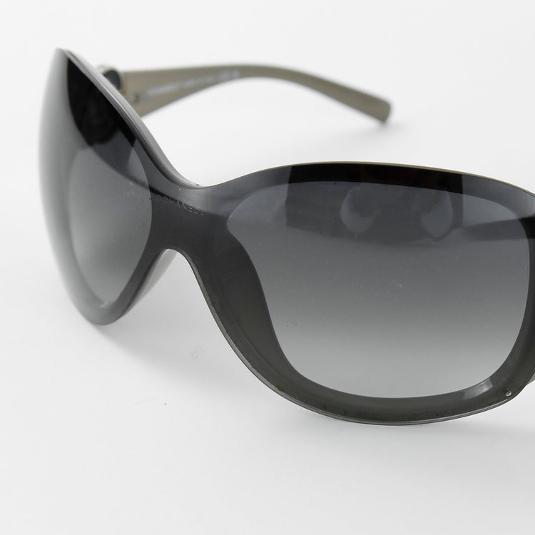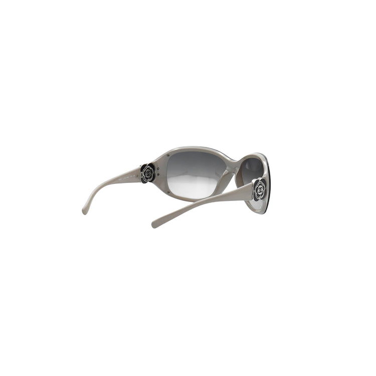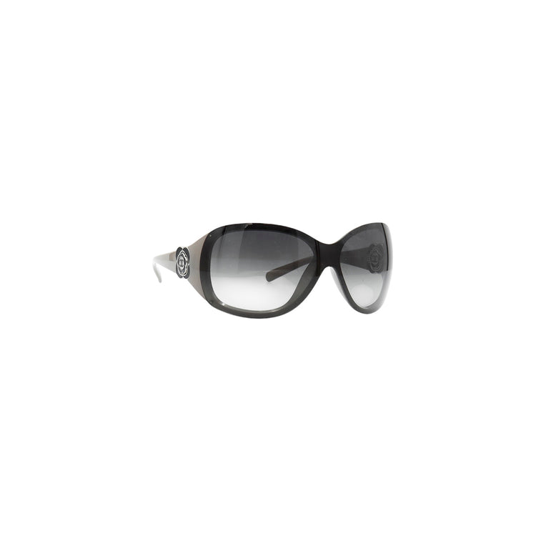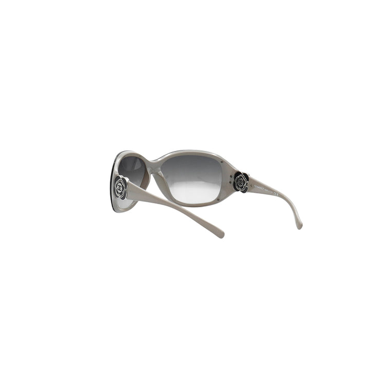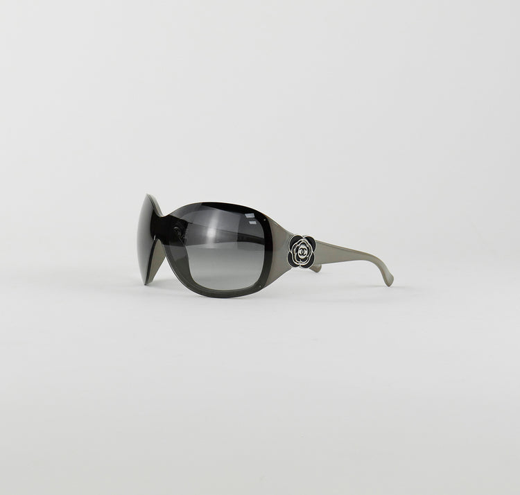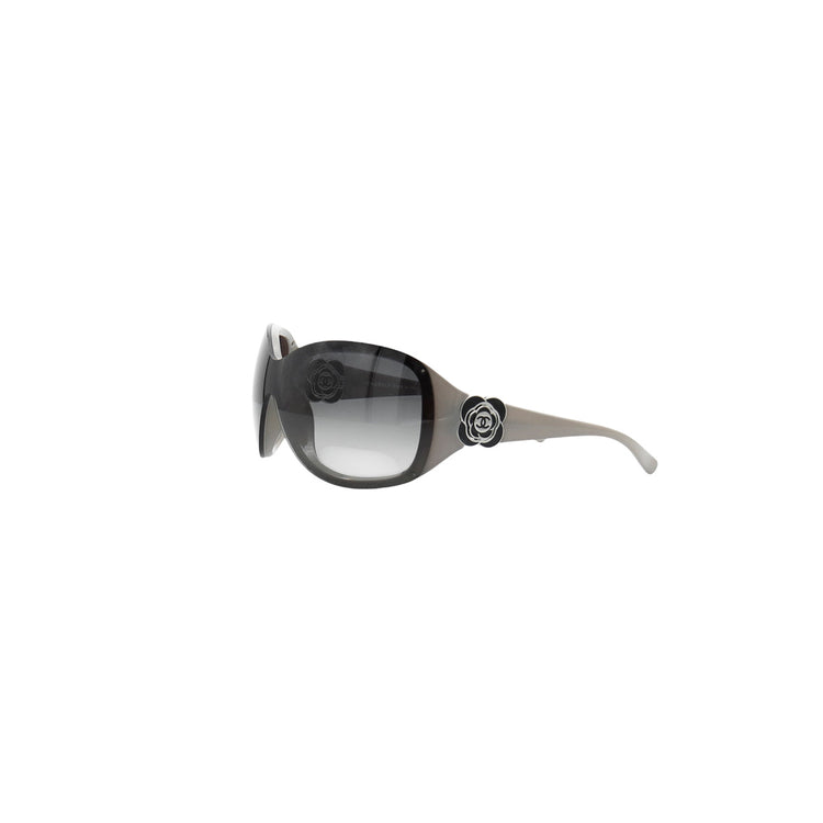 Gafas de sol de la marca Chanel, modelo 6032 Camelia, fabricadas en acrílico gris con aplicaciones metálicas, y micas color humo, folio: KC5087396, poco sucias con ligeros rayones casi imperceptibles.