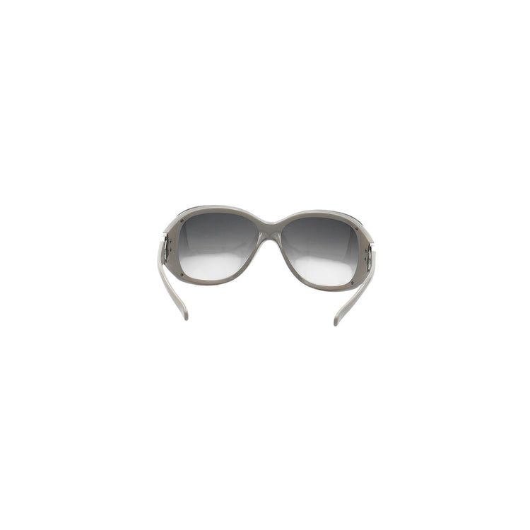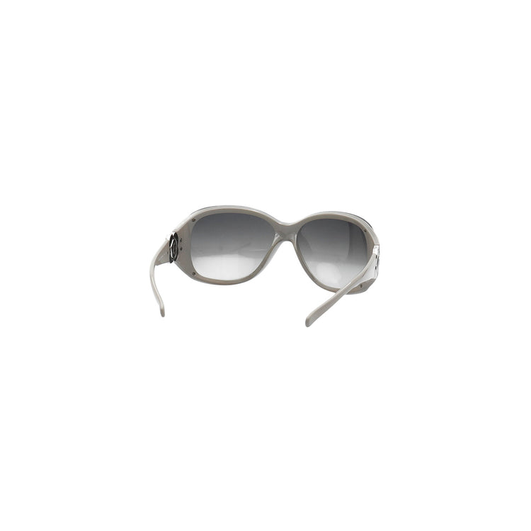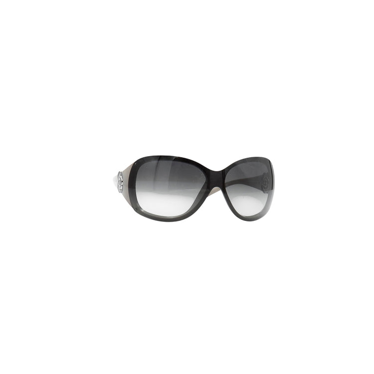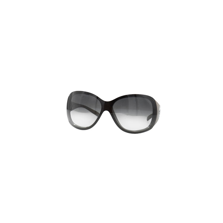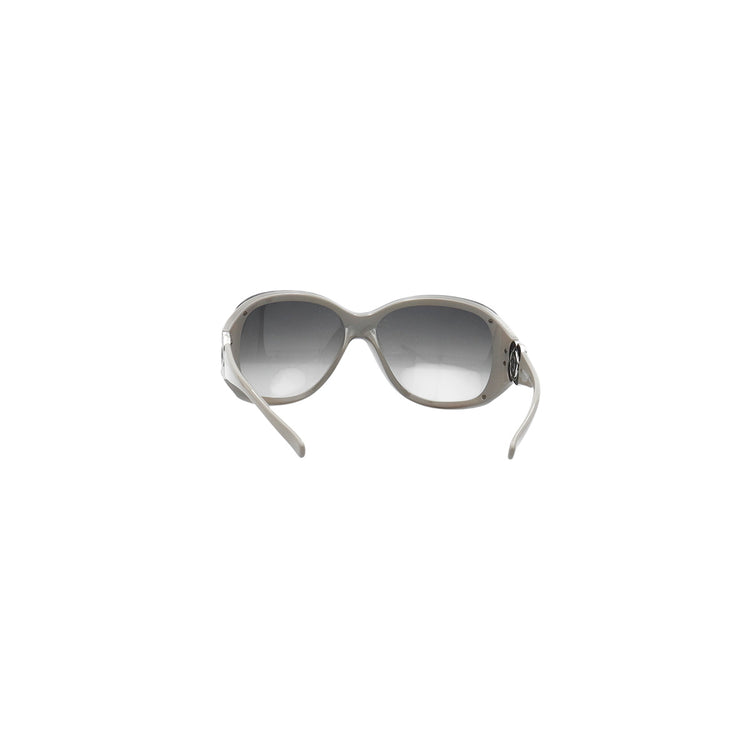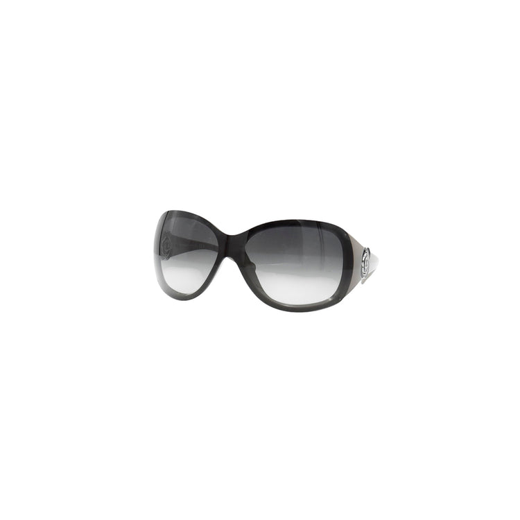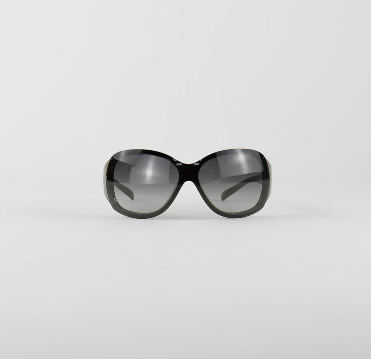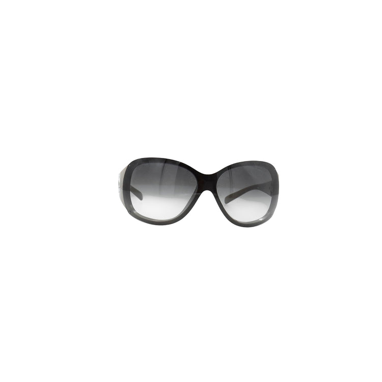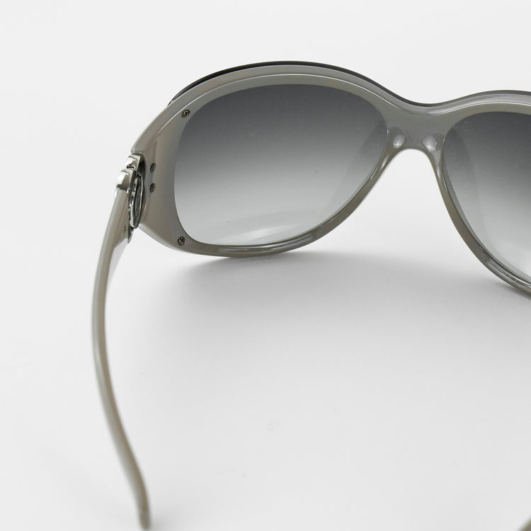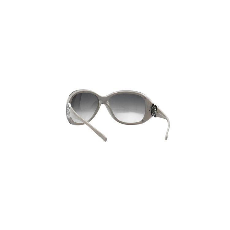 Gafas de sol de la marca Chanel, modelo 6032 Camelia, fabricadas en acrílico gris con aplicaciones metálicas, y micas color humo, folio: KC5087396, poco sucias con ligeros rayones casi imperceptibles.