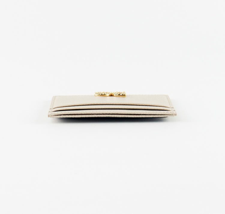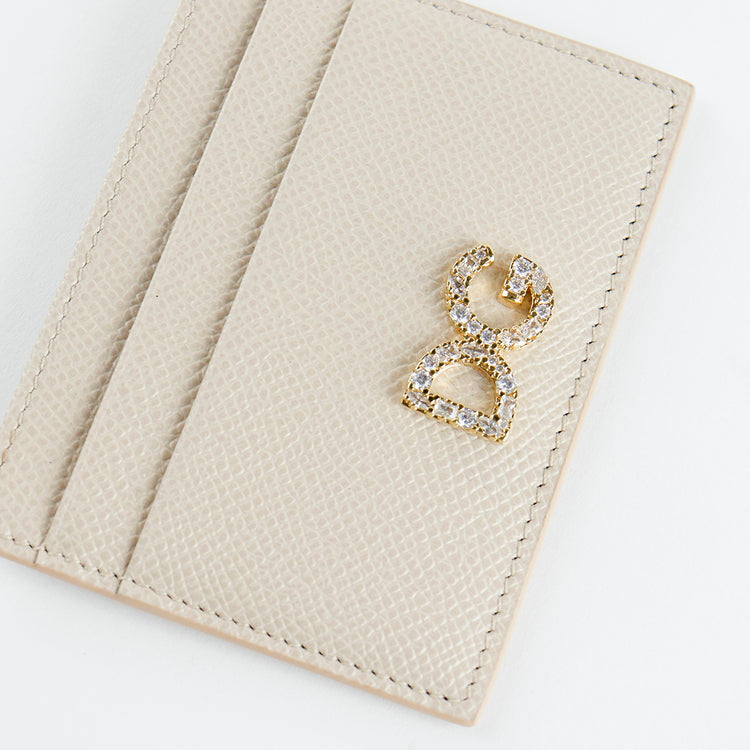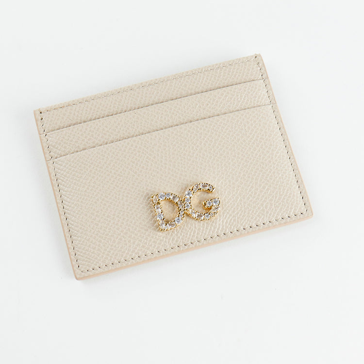 Tarjetero Dolce & Gabbana de piel granulada color beige con el distintivo logo DG en color dorado adornado con cristales.
