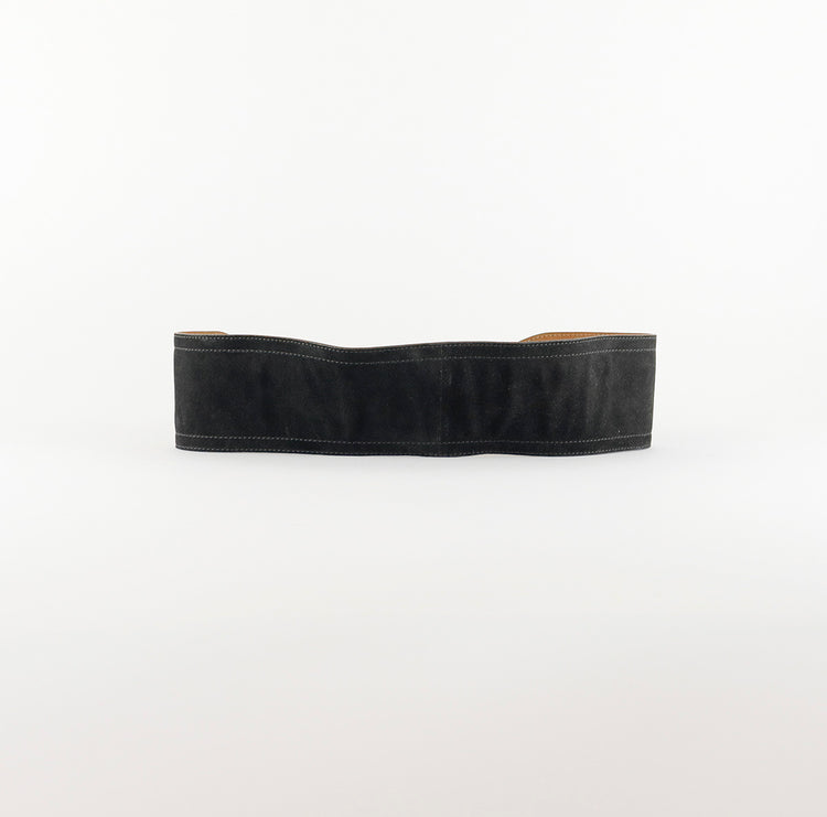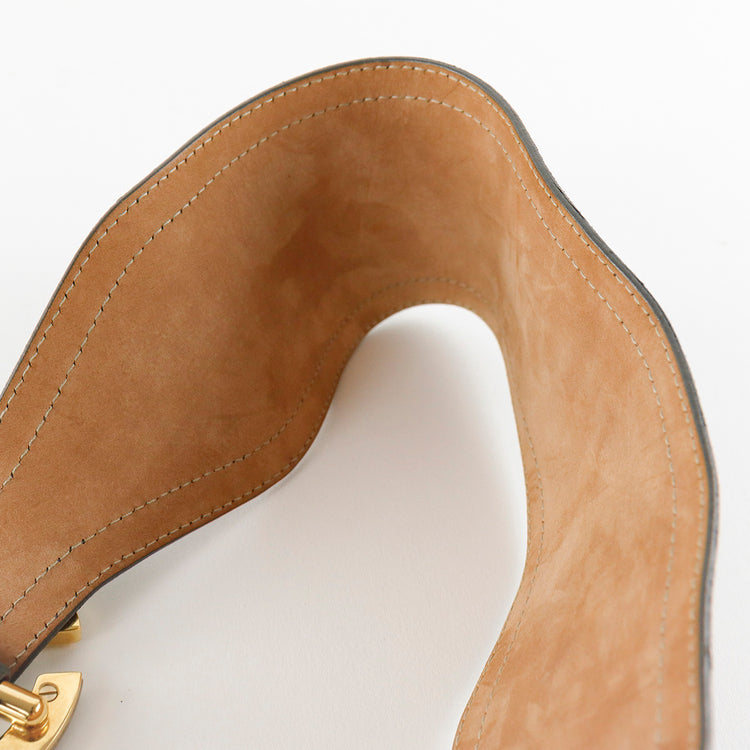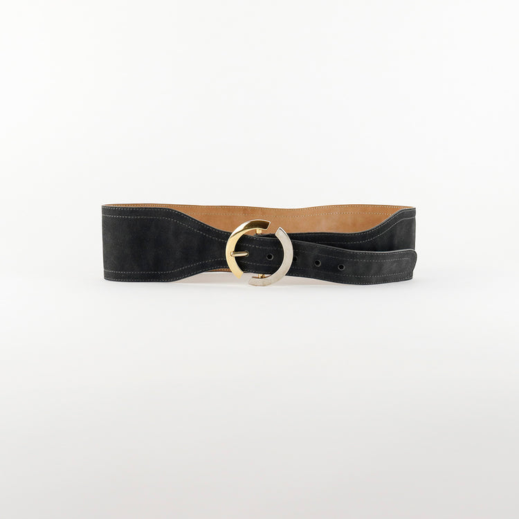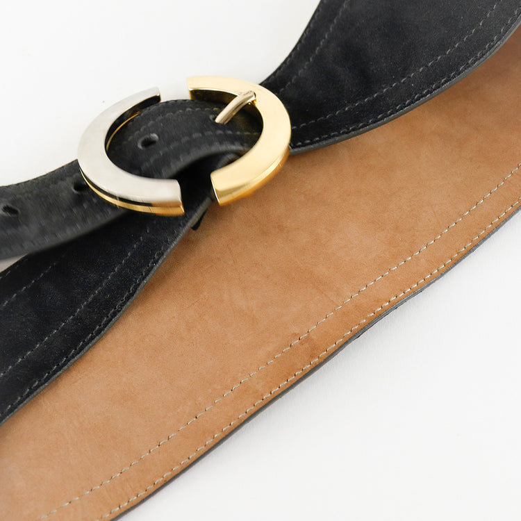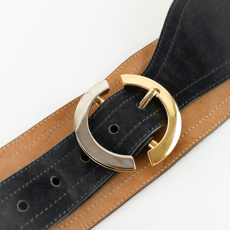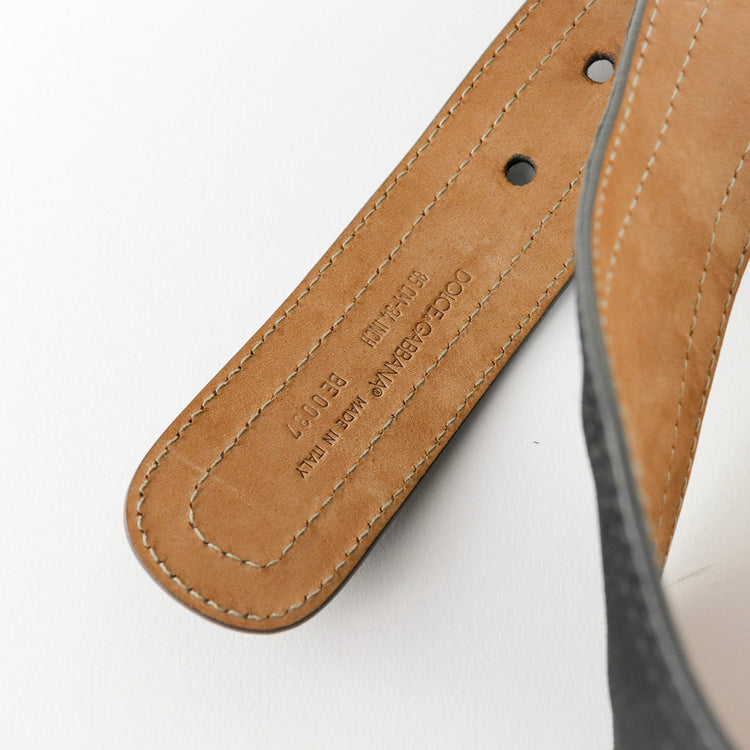 Cinturón a la cadera Dolce Gabbana confeccionado en gamuza color gris, con forro en cuero nude, hebilla metalizada bicolor.