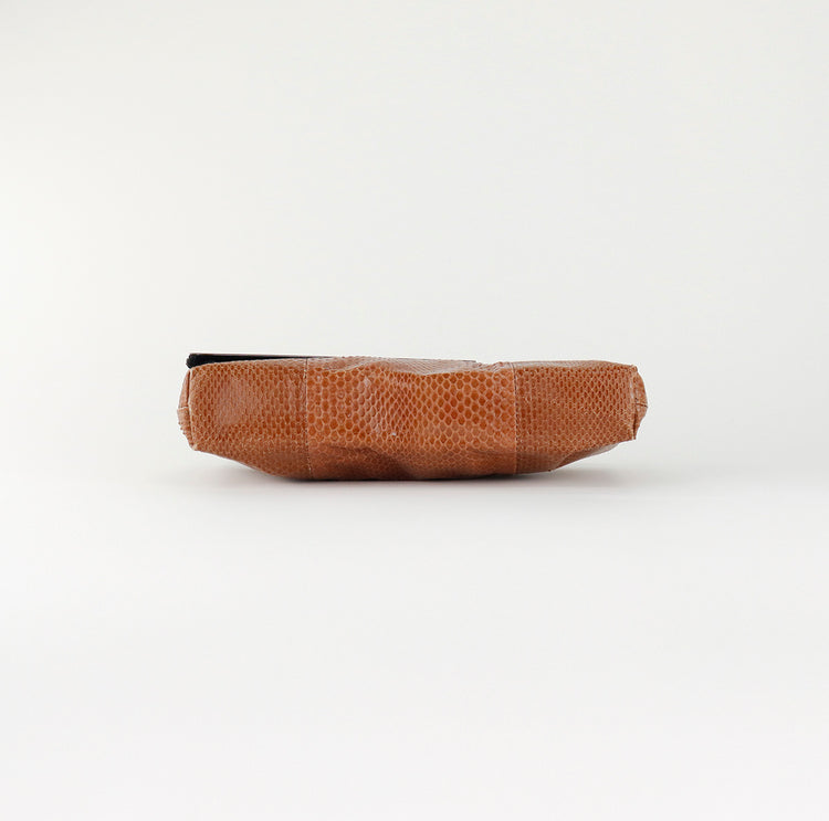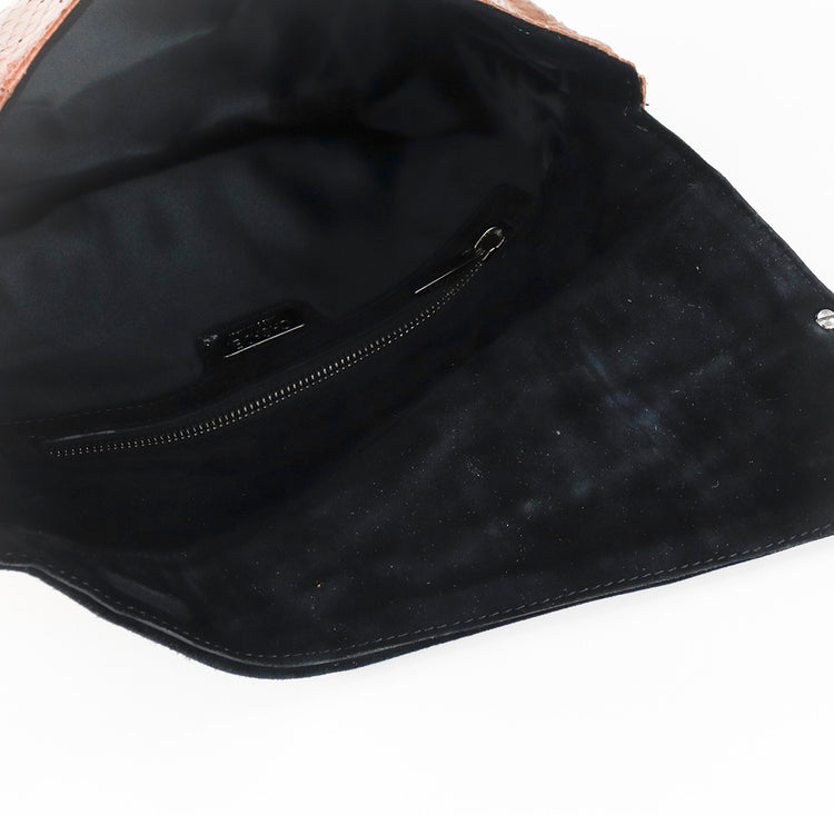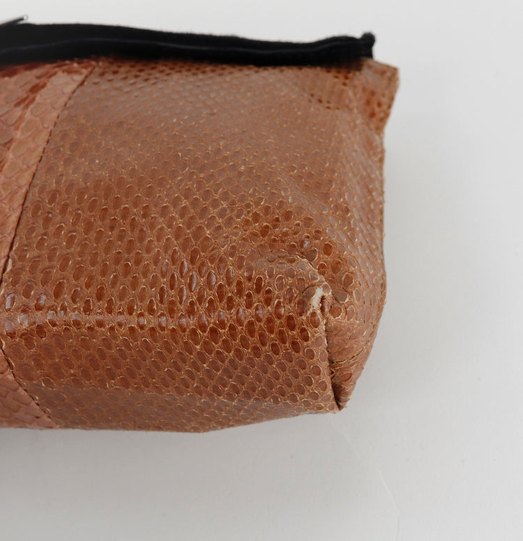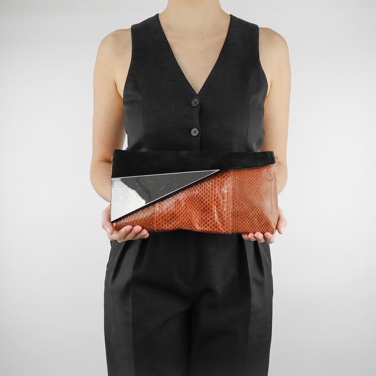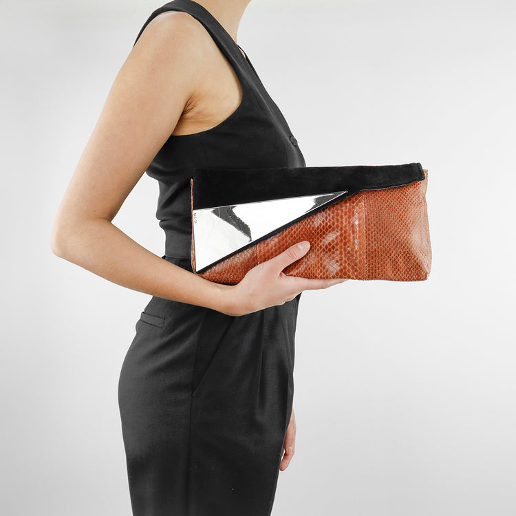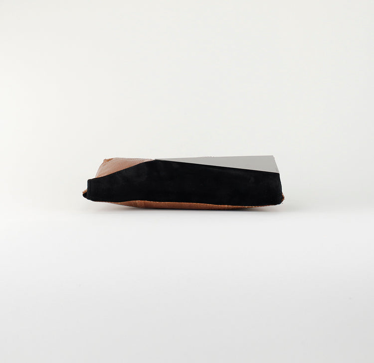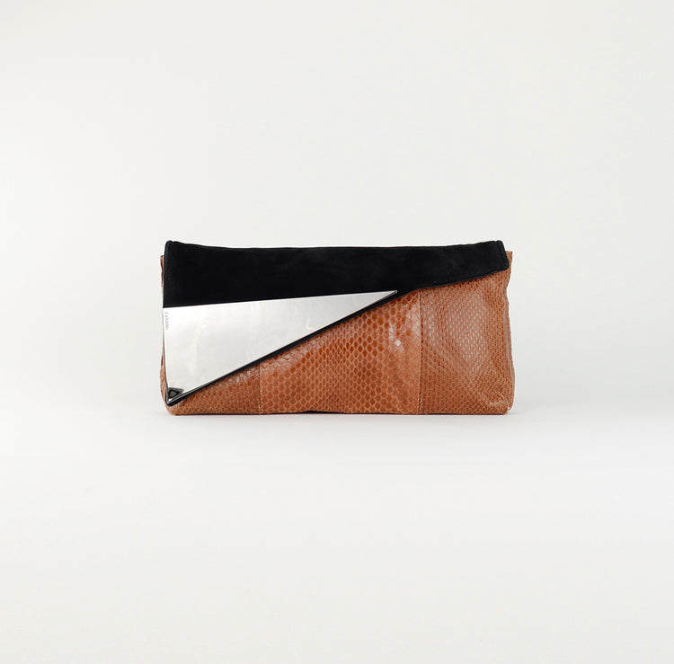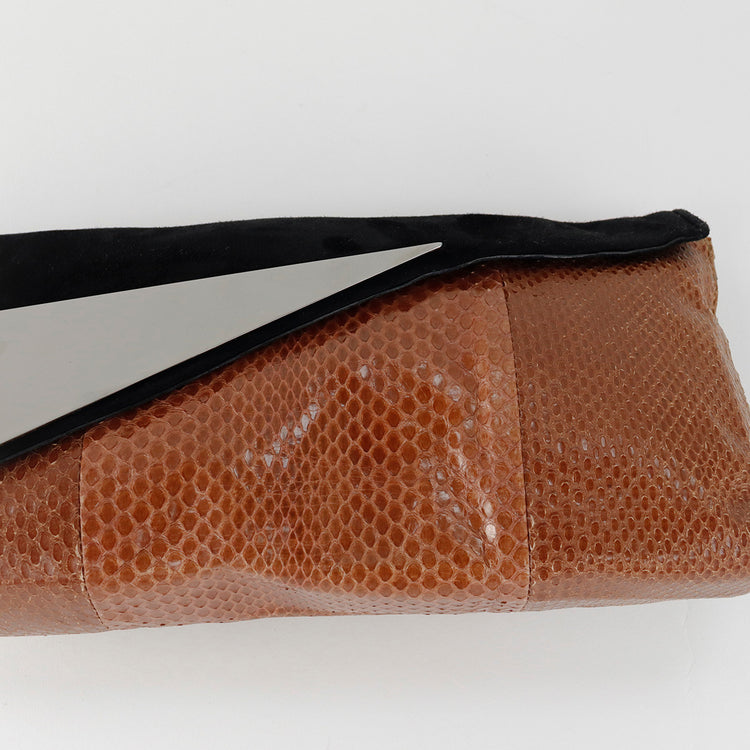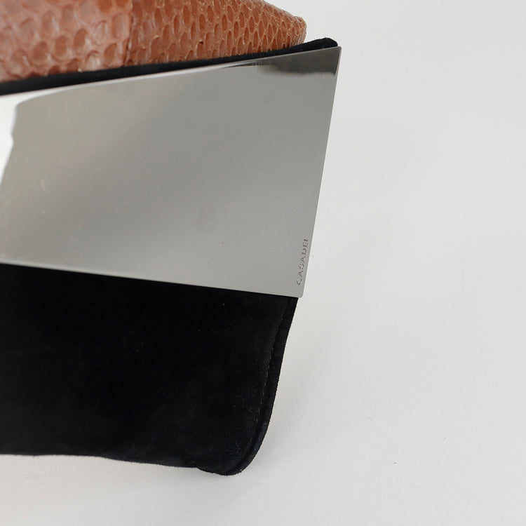 Bolso tipo clutch de la marca Casadei, confeccionado en piel exótica color café con solapa en gamuza color negro, forro interno de nylon, placa espejo con el grabado de la marca en la solapa, marcas de uso.