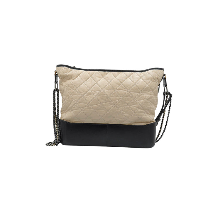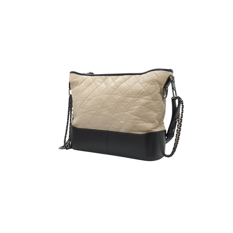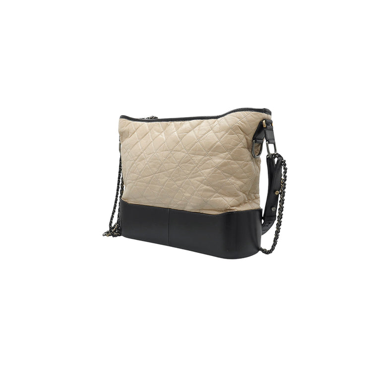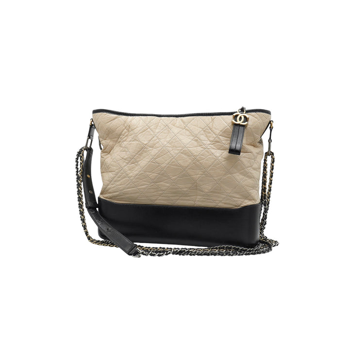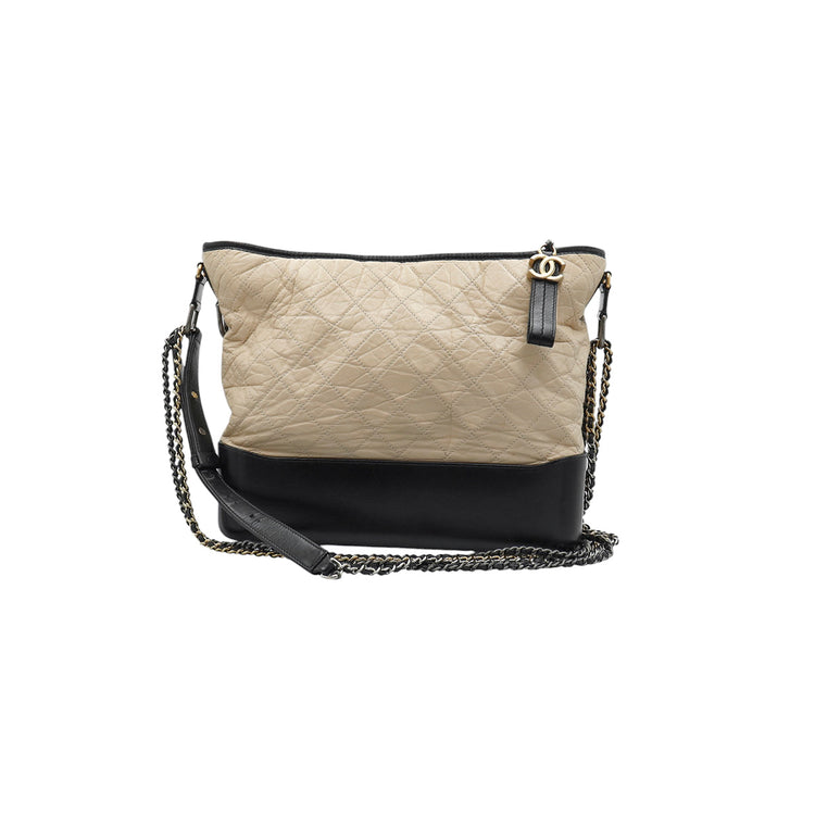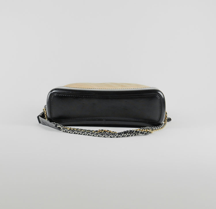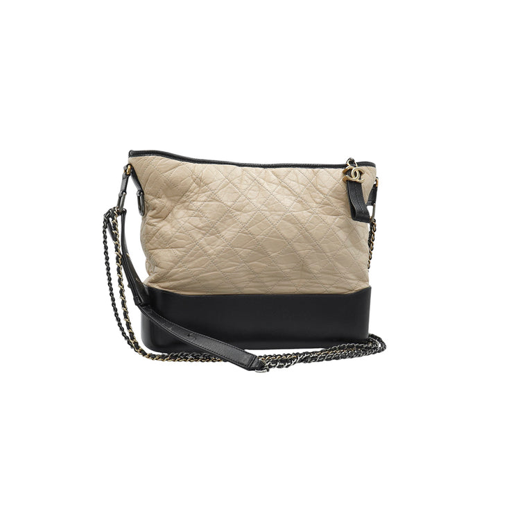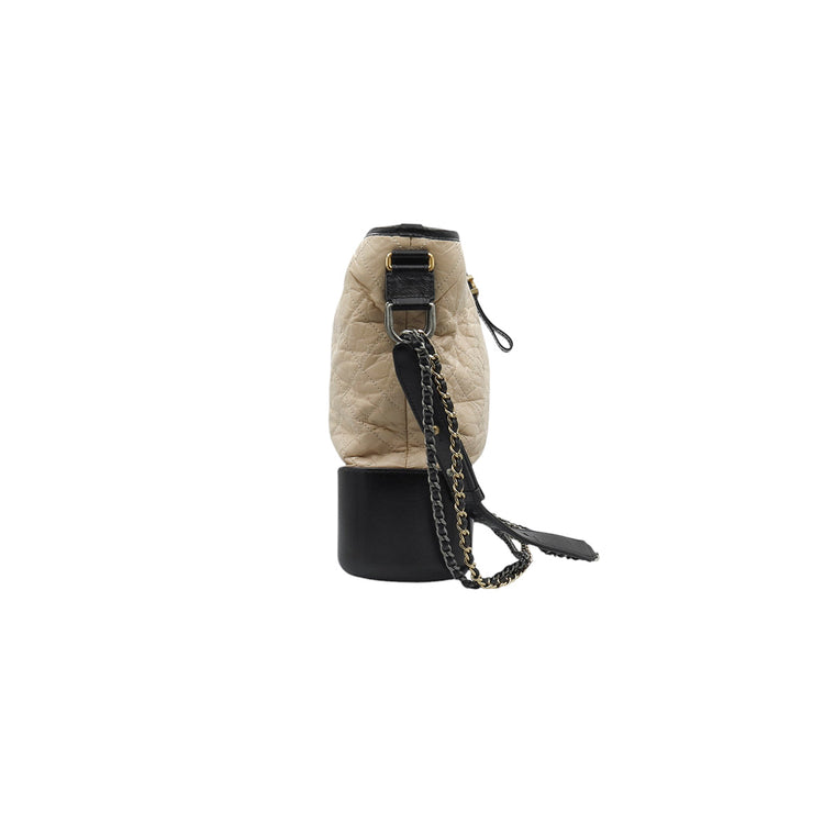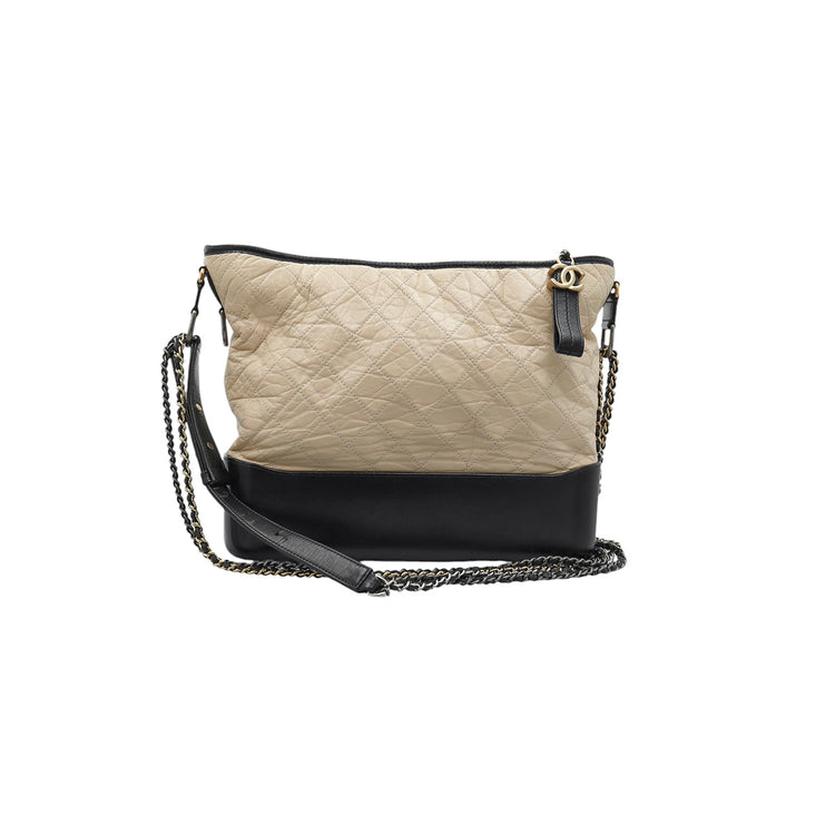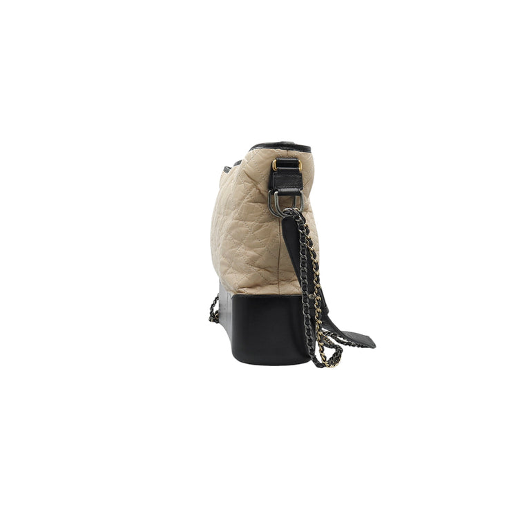 Bolso Chanel modelo Gabrielle, confeccionado en piel de cordero color beige con base rígida y ribetes color negro, herrajes en tono bicolor y forro interno en textil rojo, con poco desgaste.