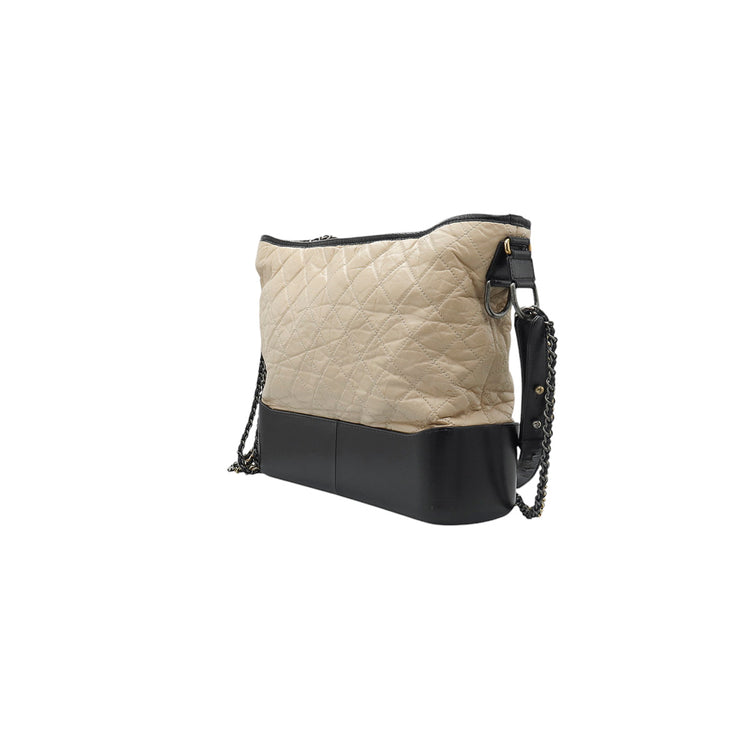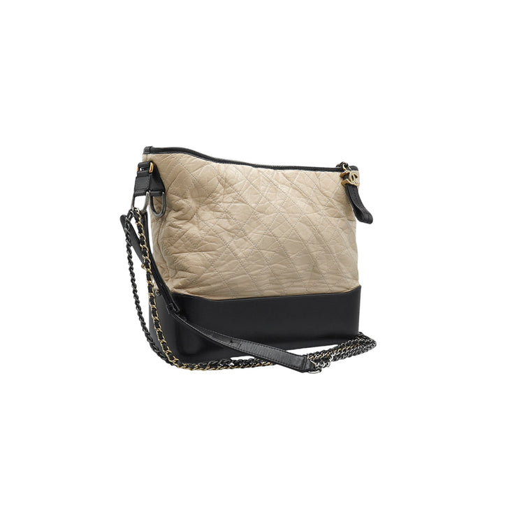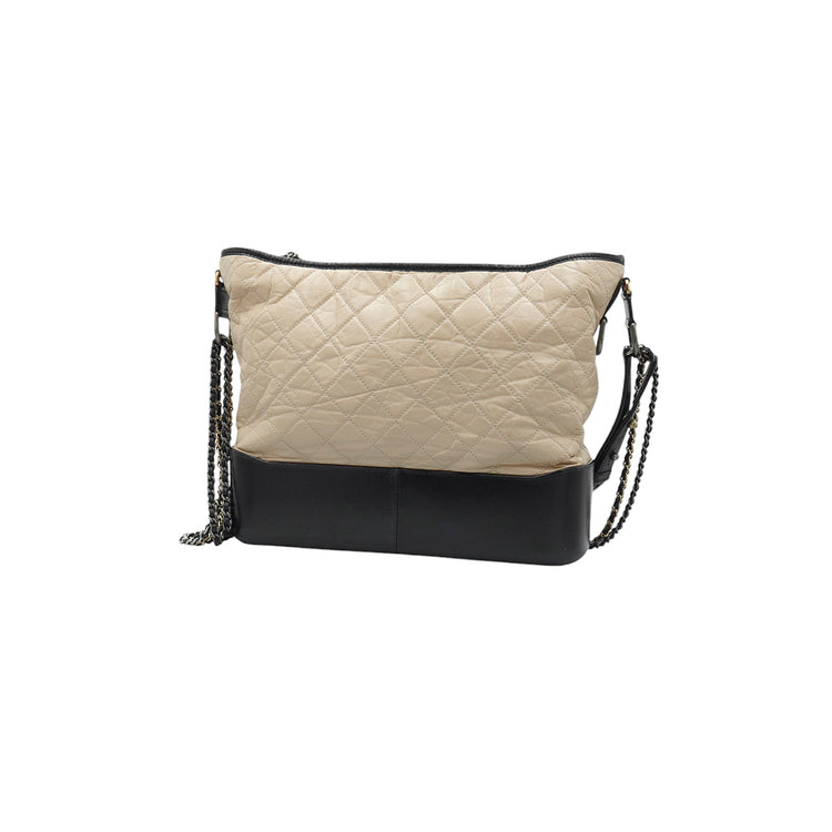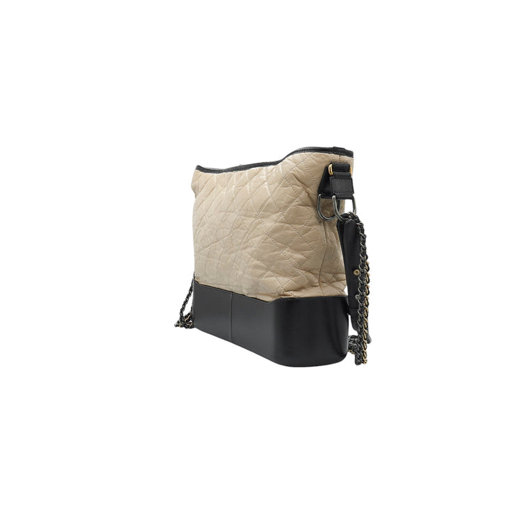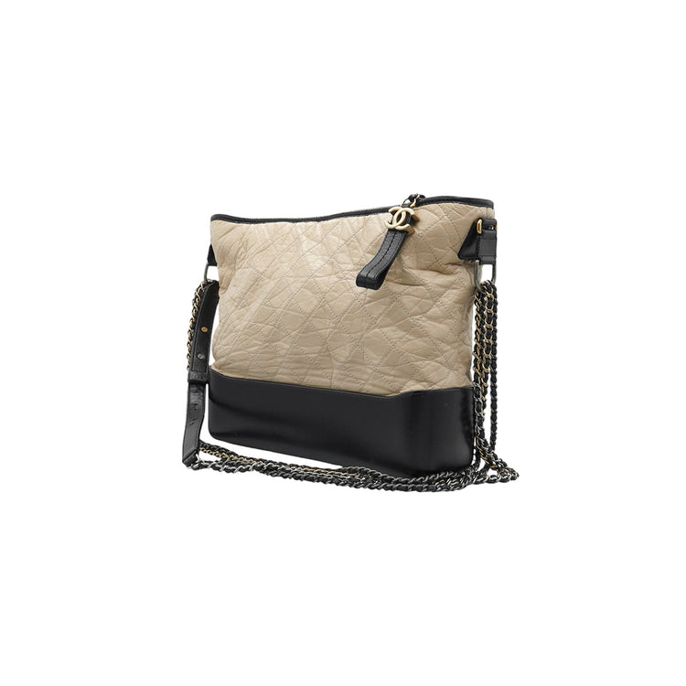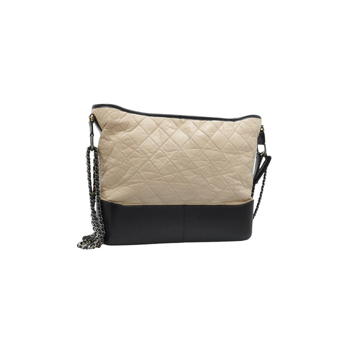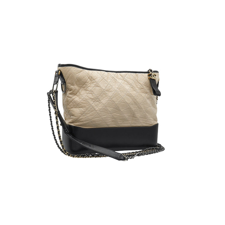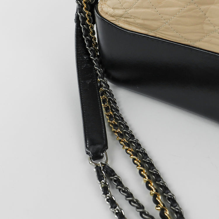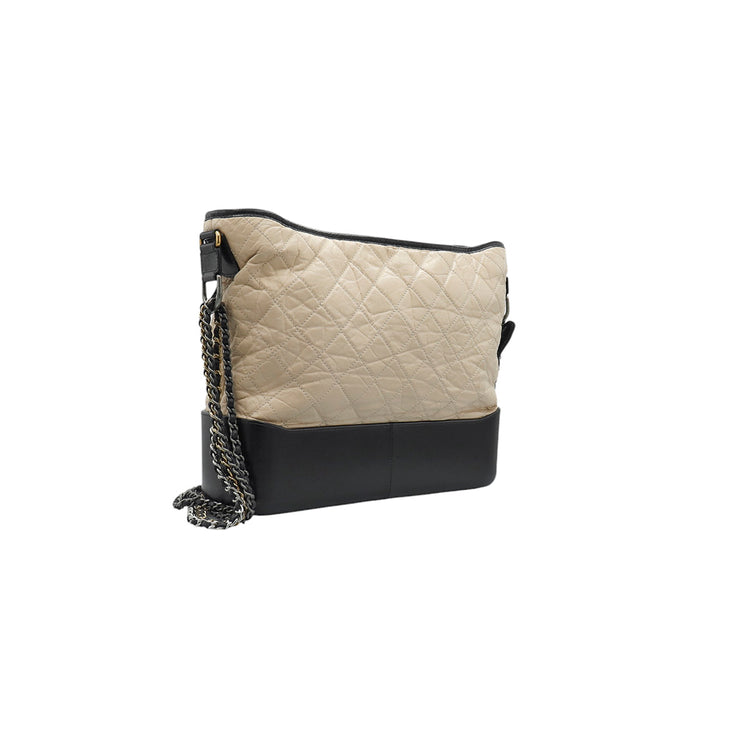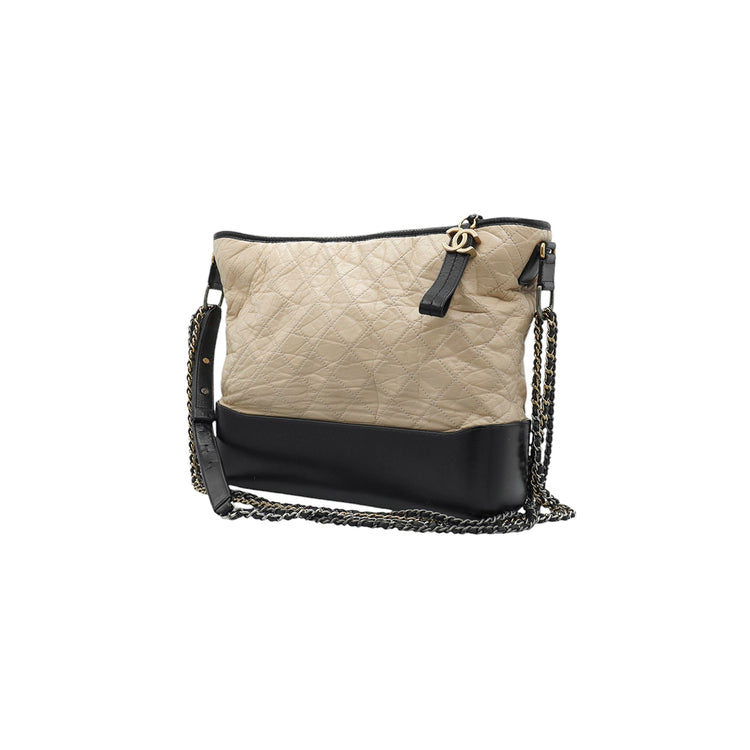 Bolso Chanel modelo Gabrielle, confeccionado en piel de cordero color beige con base rígida y ribetes color negro, herrajes en tono bicolor y forro interno en textil rojo, con poco desgaste.