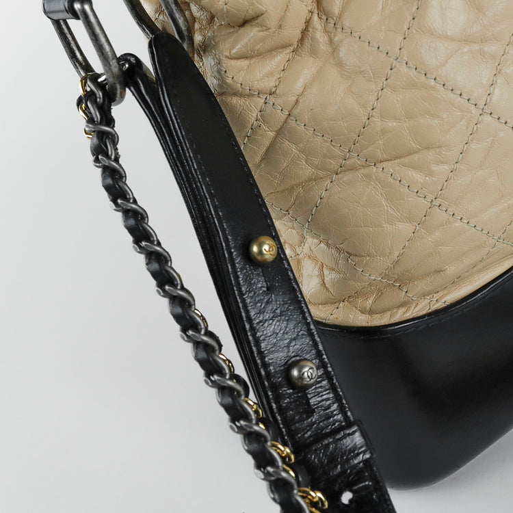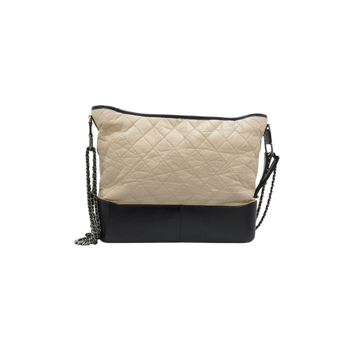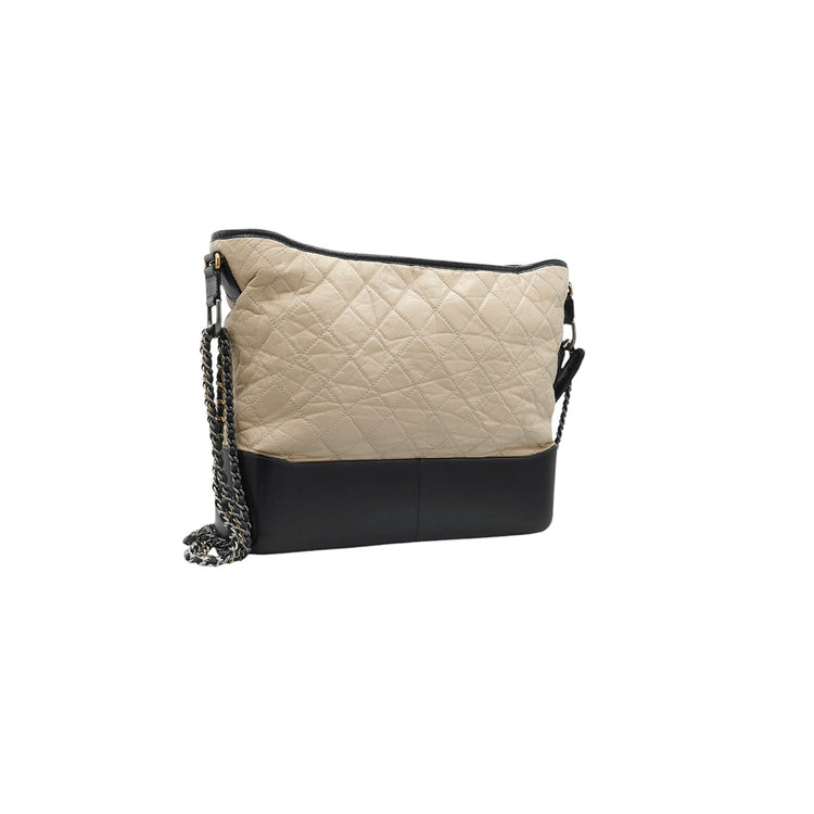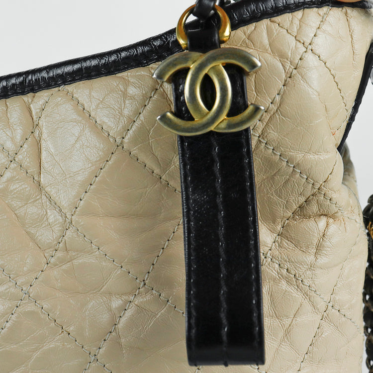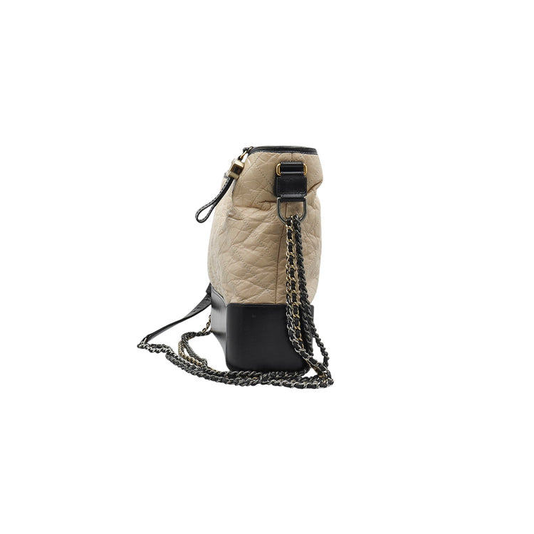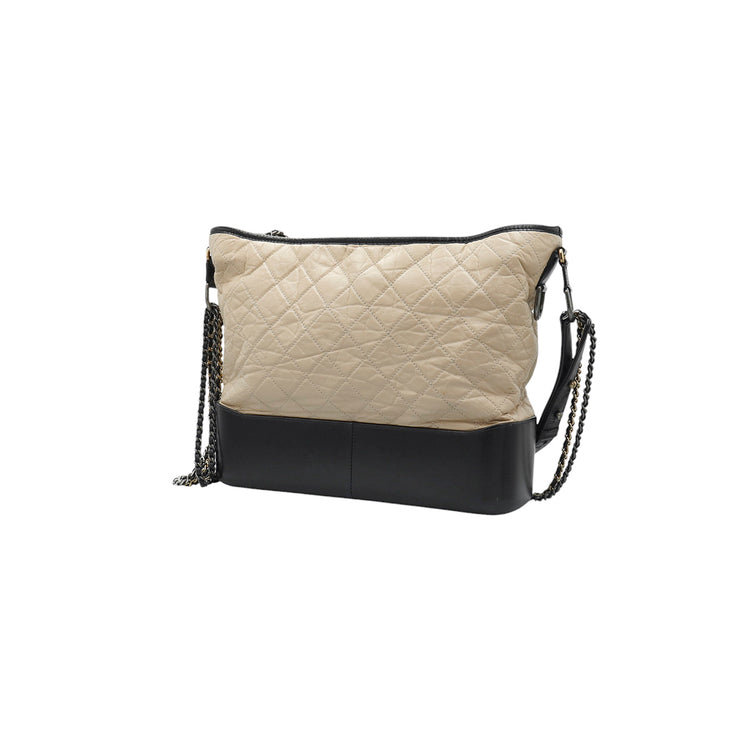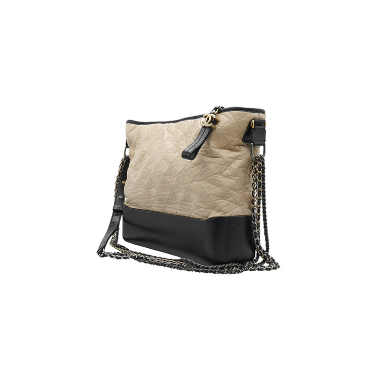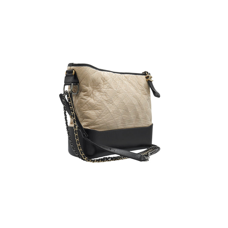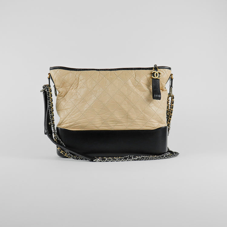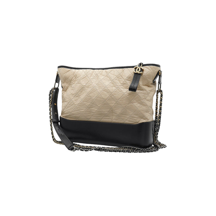 Bolso Chanel modelo Gabrielle, confeccionado en piel de cordero color beige con base rígida y ribetes color negro, herrajes en tono bicolor y forro interno en textil rojo, con poco desgaste.