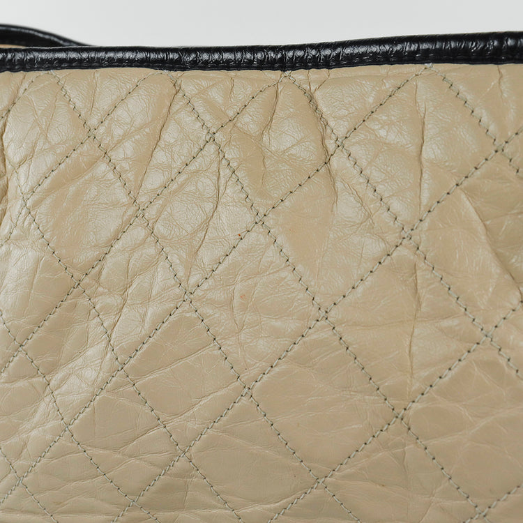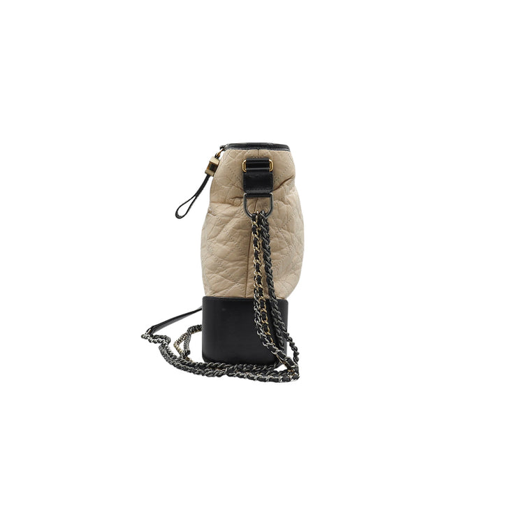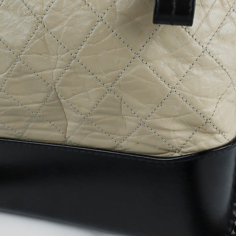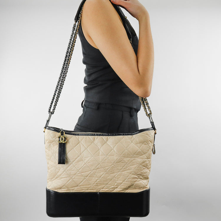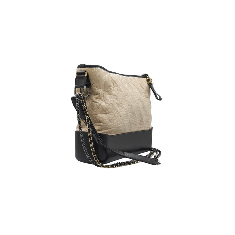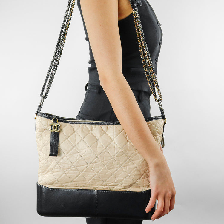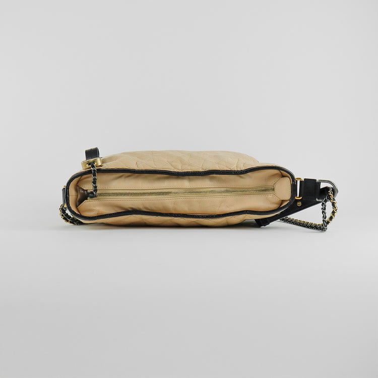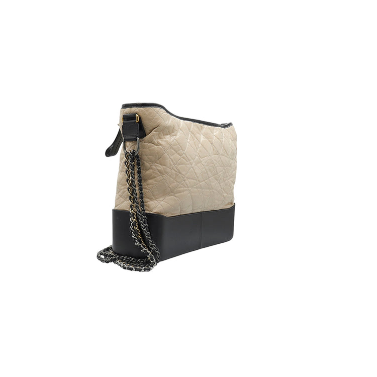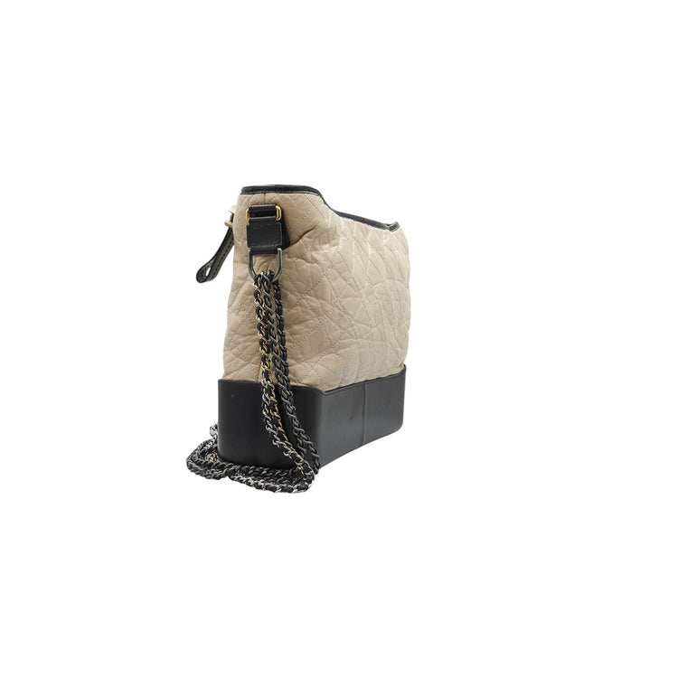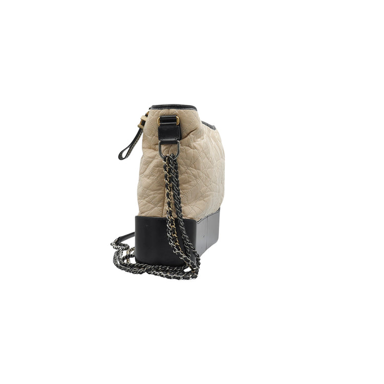 Bolso Chanel modelo Gabrielle, confeccionado en piel de cordero color beige con base rígida y ribetes color negro, herrajes en tono bicolor y forro interno en textil rojo, con poco desgaste.