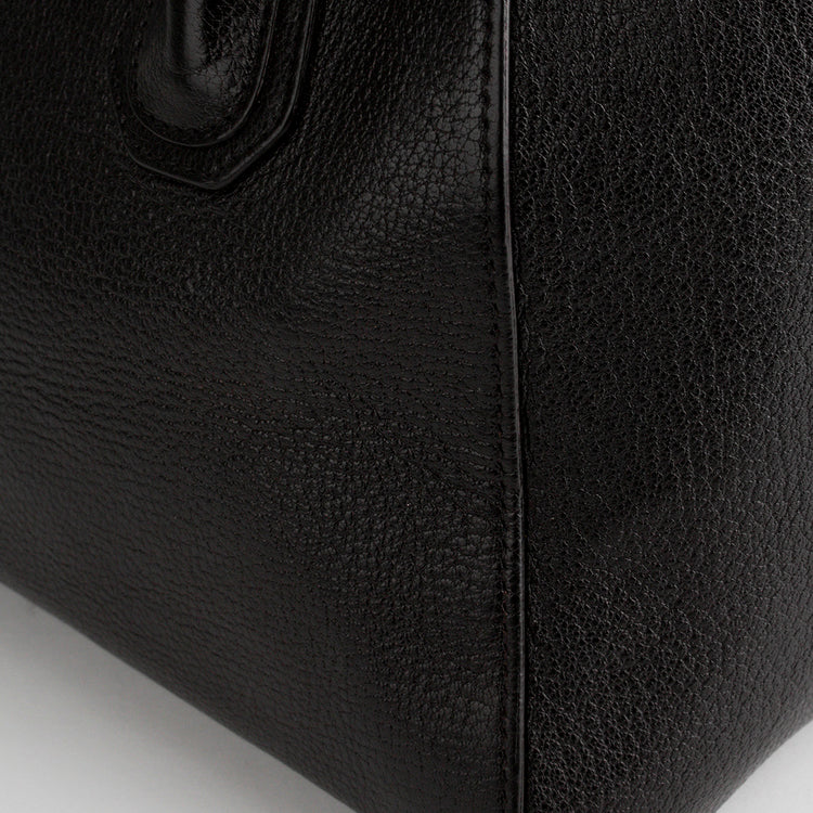 Bolso Givenchy Antígona, confeccionado en piel granulada de cabra color negro, con dos asas y bandolera ajustable para usar al hombro o cruzada, logotipo en metal plateado, interior forrado en tela del mismo tono negro , bolsillos planos interiores y cierre tipo cremallera.