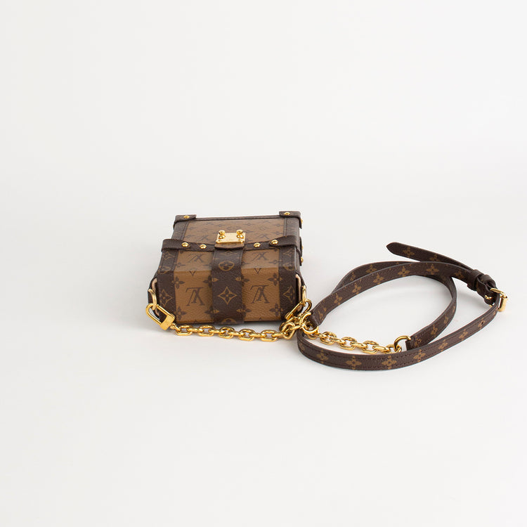 Bolso Crossbody Louis Vuitton Vertical Trunk Pochette, confeccionado en canvas monogram, con correa de cadena con piel, herrajes en color dorado.