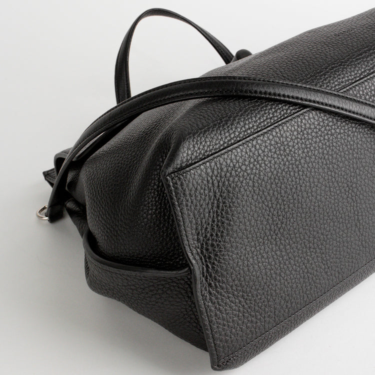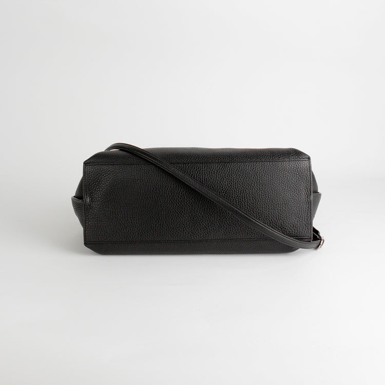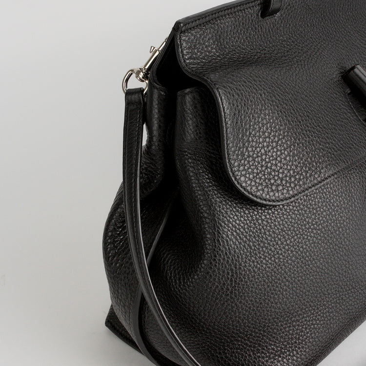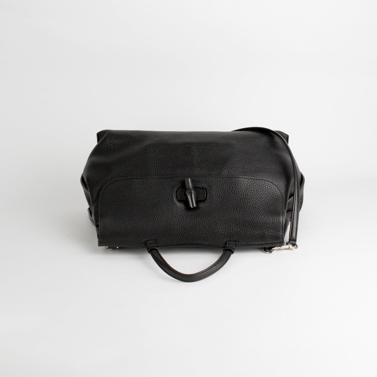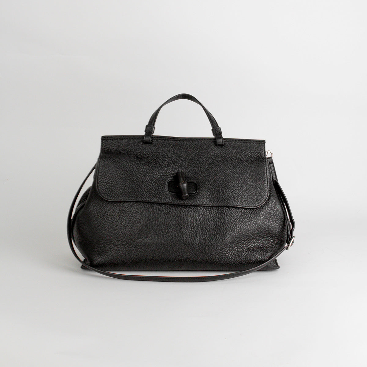 Bolso de Hombro Gucci de la línea Bamboo, elaborado en piel negra, finamente confeccionada con ribetes de piel natural, asa superior del mismo material con refuerzos, cierre de solapa con broche giratorio de bambú, interior forrado en tonos pastel con un bolsillo de cremallera y dos bolsillos planos. Bandolera extraíble y ajustable que se puede usar al hombro o cruzada.
