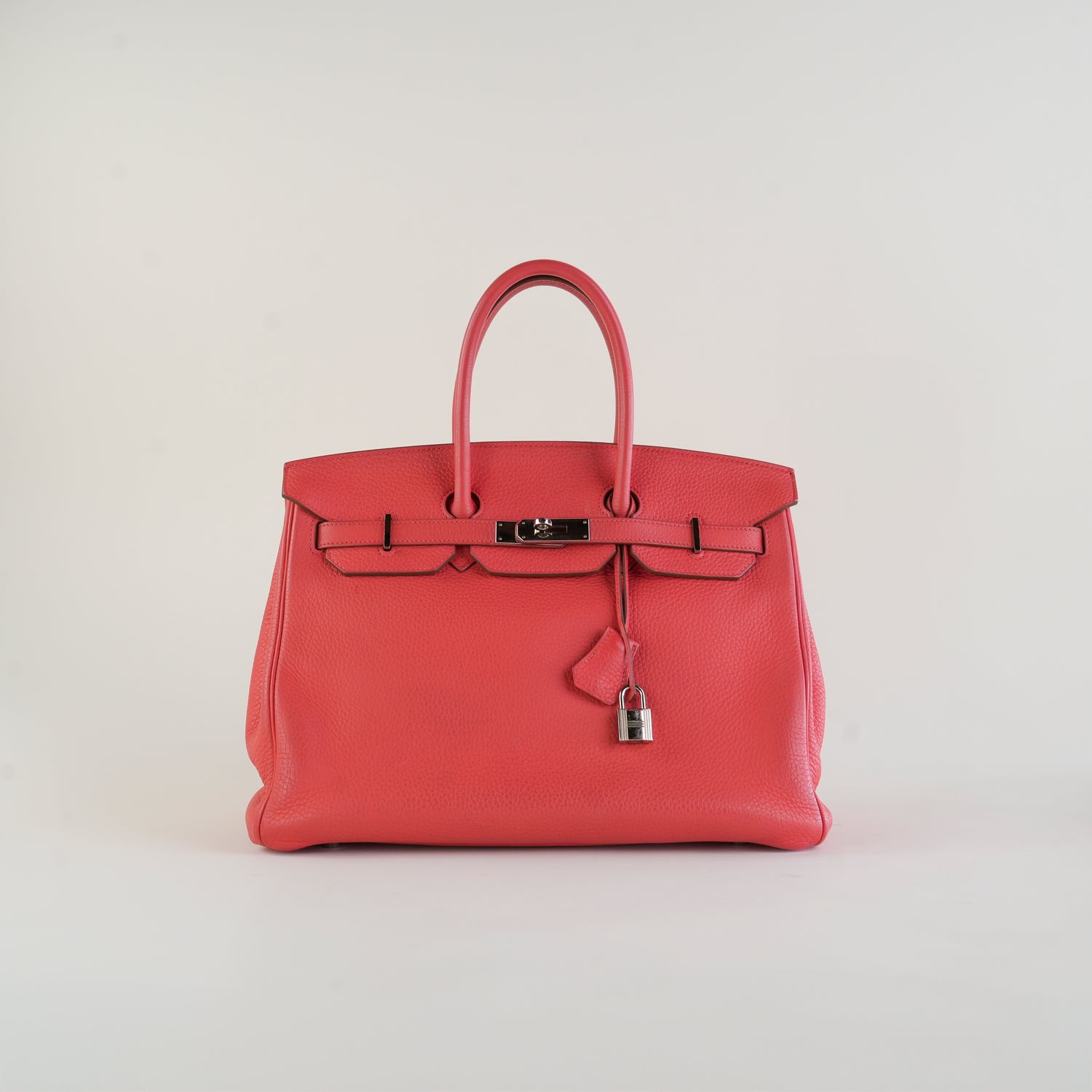 Bolso de Mano Hermès Birkin 35 confeccionado en suave piel de becerro en color coral, con 2 asas rígidas superiores tubulares y solapa al frente, correa con herrajes dorados y tradicional cierre tipo torniquete giratorio, con 2 bolsillos internos, con cierre de cremallera interno en color dorado, cuenta con llave y candado. Leves detalles por uso.