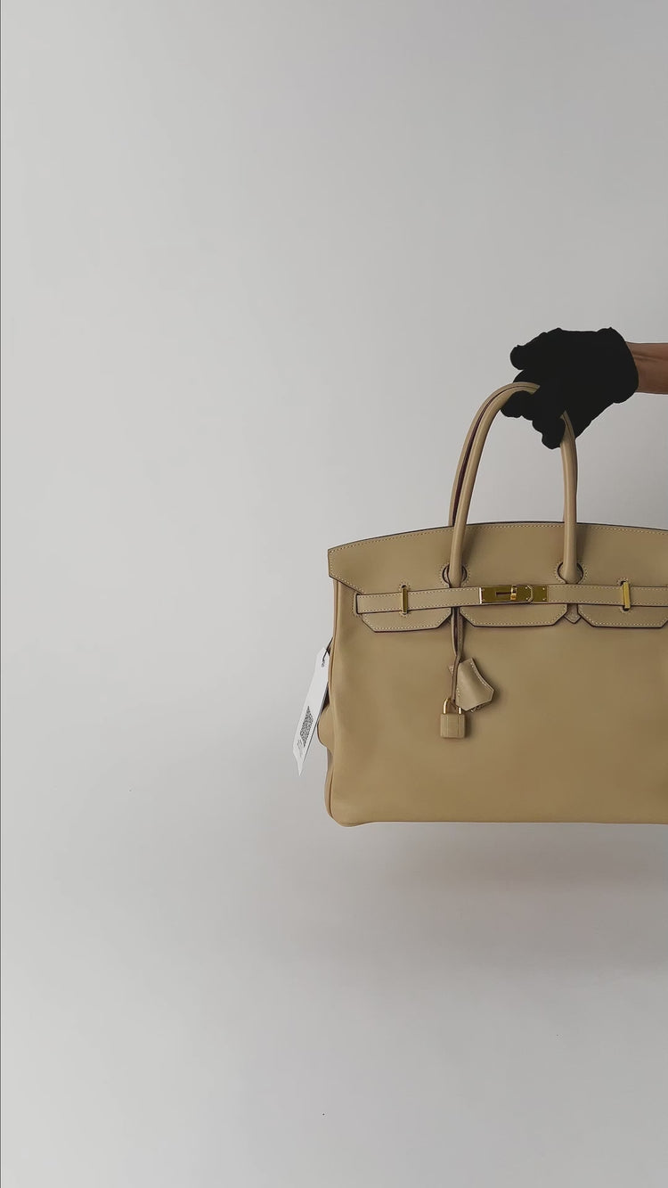 Bolso de mano Hermès Birkin 35 en piel de cordero color beige, con herrajes plateados, candado y llaves. Un ícono de lujo, elegancia y exclusividad.
