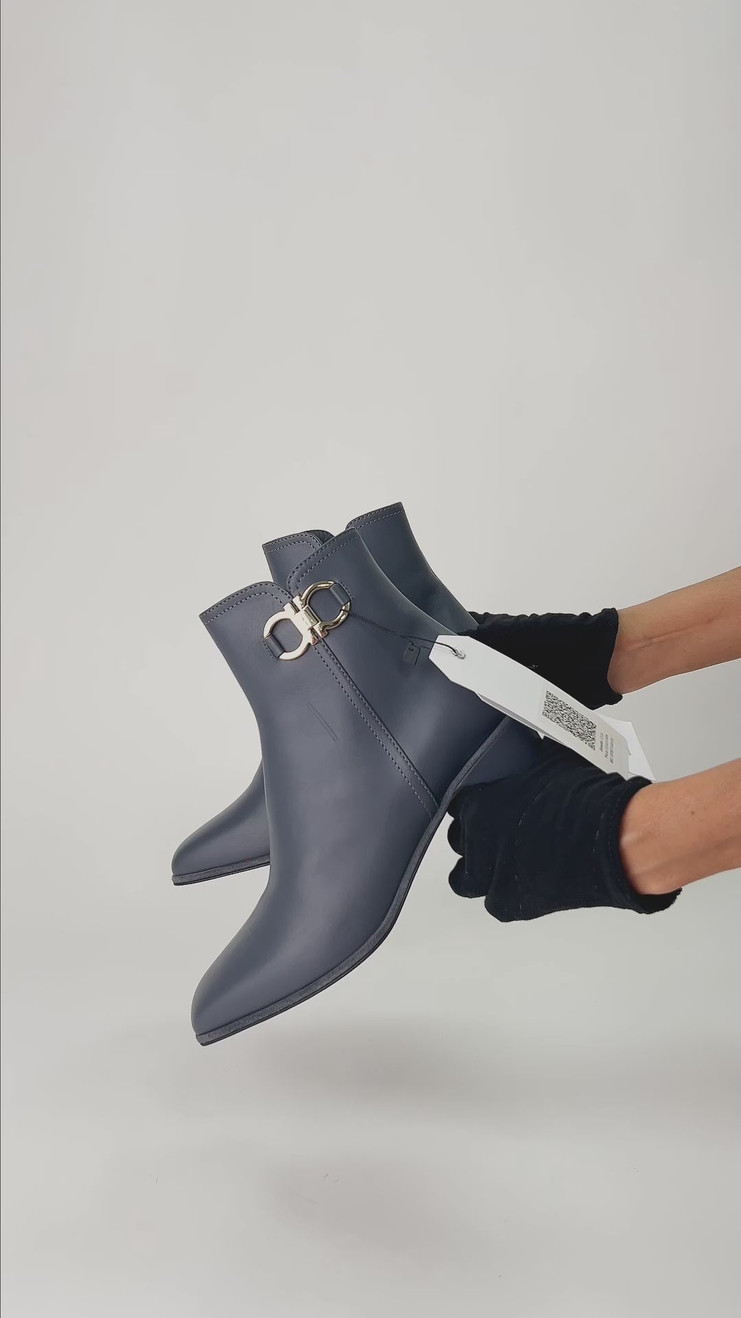 Botines Salvatore Ferragamo en piel color gris, con puntera semicuadrada, cierre lateral y detalle Gancini dorado. Un diseño elegante y sofisticado para uso diario.