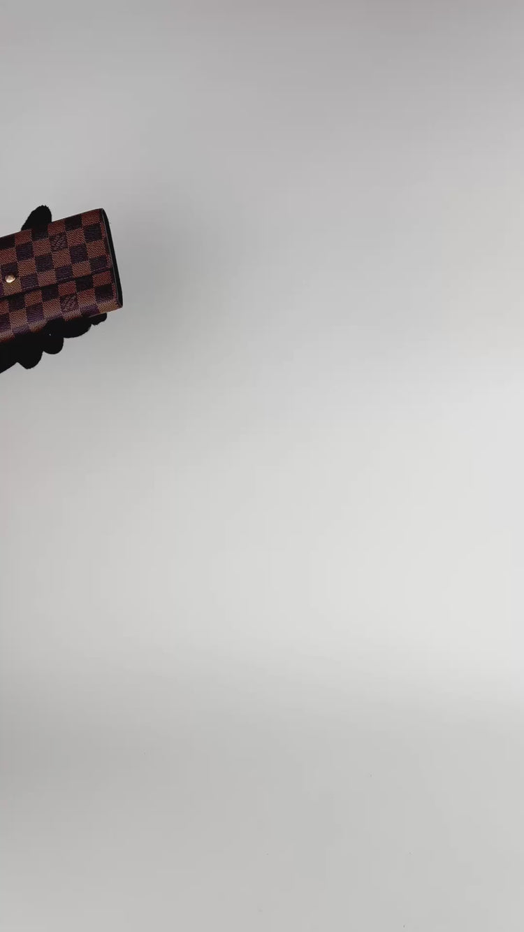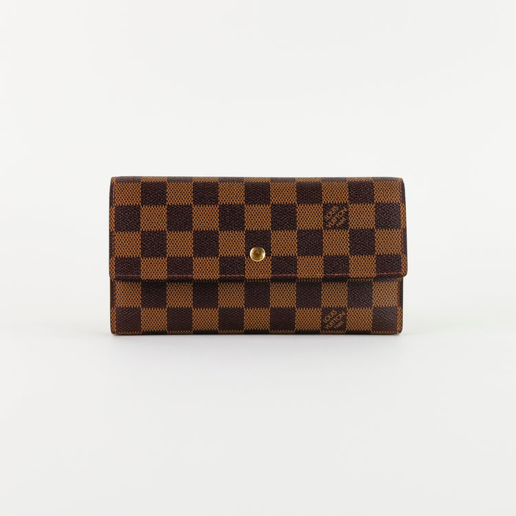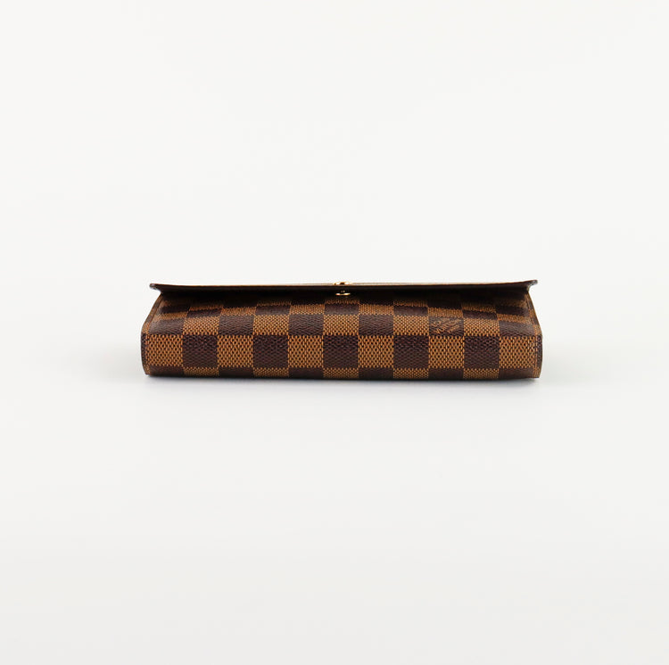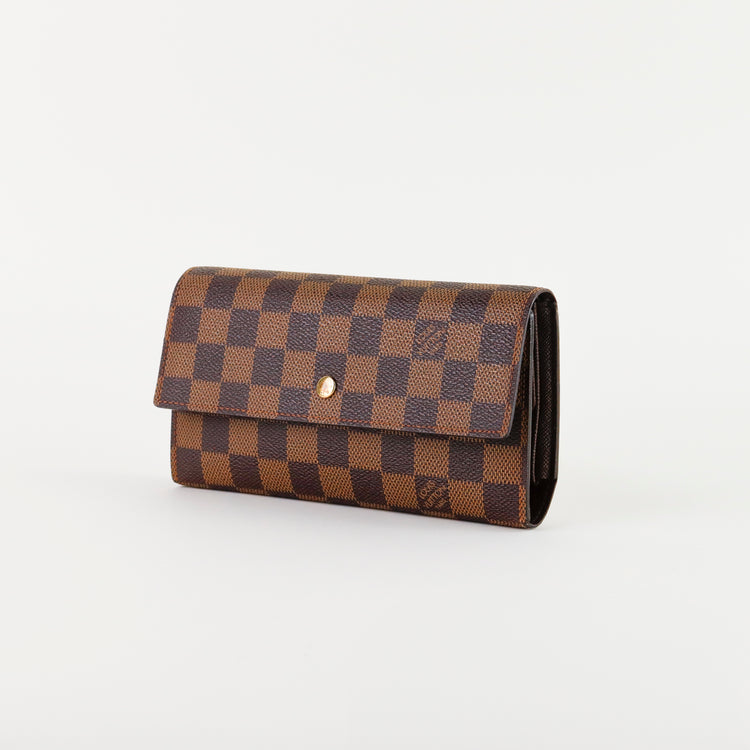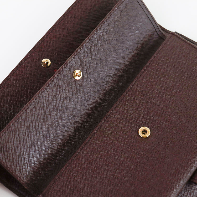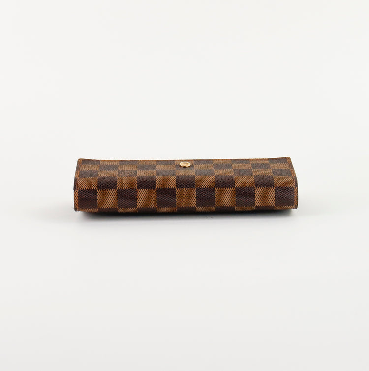 Cartera Louis Vuitton Sarah en lona Damier Ebene color café con broche dorado y compartimentos para tarjetas.