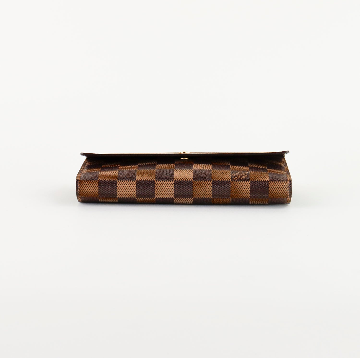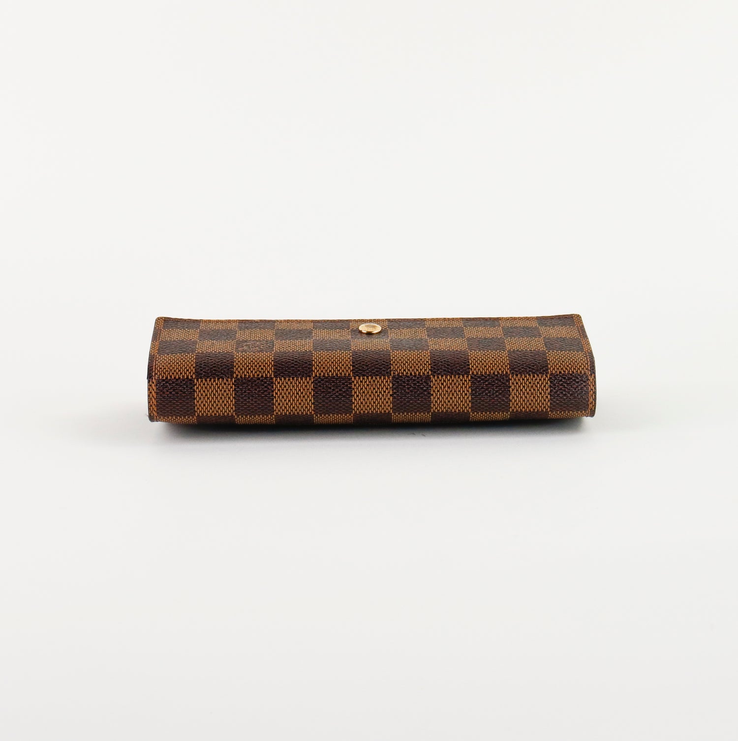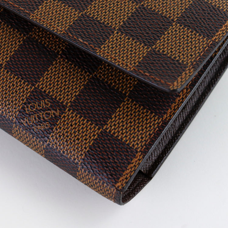 Cartera Louis Vuitton Sarah en lona Damier Ebene color café con broche dorado y compartimentos para tarjetas.