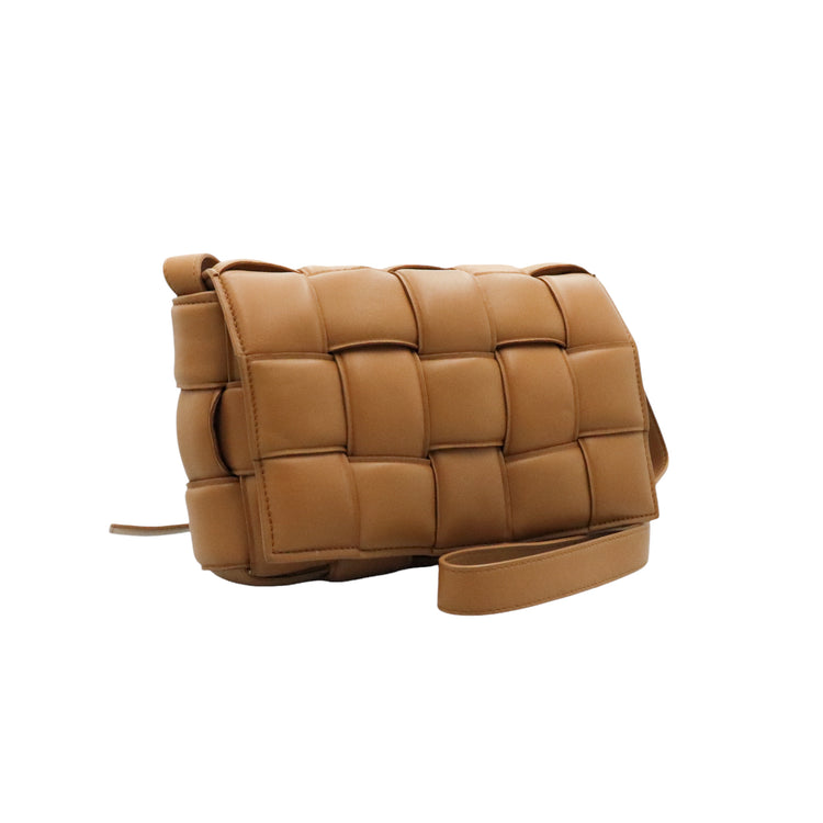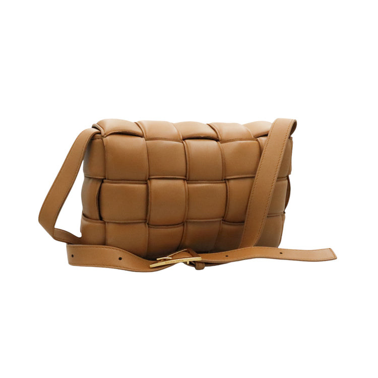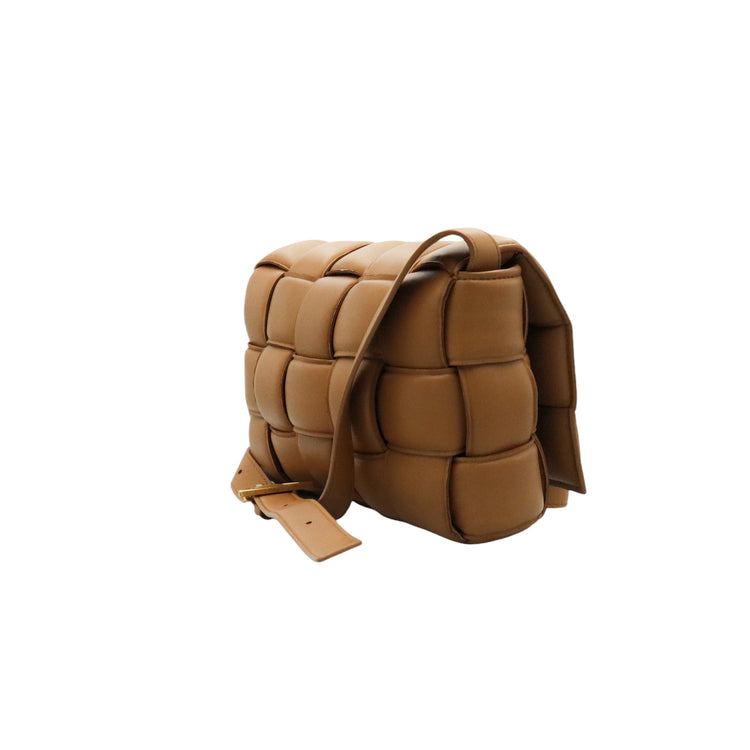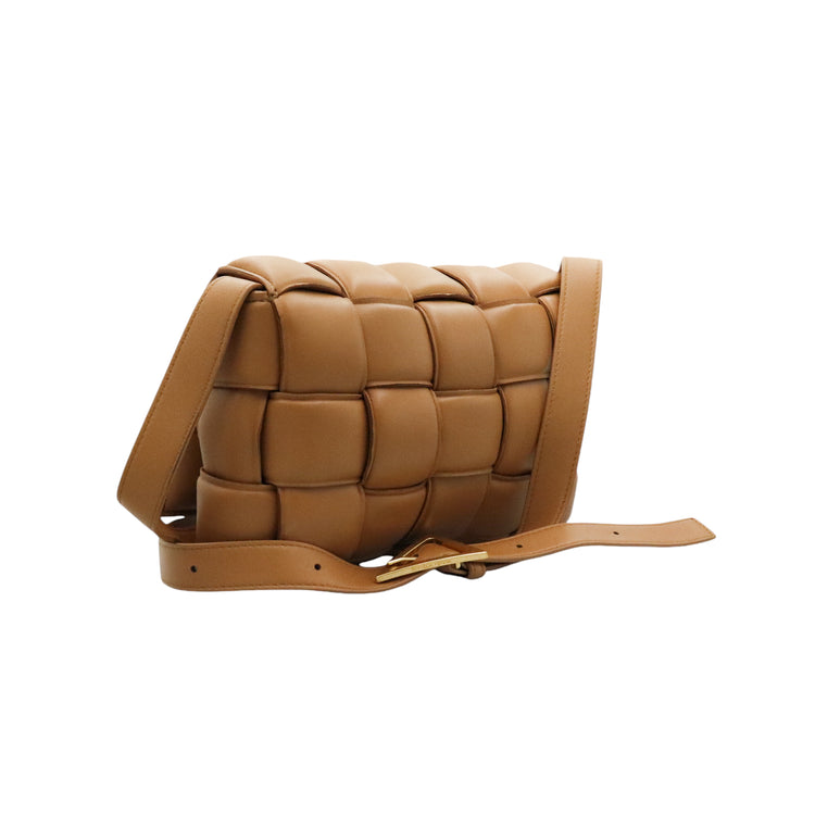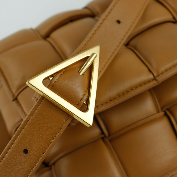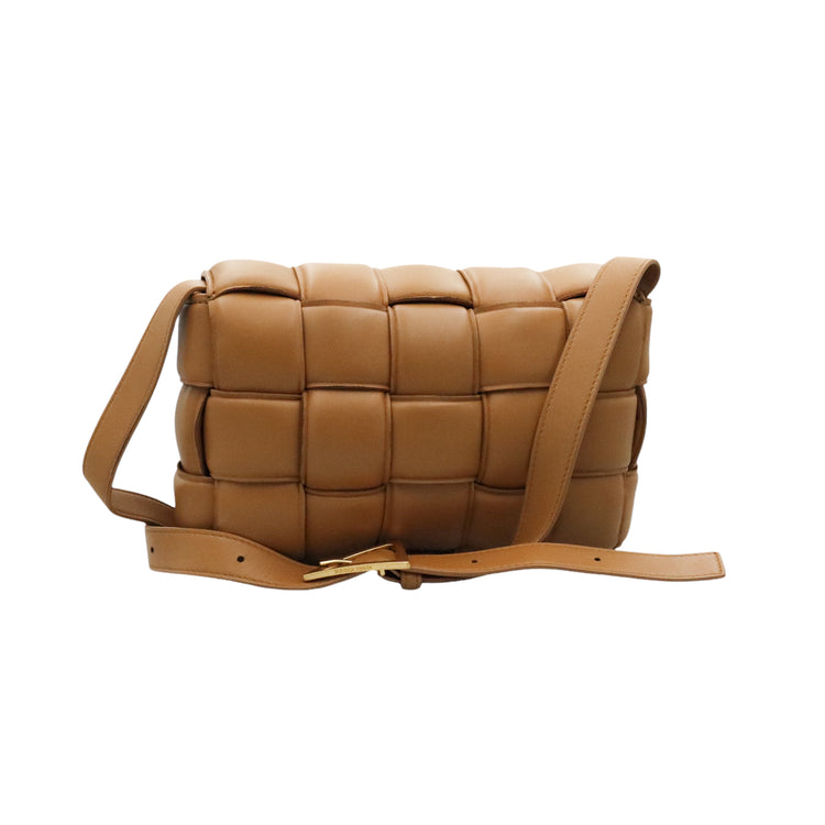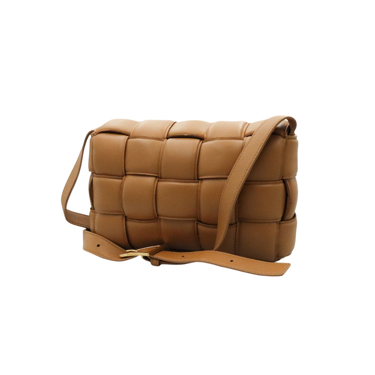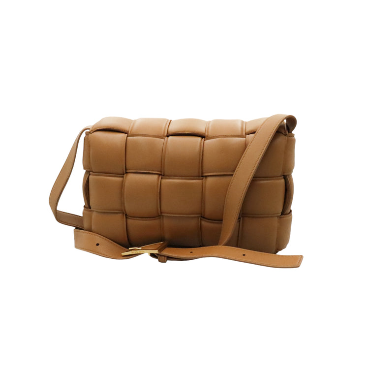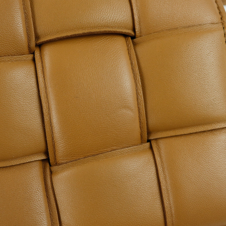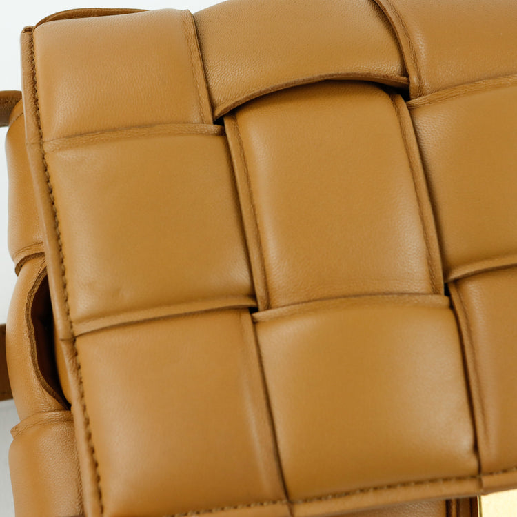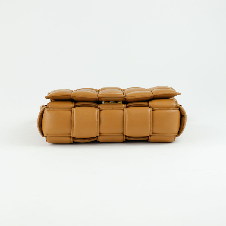 Bolso Bottega Veneta, Padded Cassette, confeccionado en piel color caramelo, con bandolera ajustable, herrajes en color dorado, leves marcas de desgaste por uso.