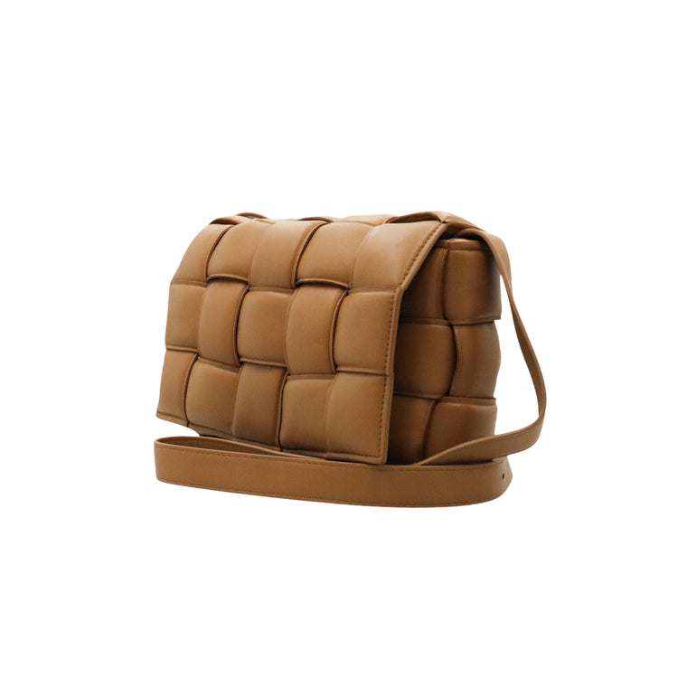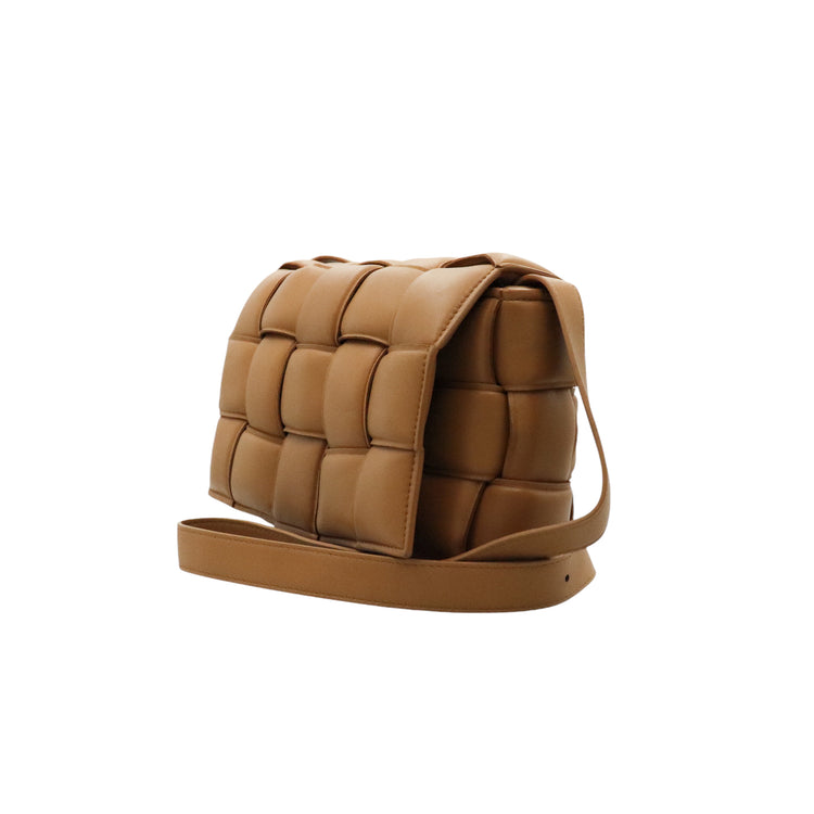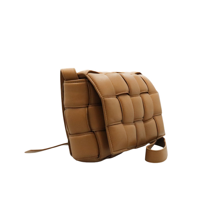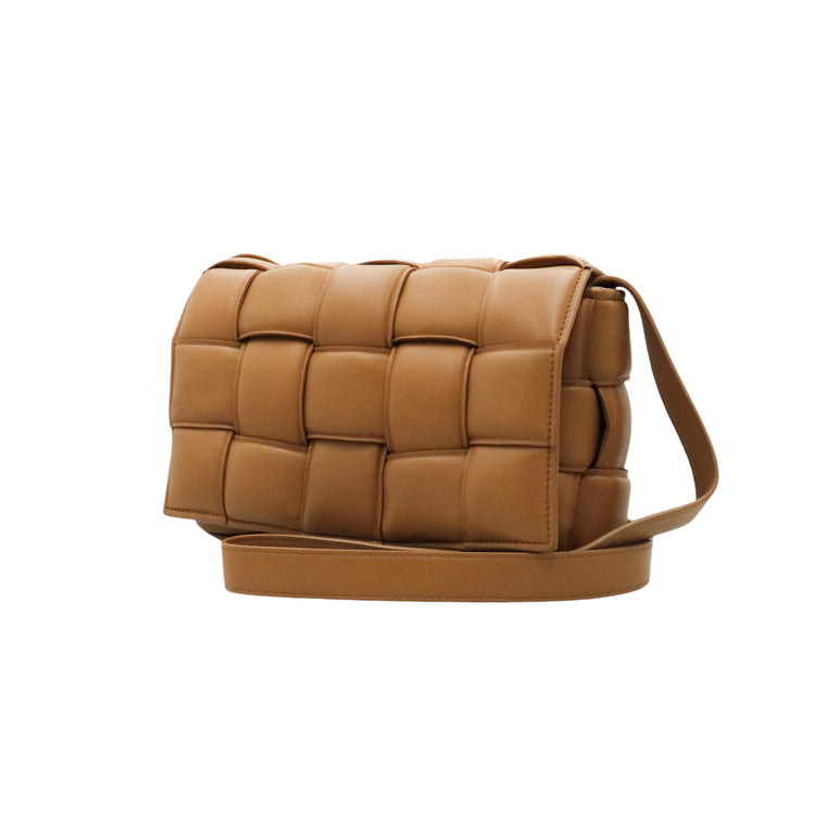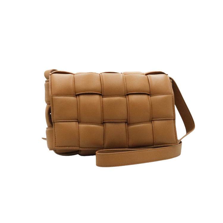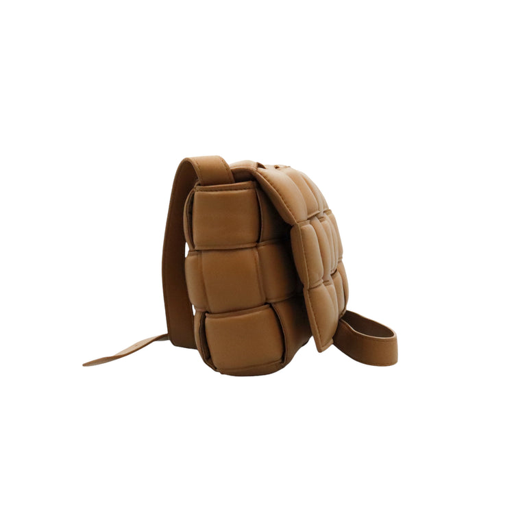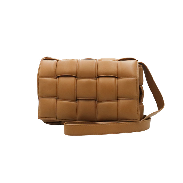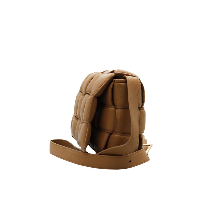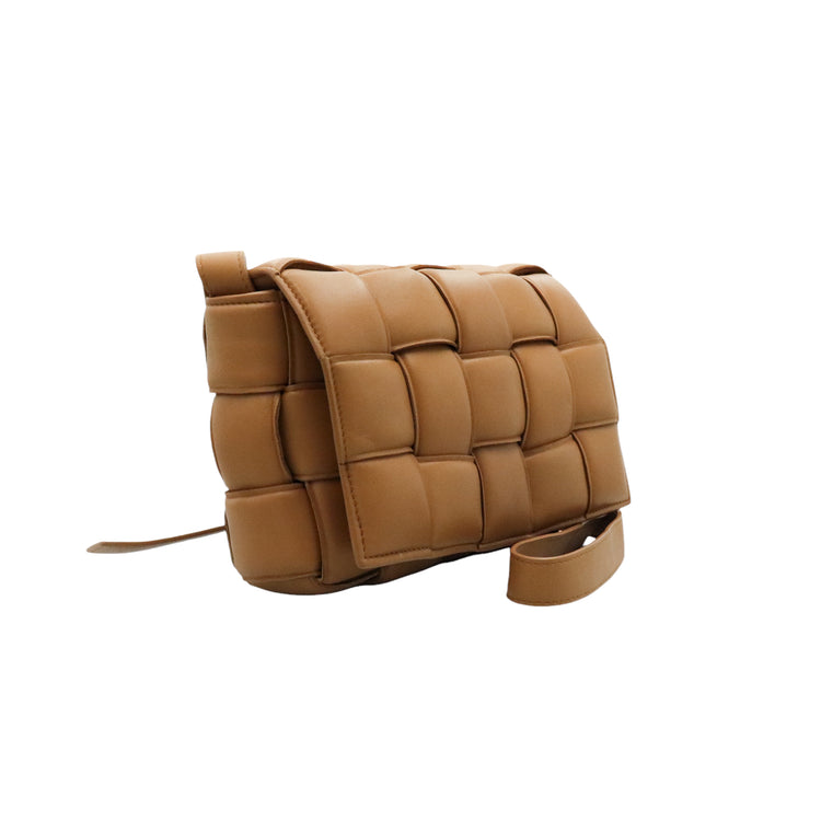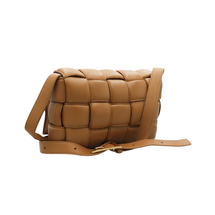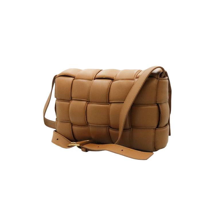 Bolso Bottega Veneta, Padded Cassette, confeccionado en piel color caramelo, con bandolera ajustable, herrajes en color dorado, leves marcas de desgaste por uso.