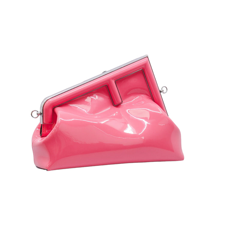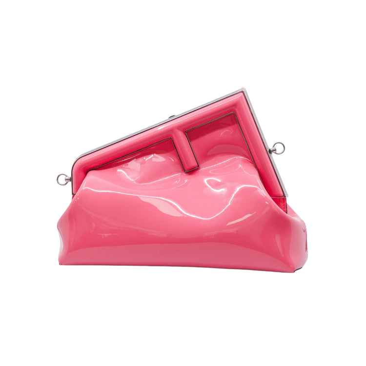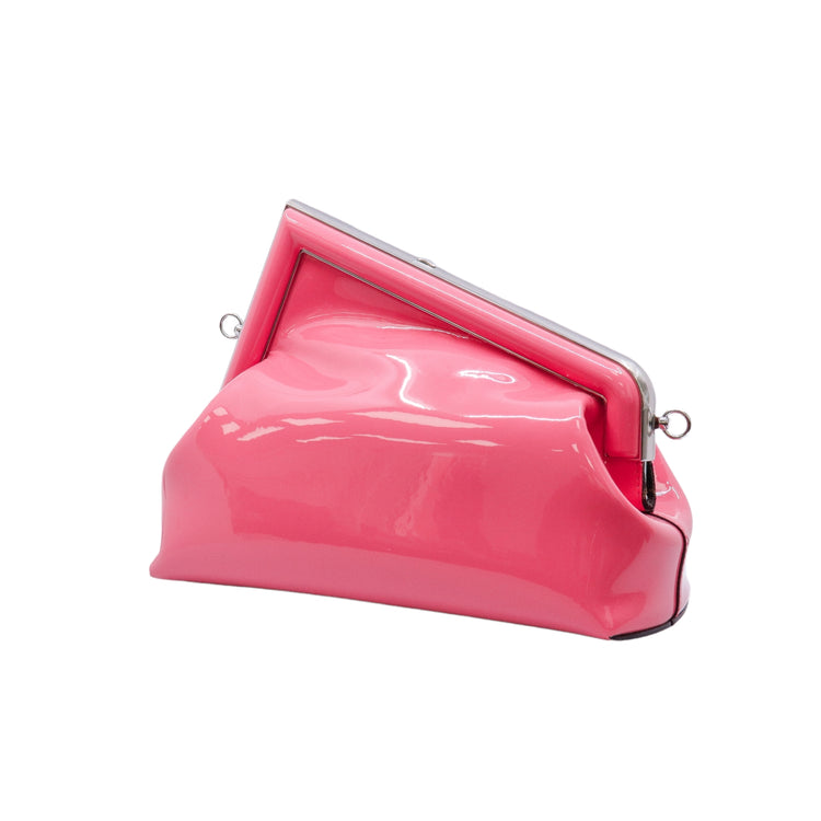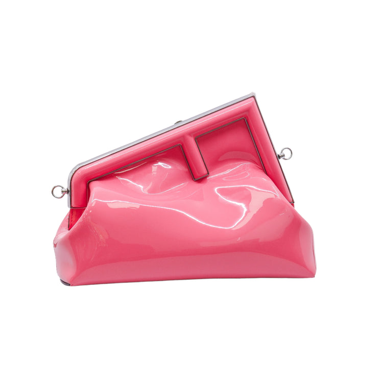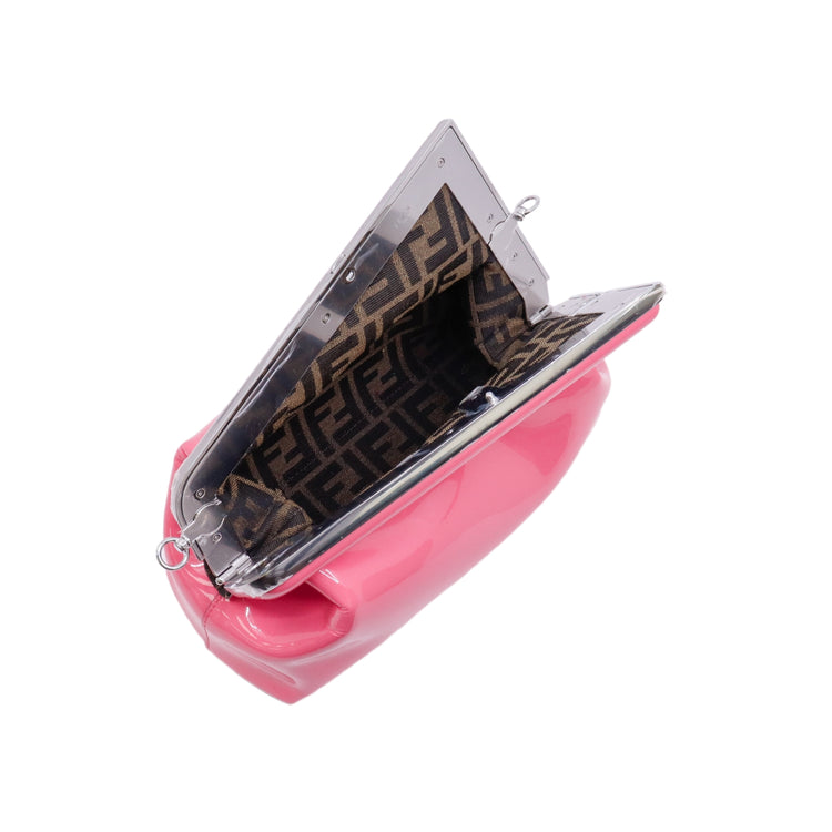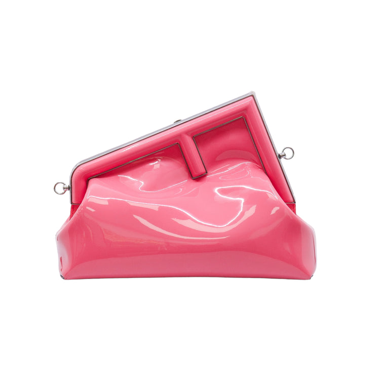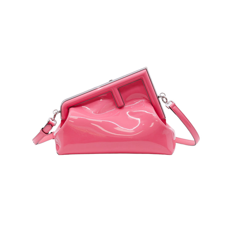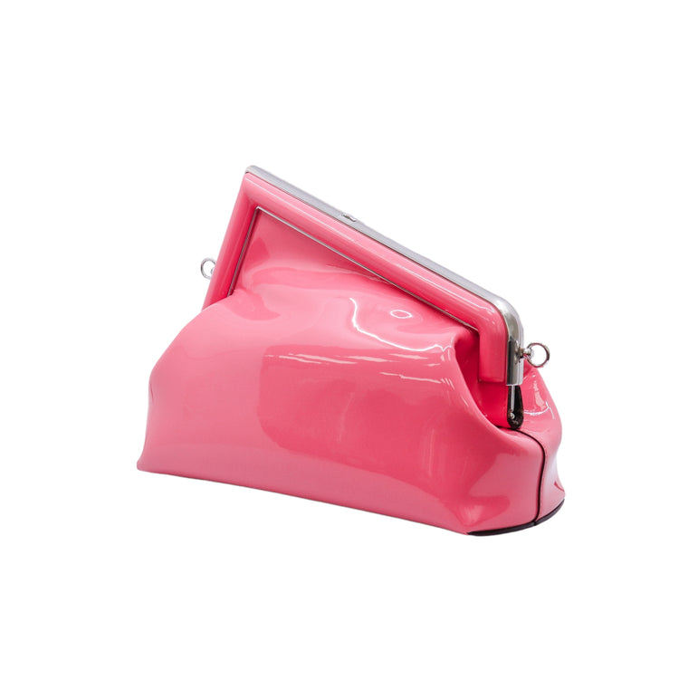 Bolso Fendi First confeccionado en piel charolada color rosa, con borde metálico revestido en forma de "F" y strap ajustable en charol del mismo tono, forro y bolsillo interno en textil con monograma de la marca.