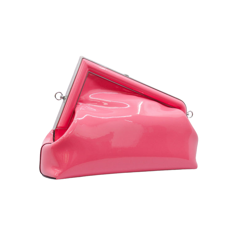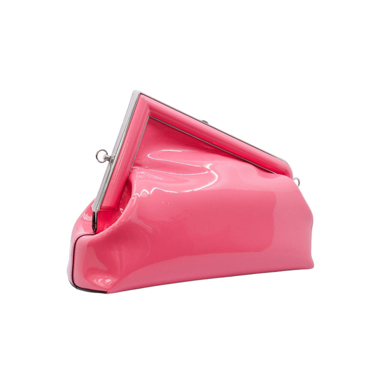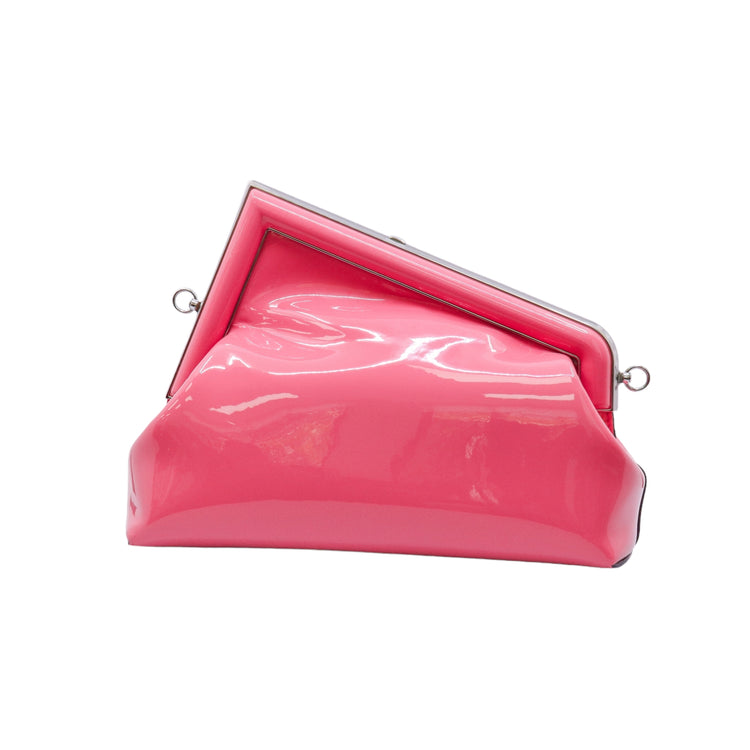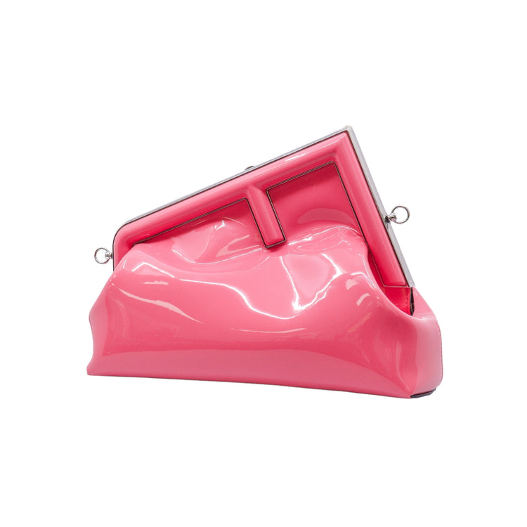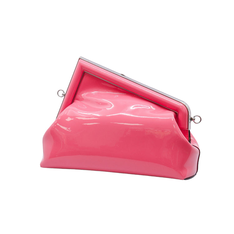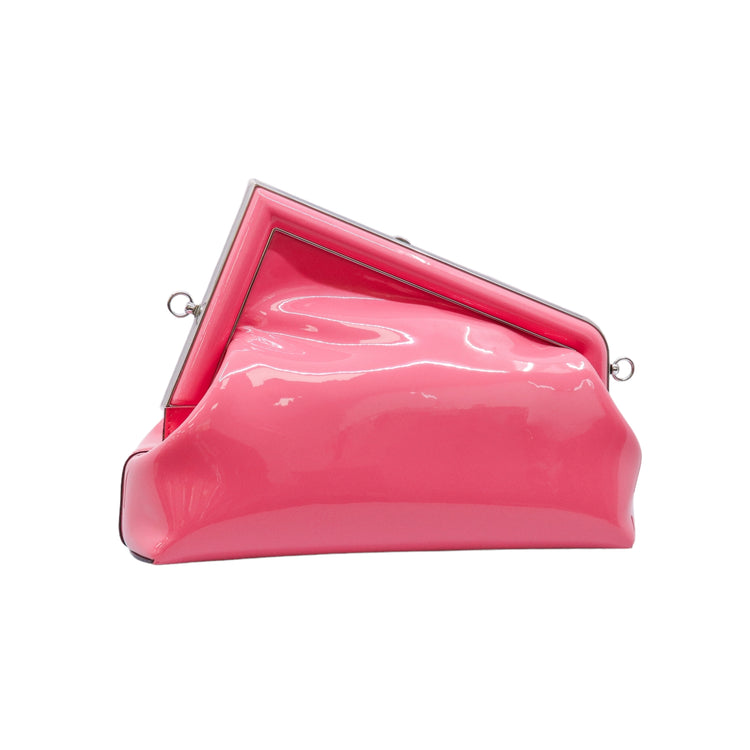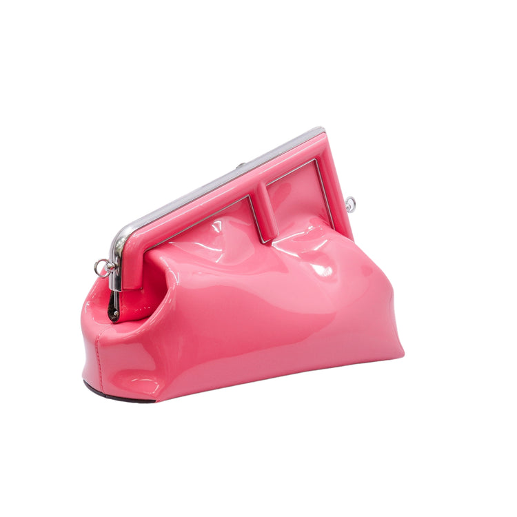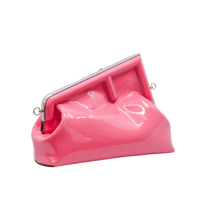 Bolso Fendi First confeccionado en piel charolada color rosa, con borde metálico revestido en forma de "F" y strap ajustable en charol del mismo tono, forro y bolsillo interno en textil con monograma de la marca.