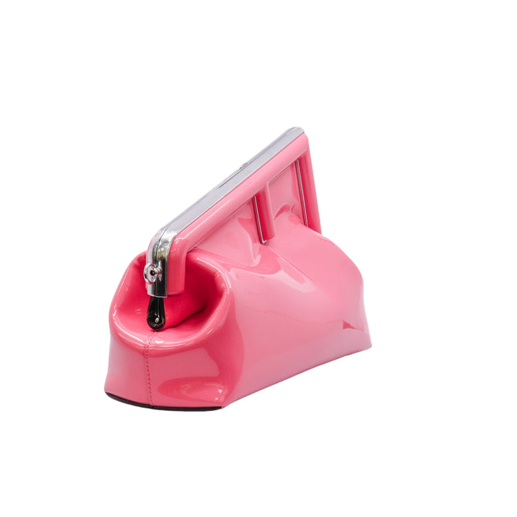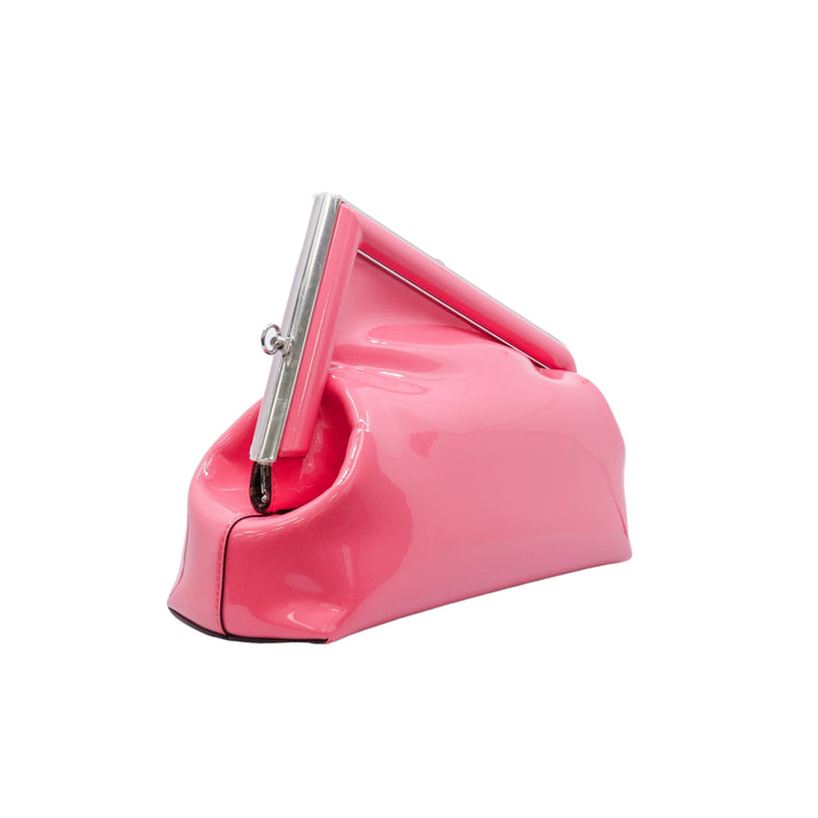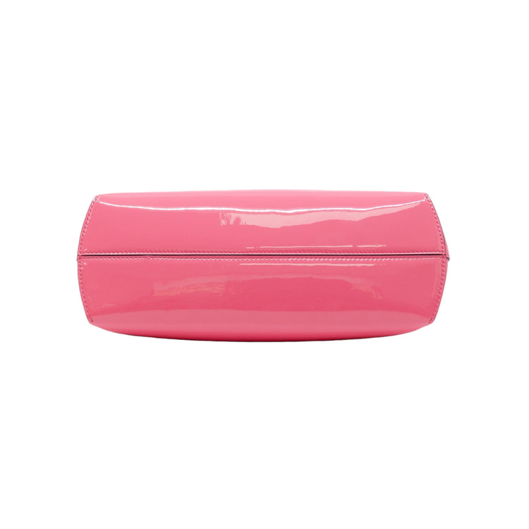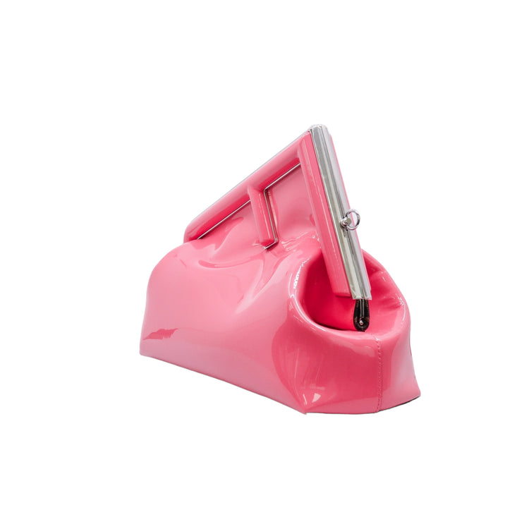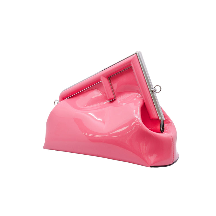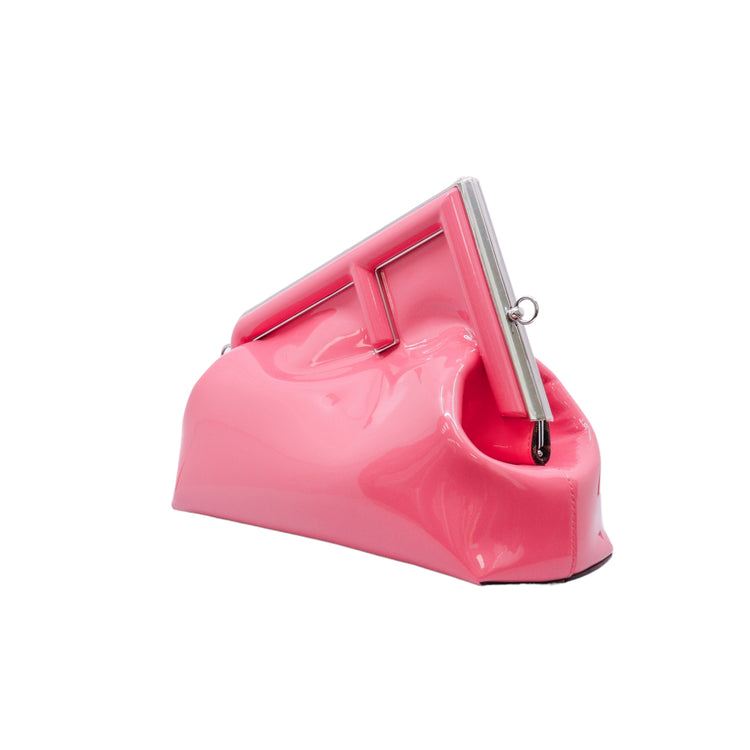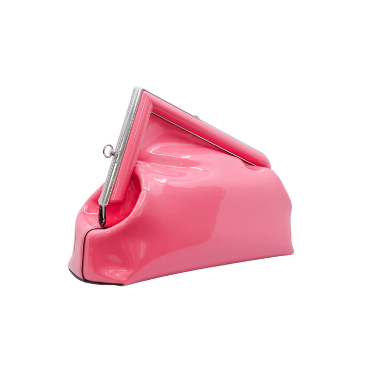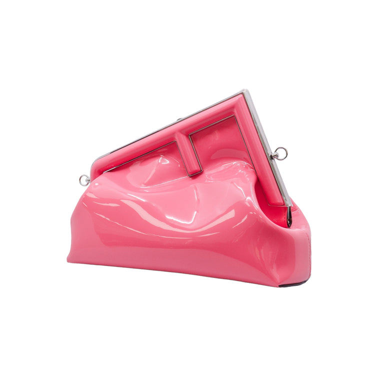 Bolso Fendi First confeccionado en piel charolada color rosa, con borde metálico revestido en forma de "F" y strap ajustable en charol del mismo tono, forro y bolsillo interno en textil con monograma de la marca.
