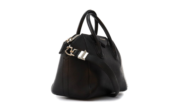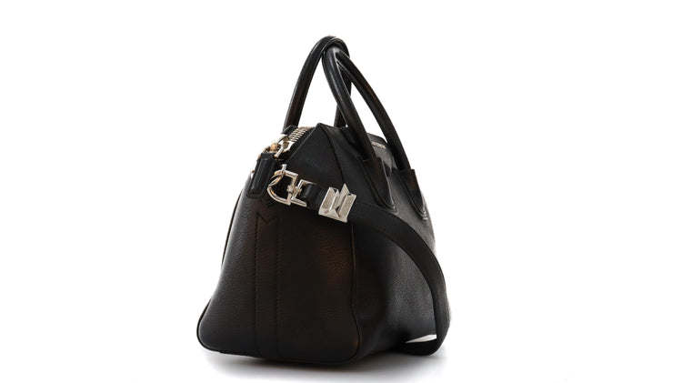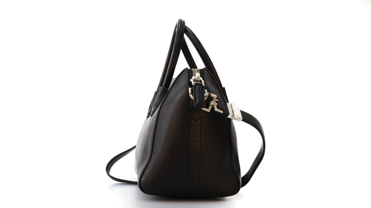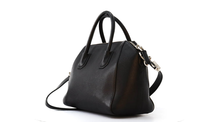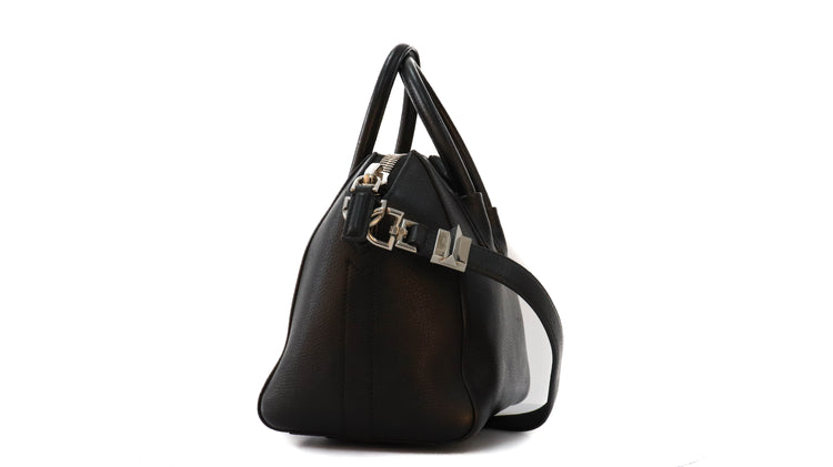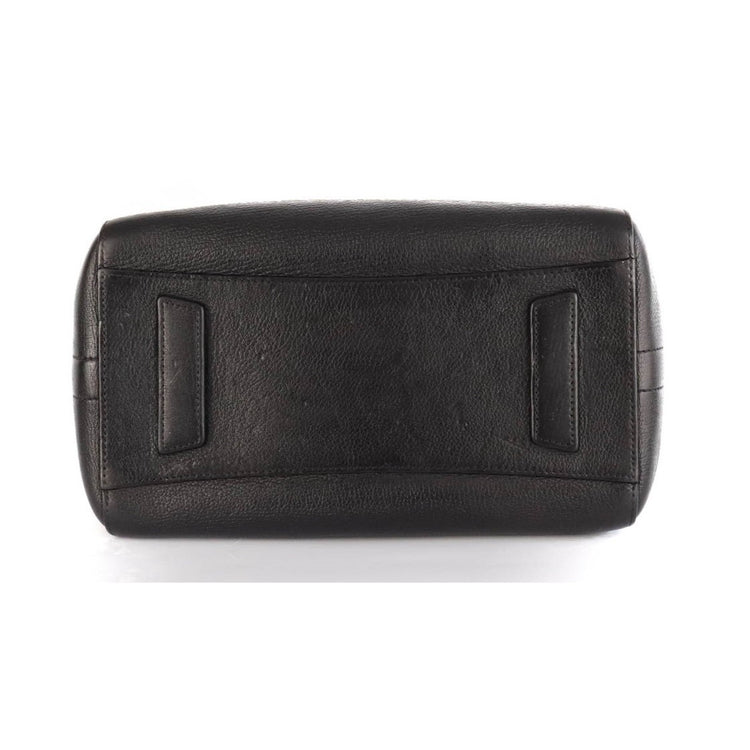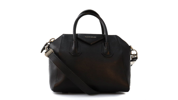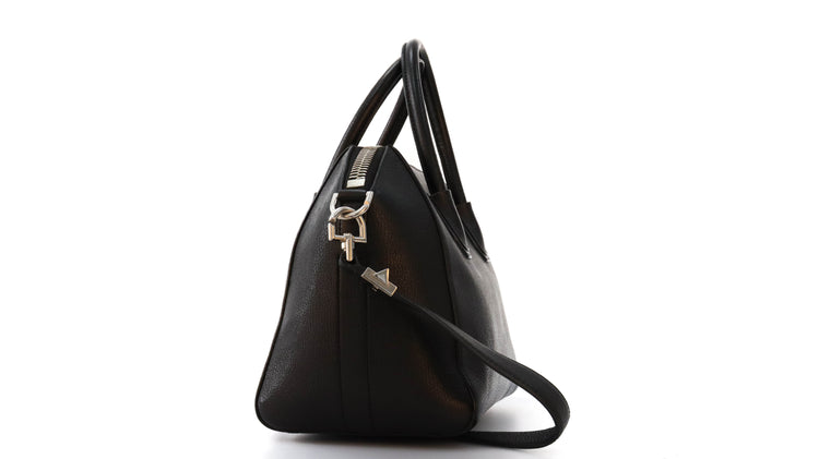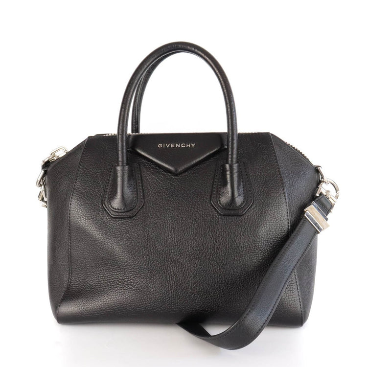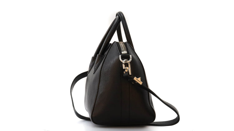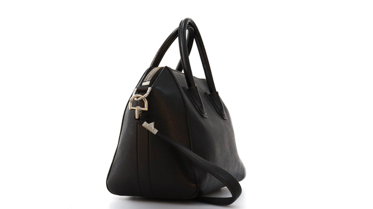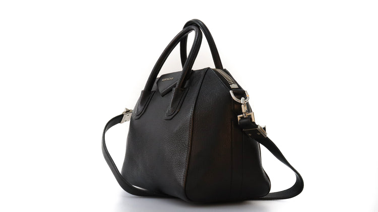 Bolso Givenchy Antígona, confeccionado en piel granulada de cabra color negro, con dos asas y bandolera ajustable para usar al hombro o cruzada, logotipo en metal plateado, interior forrado en tela del mismo tono negro , bolsillos planos interiores y cierre tipo cremallera.