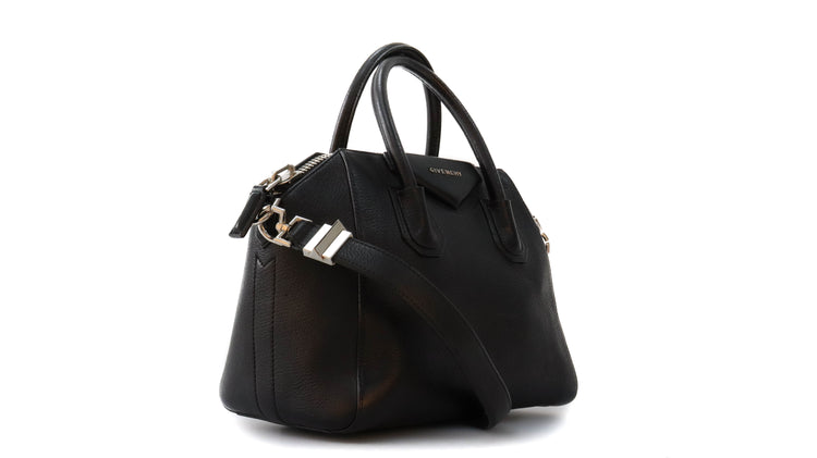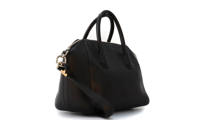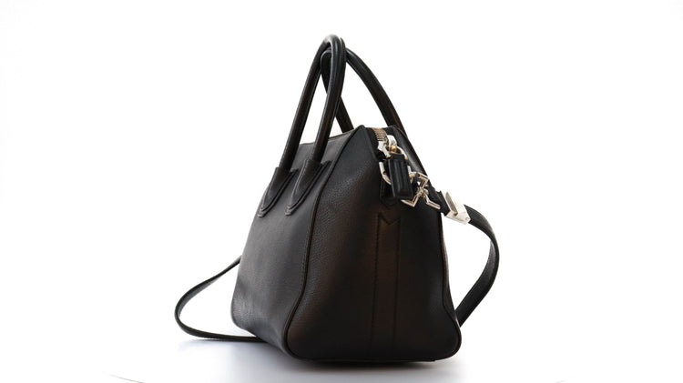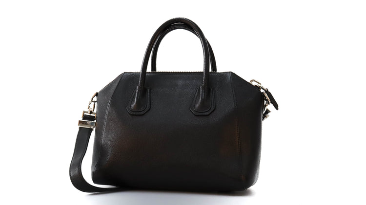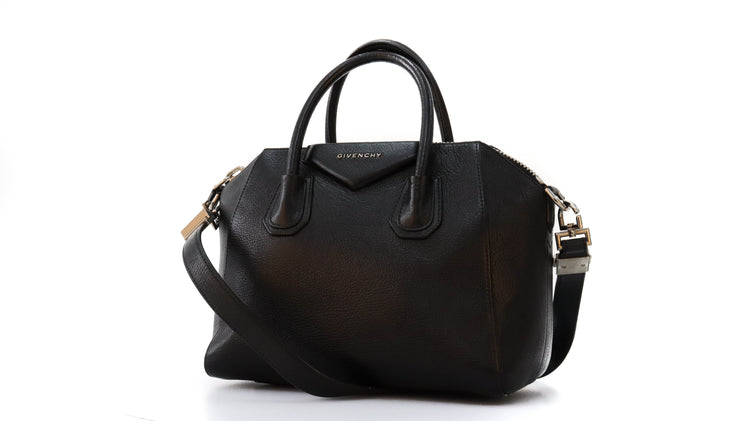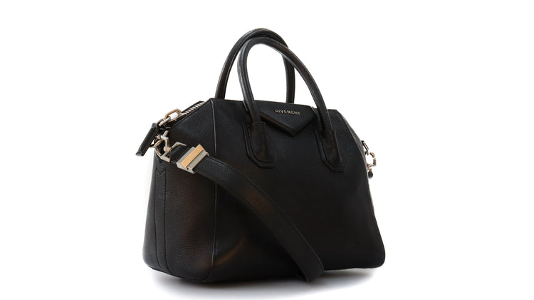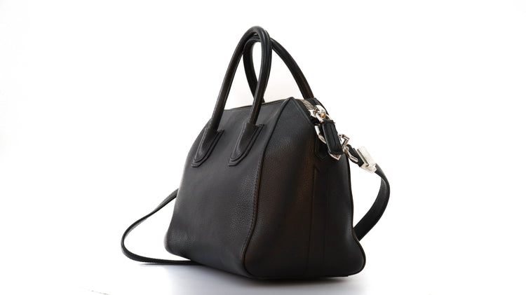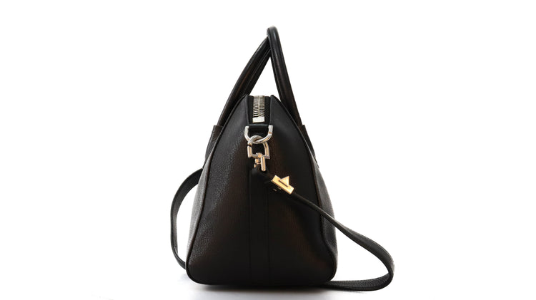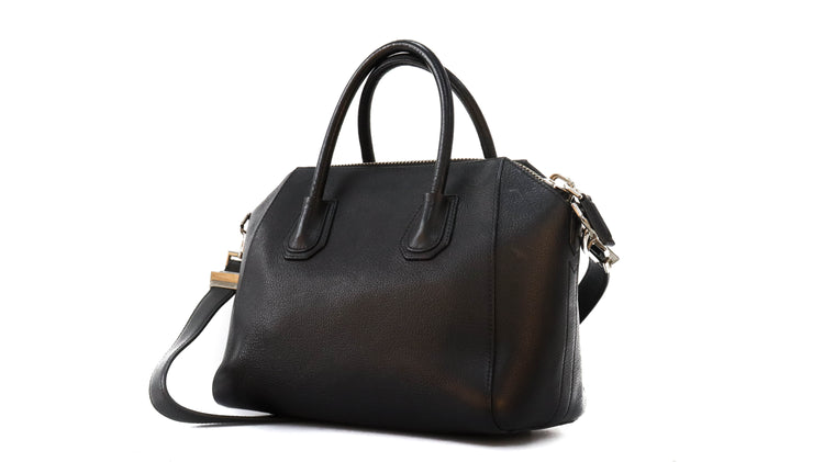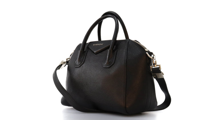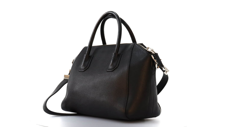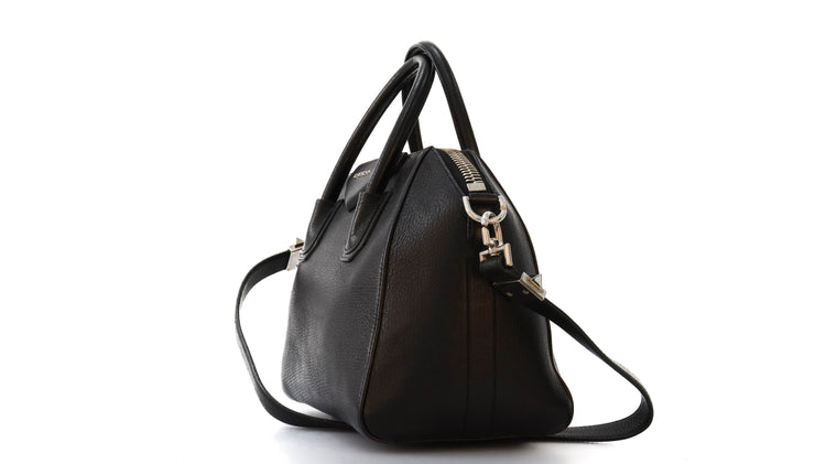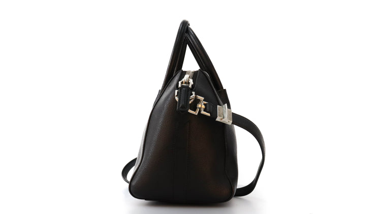 Bolso Givenchy Antígona, confeccionado en piel granulada de cabra color negro, con dos asas y bandolera ajustable para usar al hombro o cruzada, logotipo en metal plateado, interior forrado en tela del mismo tono negro , bolsillos planos interiores y cierre tipo cremallera.