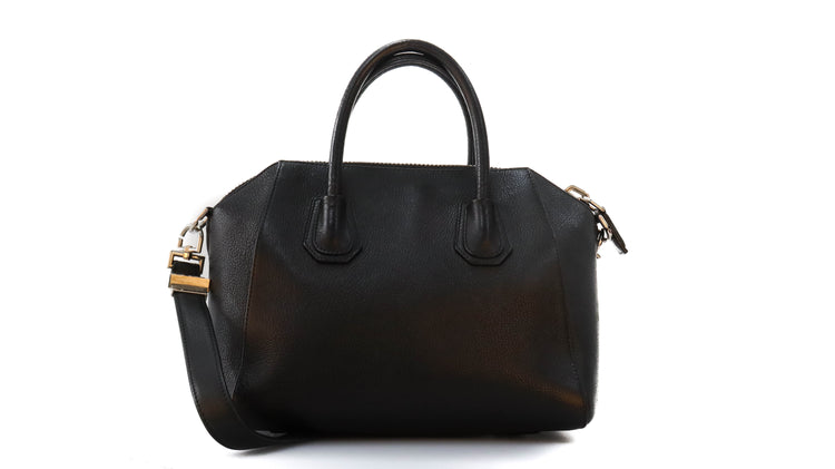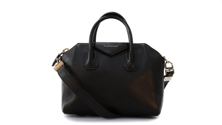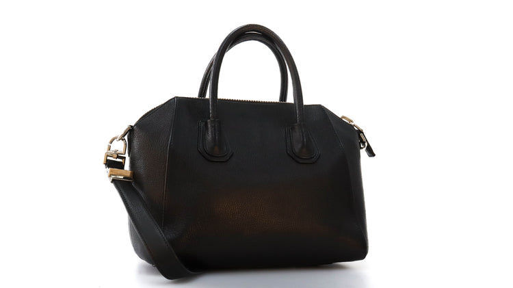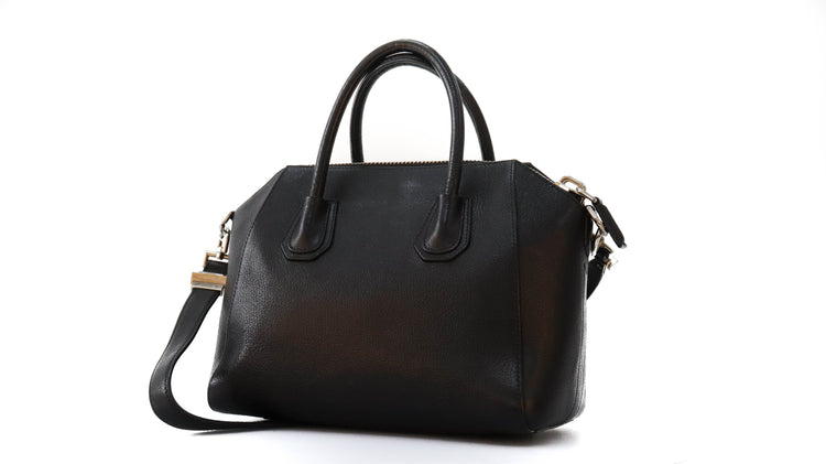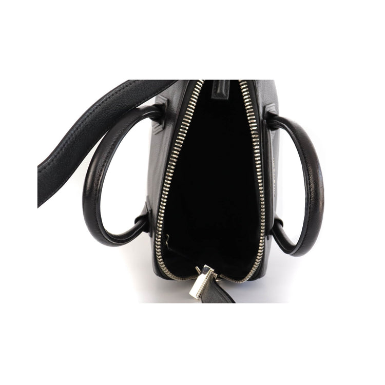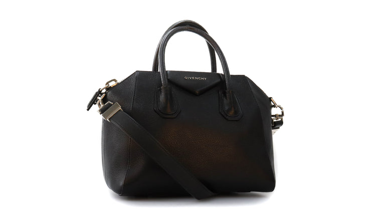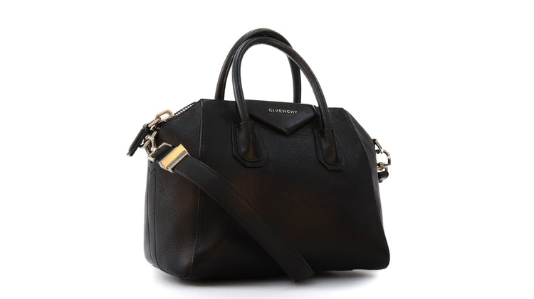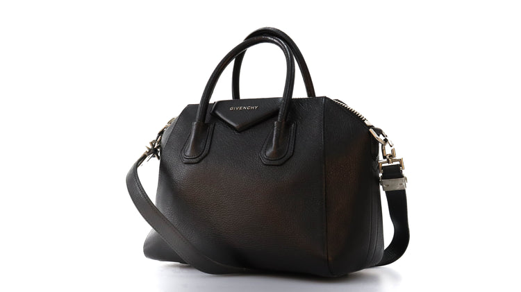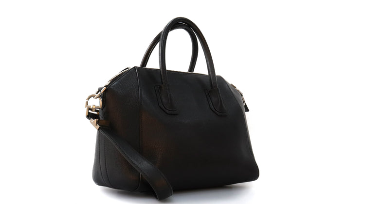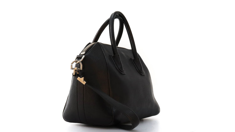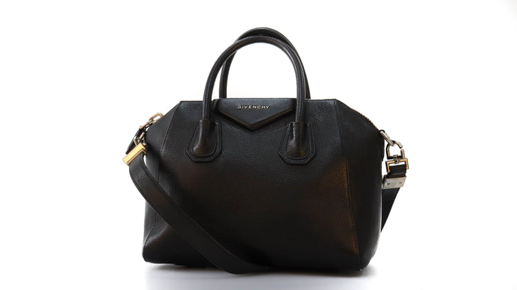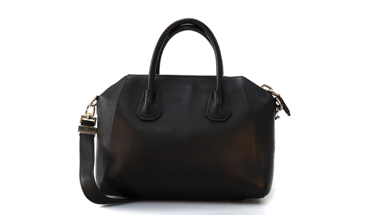 Bolso Givenchy Antígona, confeccionado en piel granulada de cabra color negro, con dos asas y bandolera ajustable para usar al hombro o cruzada, logotipo en metal plateado, interior forrado en tela del mismo tono negro , bolsillos planos interiores y cierre tipo cremallera.
