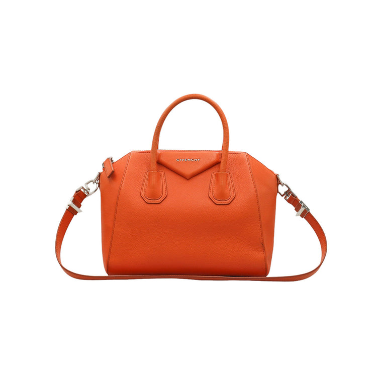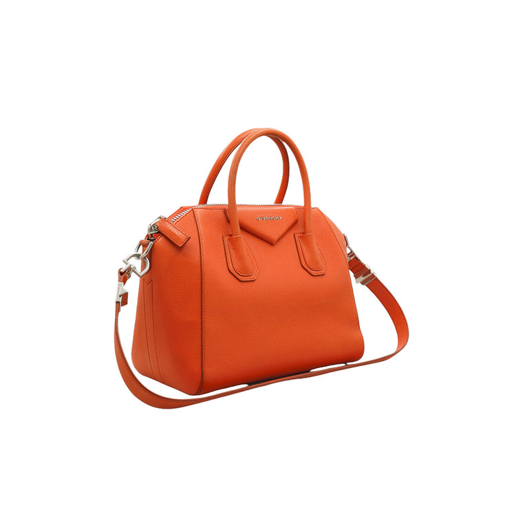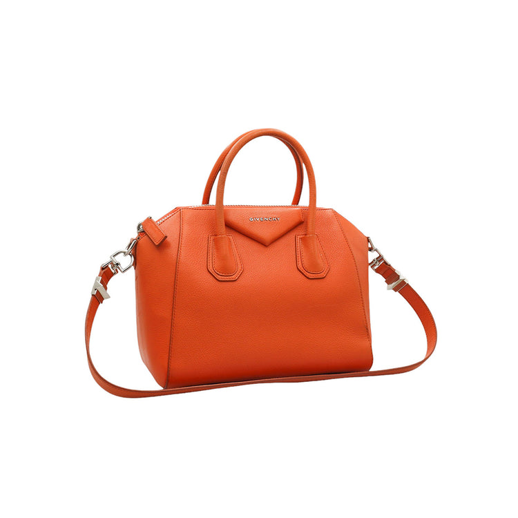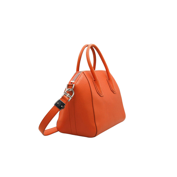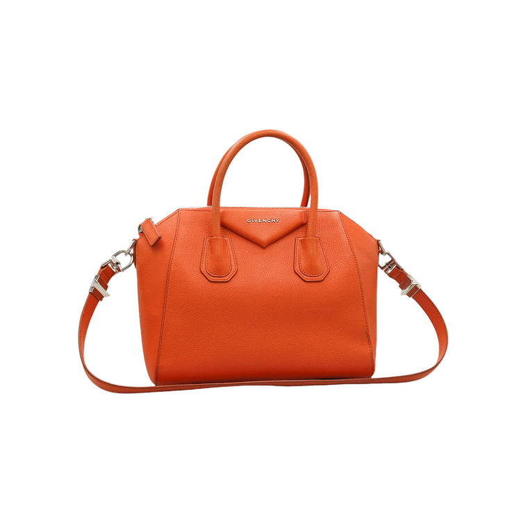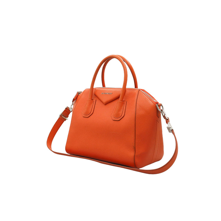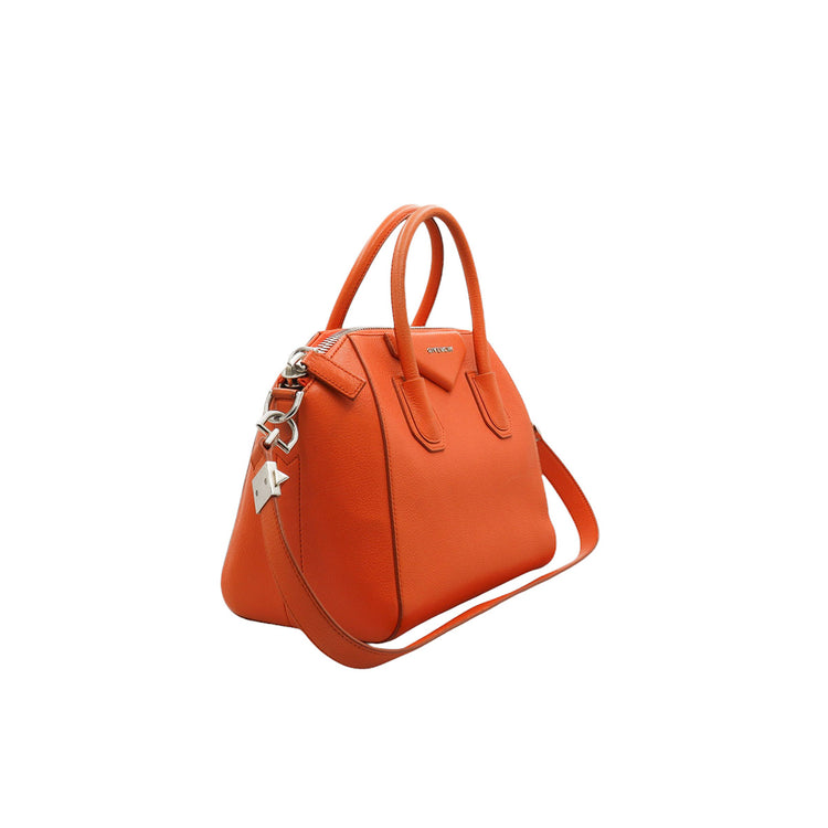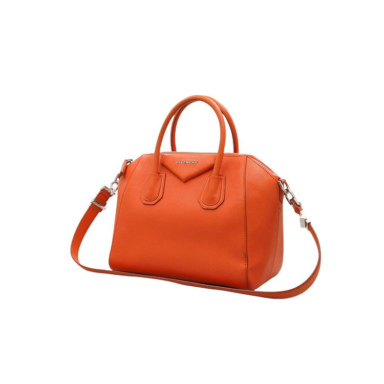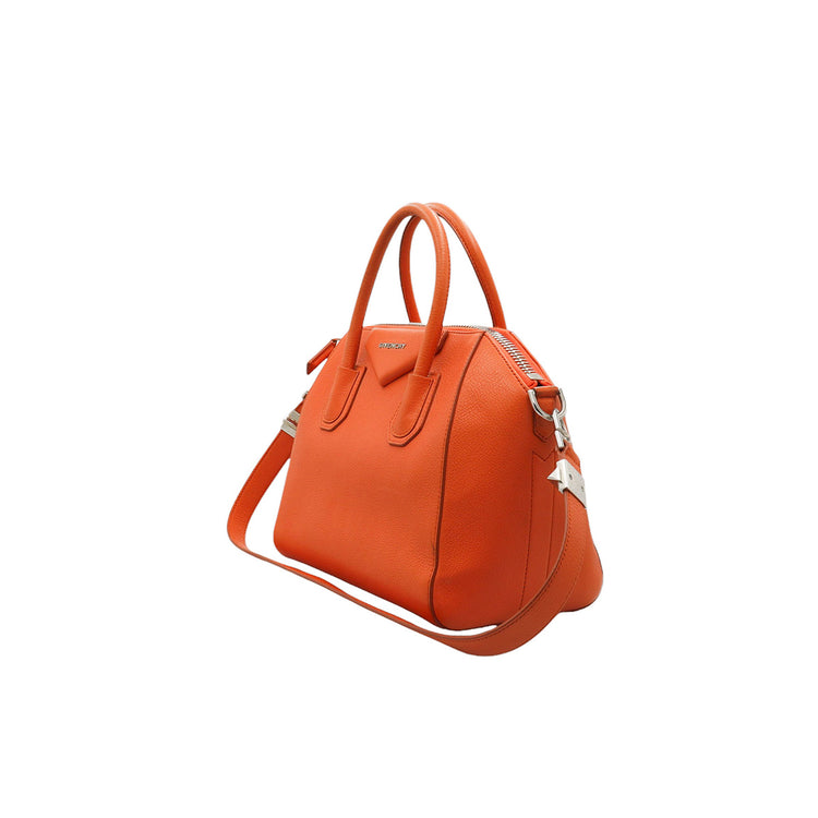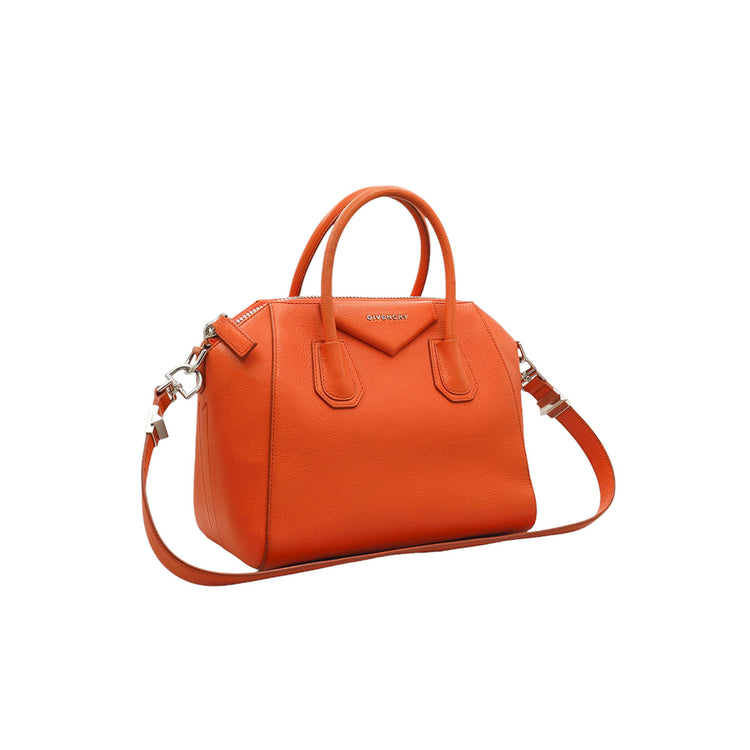Bolso Givenchy Antígona, confeccionado en piel granulada de cabra color naranja, con dos asas y bandolera ajustable para usar al hombro o cruzada, logotipo en metal plateado, interior forrado en tela en tono beige , bolsillos planos interiores y cierre tipo cremallera.