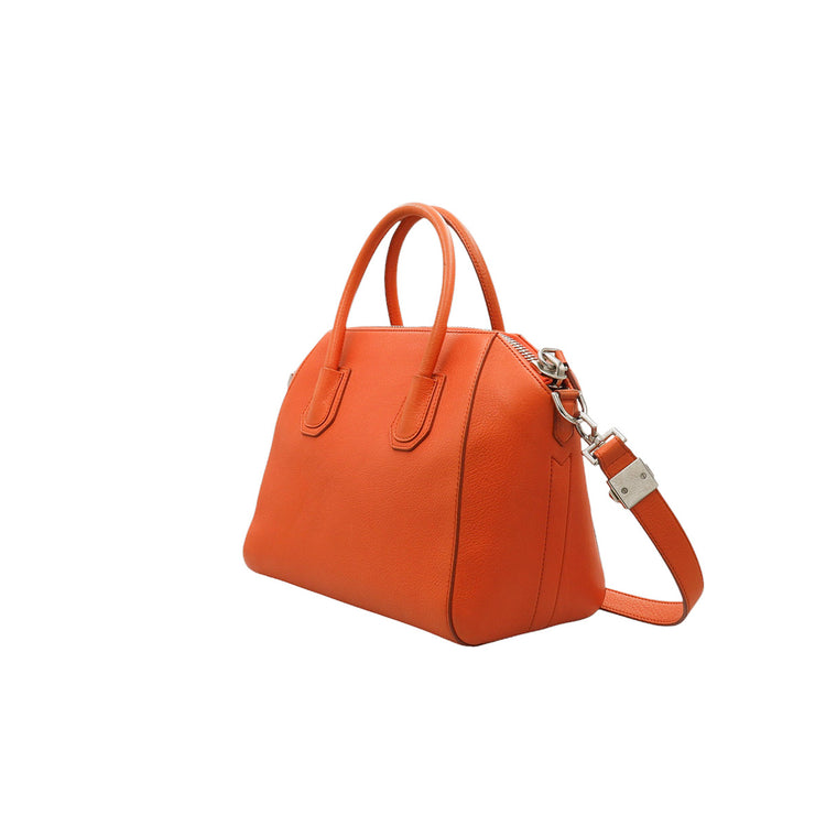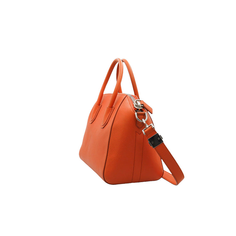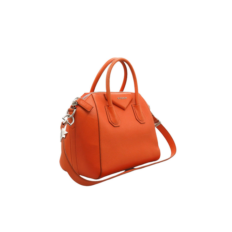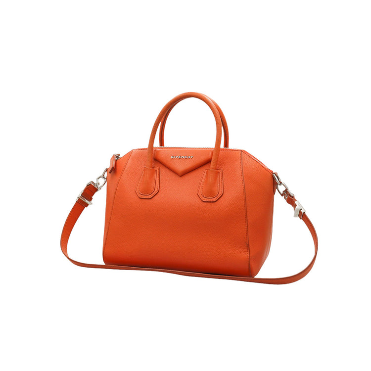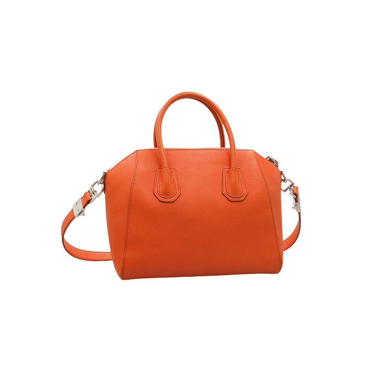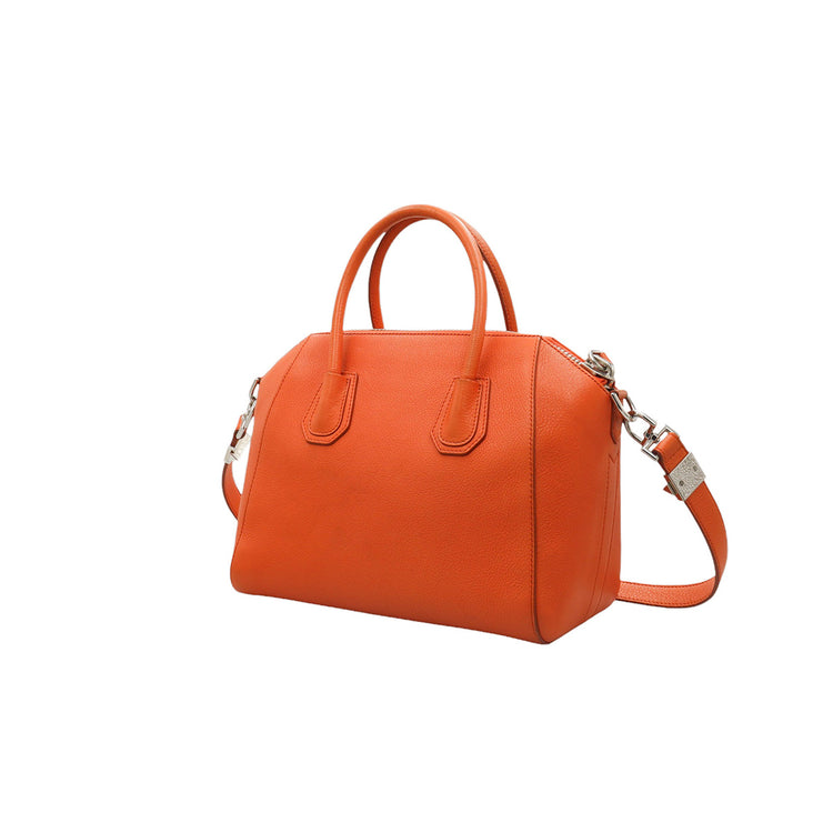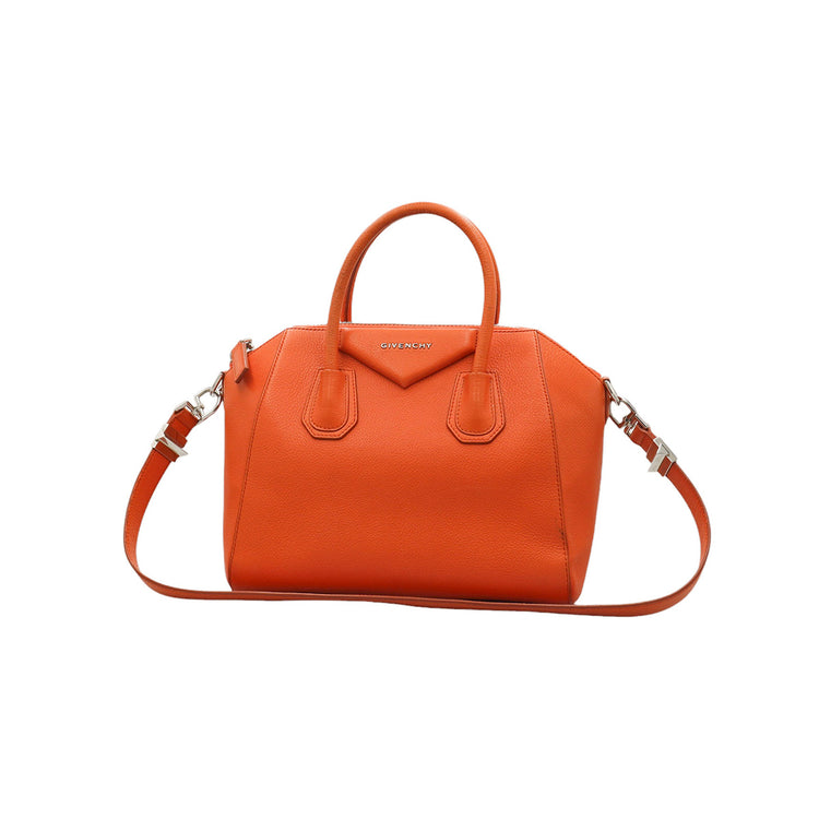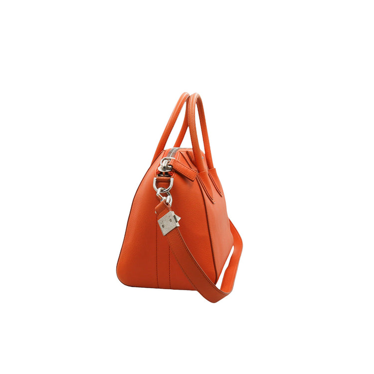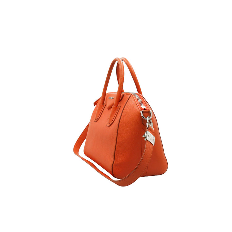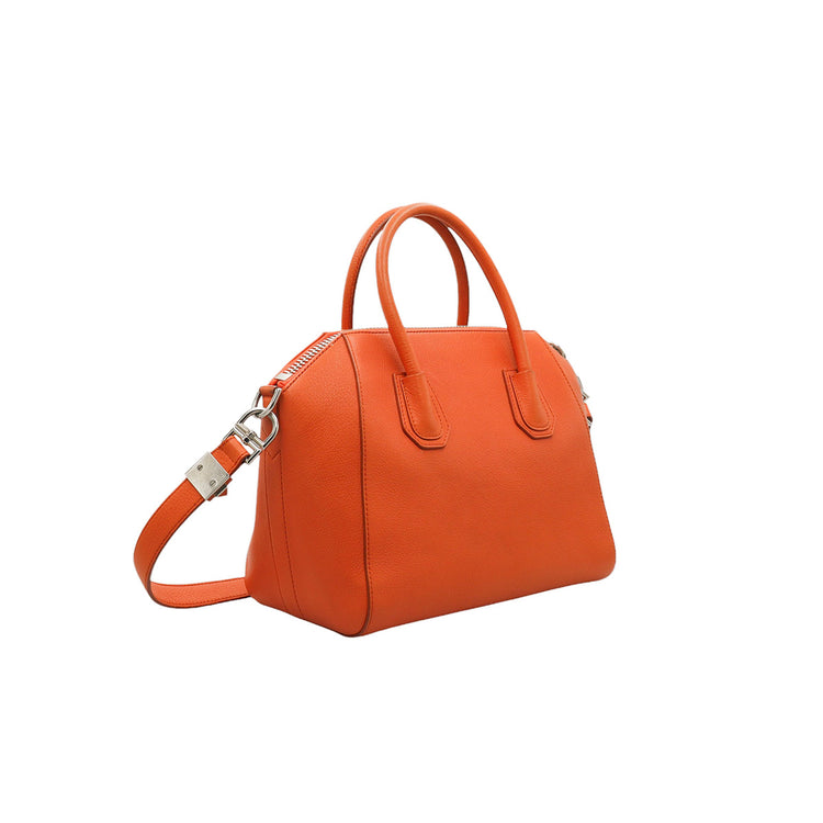Bolso Givenchy Antígona, confeccionado en piel granulada de cabra color naranja, con dos asas y bandolera ajustable para usar al hombro o cruzada, logotipo en metal plateado, interior forrado en tela en tono beige , bolsillos planos interiores y cierre tipo cremallera.