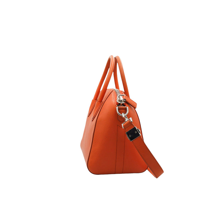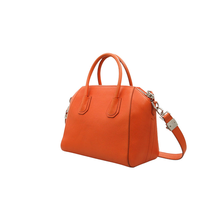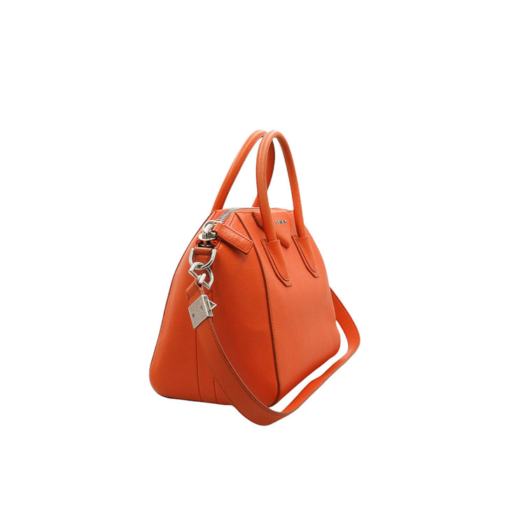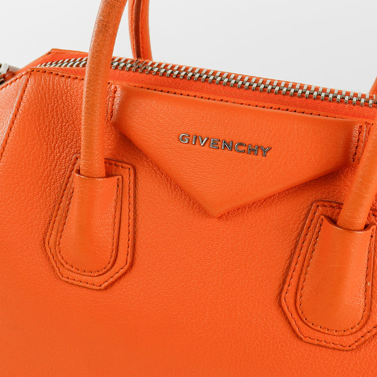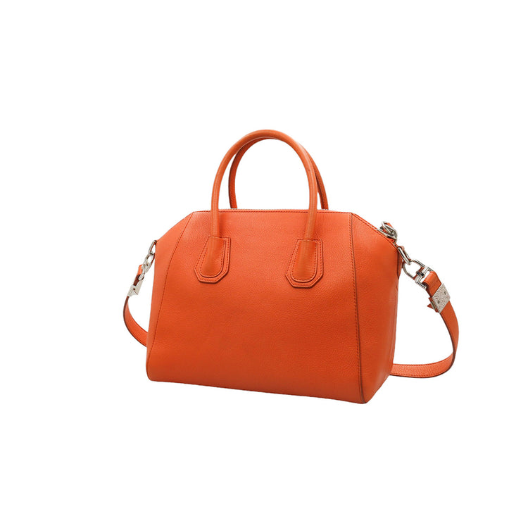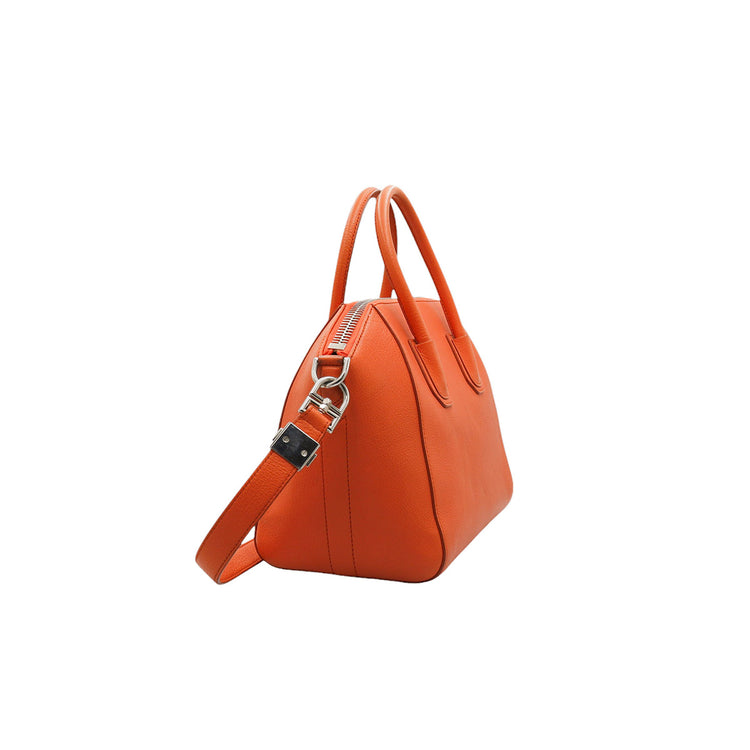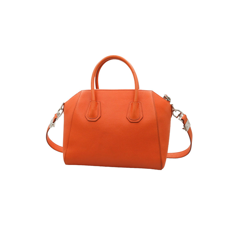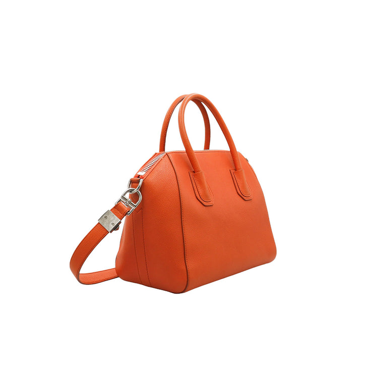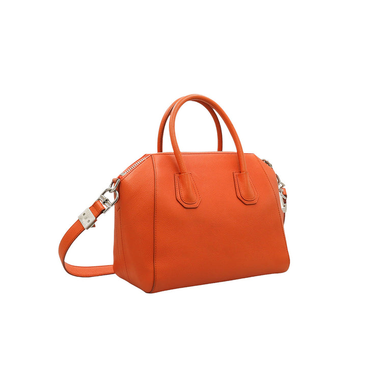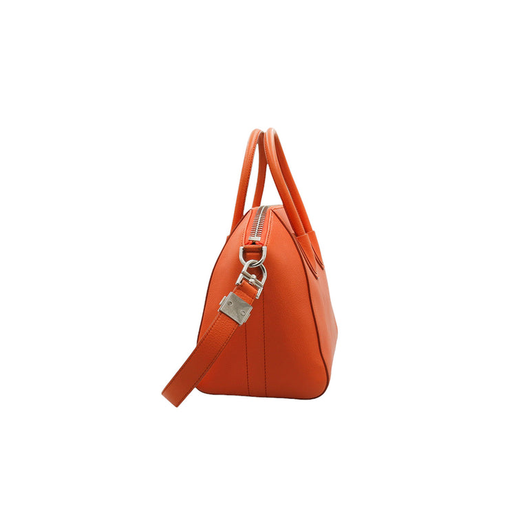 Bolso Givenchy Antígona, confeccionado en piel granulada de cabra color naranja, con dos asas y bandolera ajustable para usar al hombro o cruzada, logotipo en metal plateado, interior forrado en tela en tono beige , bolsillos planos interiores y cierre tipo cremallera.