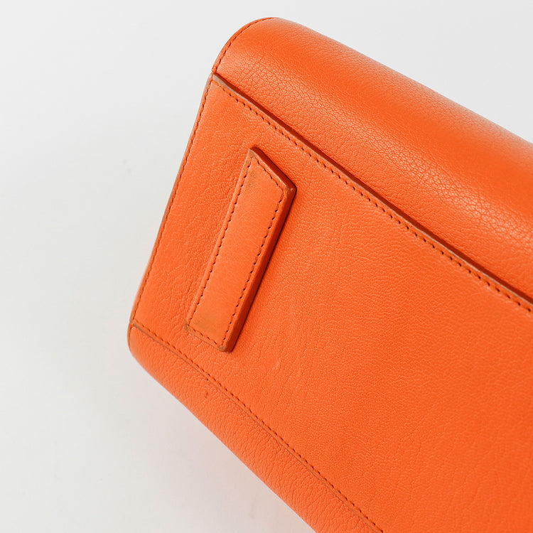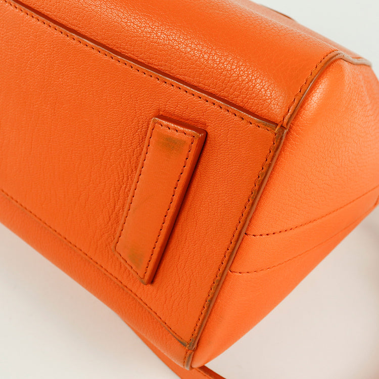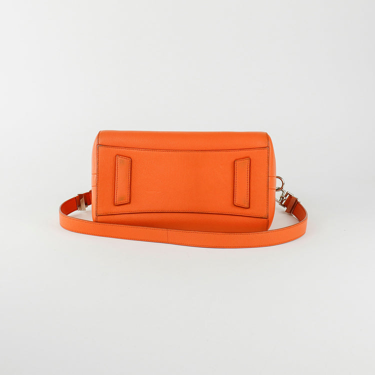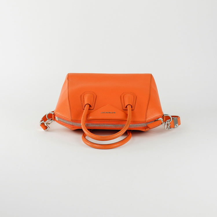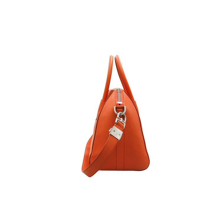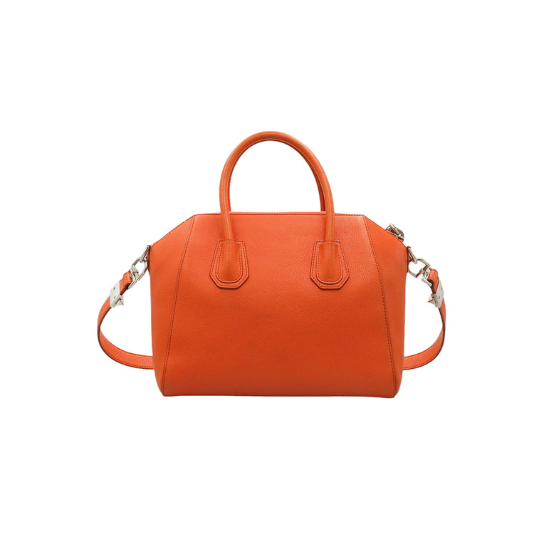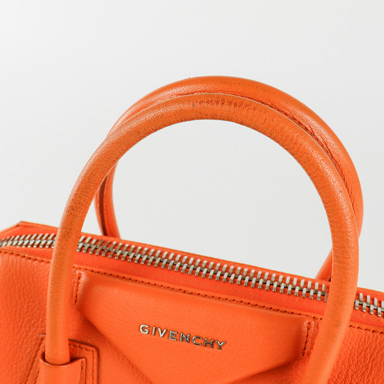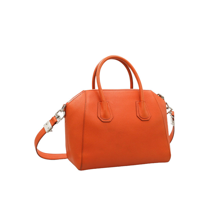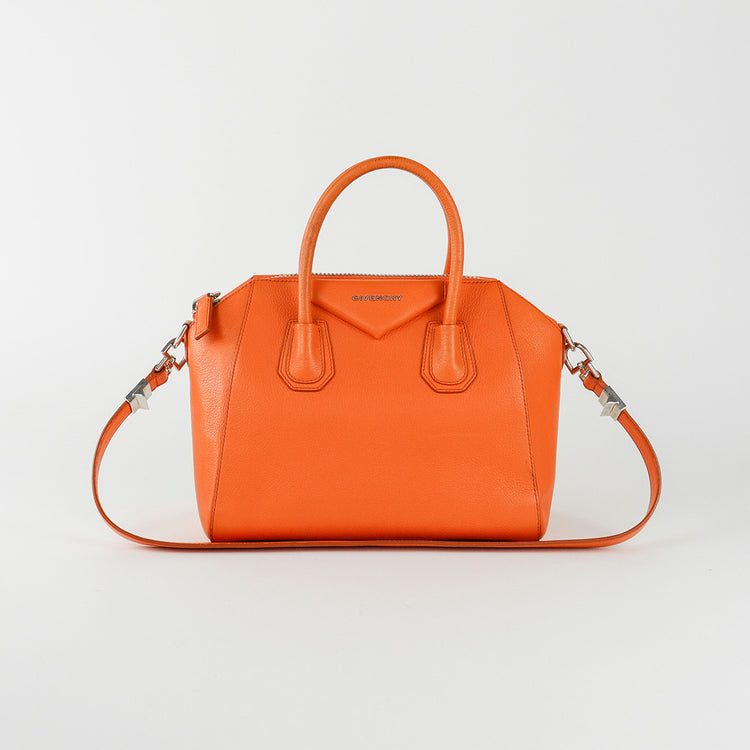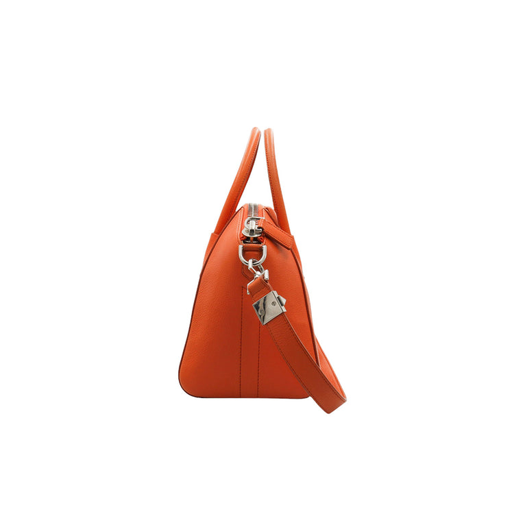 Bolso Givenchy Antígona, confeccionado en piel granulada de cabra color naranja, con dos asas y bandolera ajustable para usar al hombro o cruzada, logotipo en metal plateado, interior forrado en tela en tono beige , bolsillos planos interiores y cierre tipo cremallera.