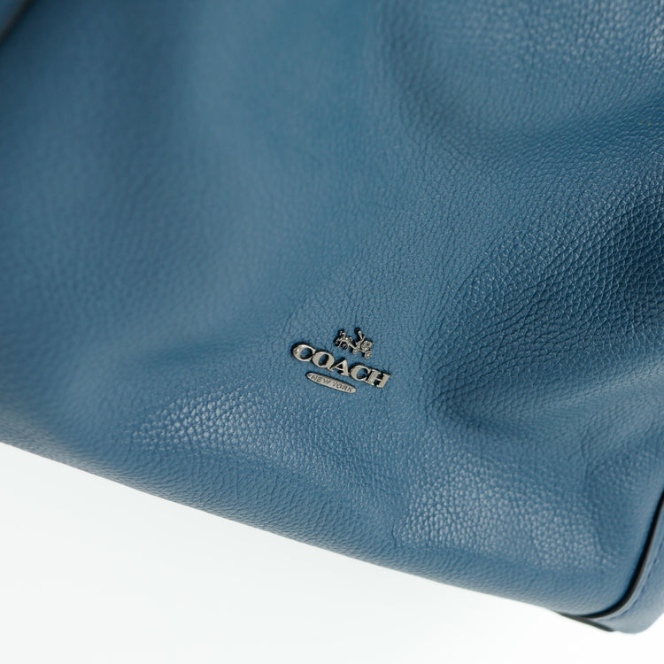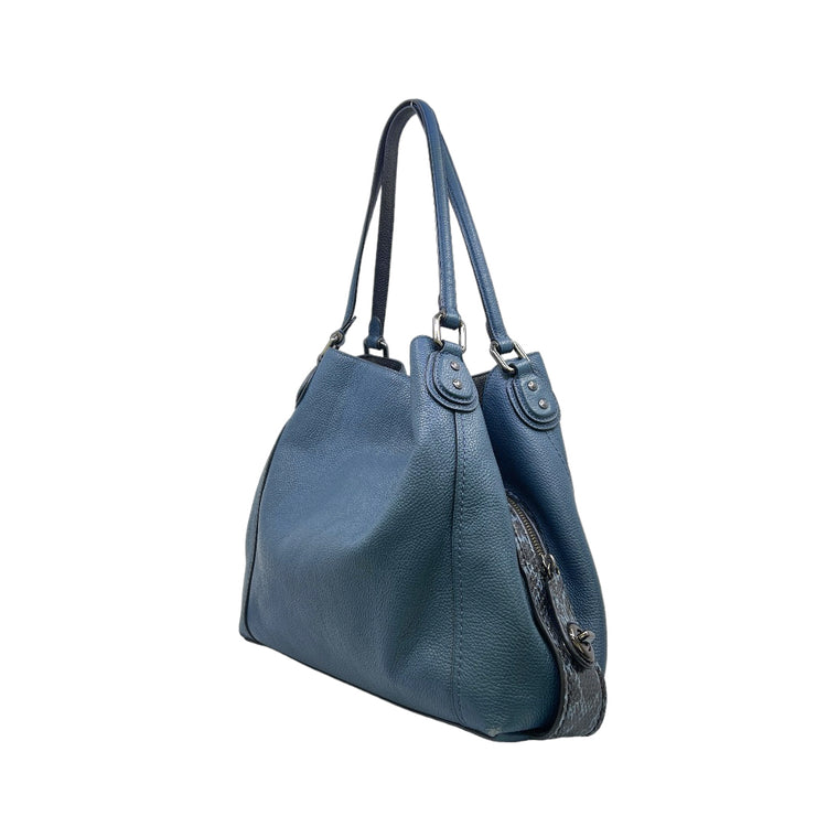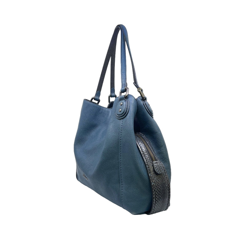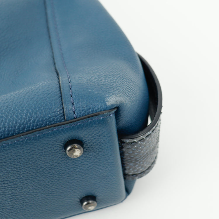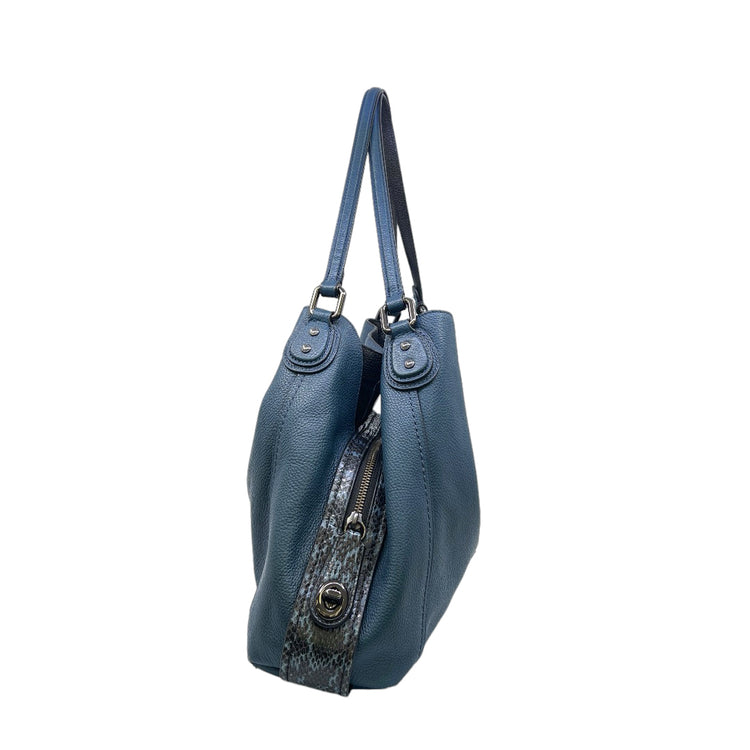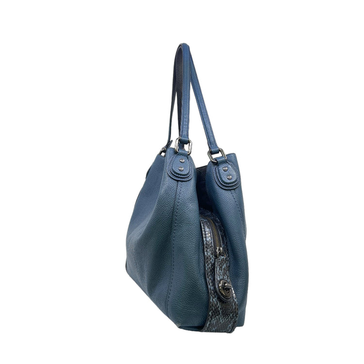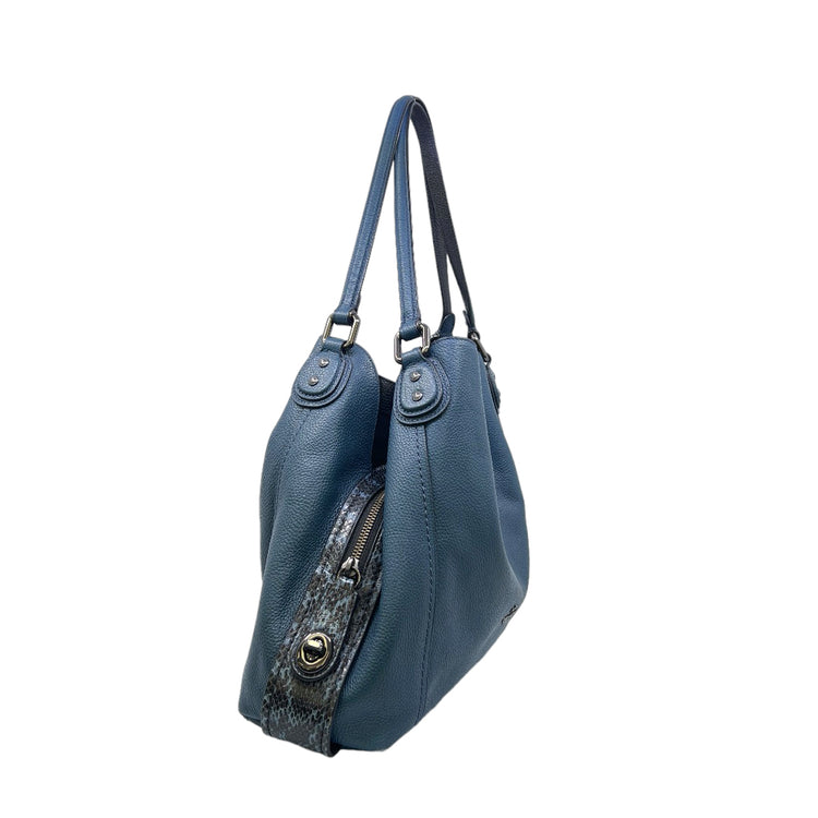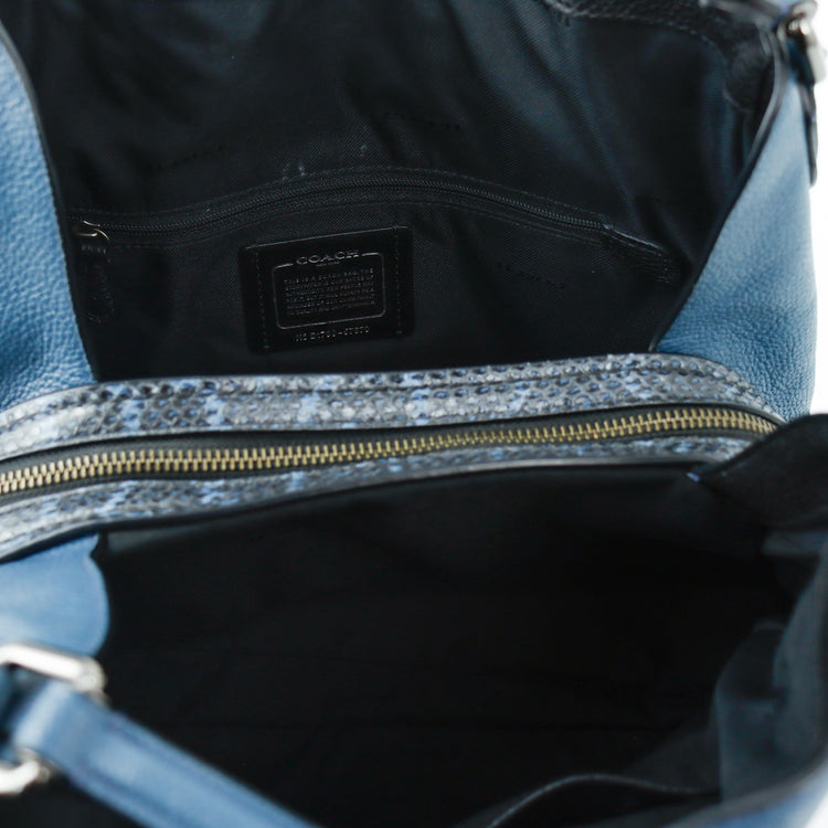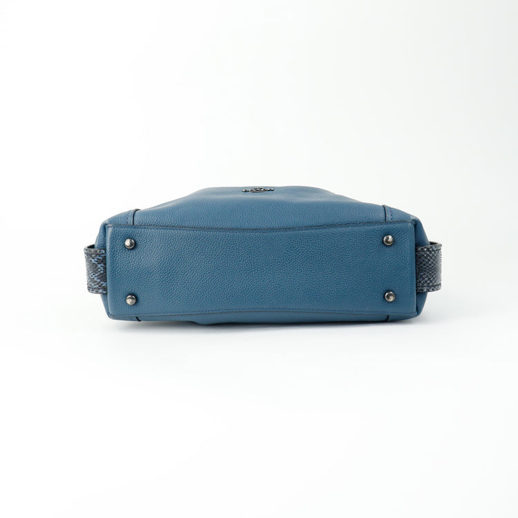 Bolso Coach, confeccionado en piel color azul con detalles en animal print, con 2 asas superiores semirrígidas y bolsillo intermedio con cierre de cremallera, herrajes en color grafito, detalles en las esquinas por poco uso.