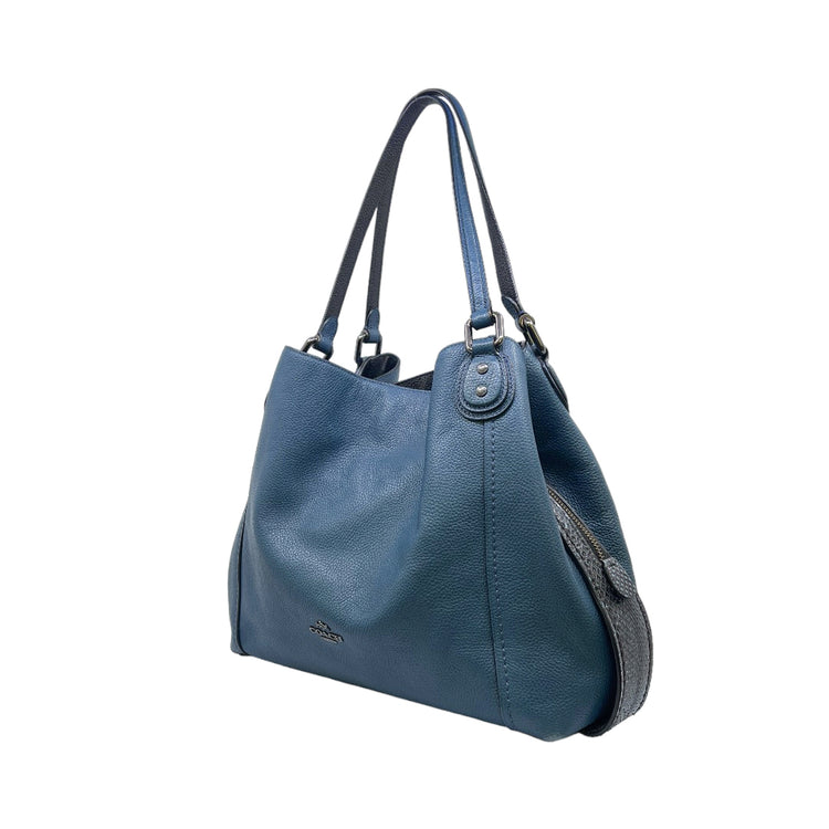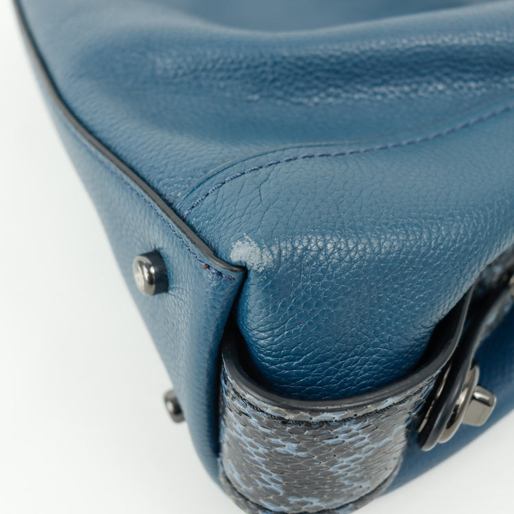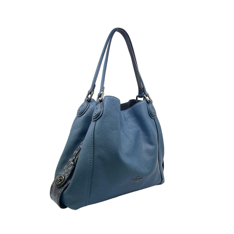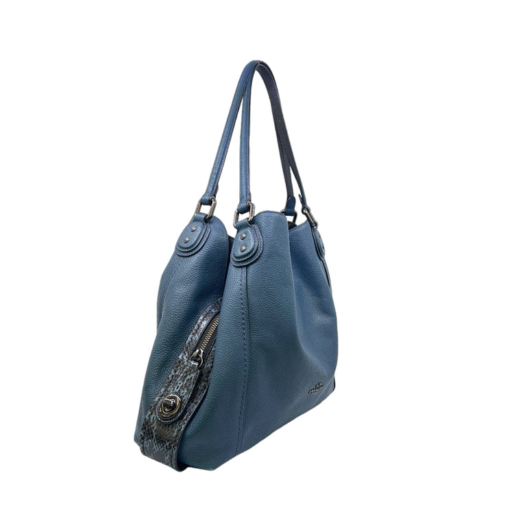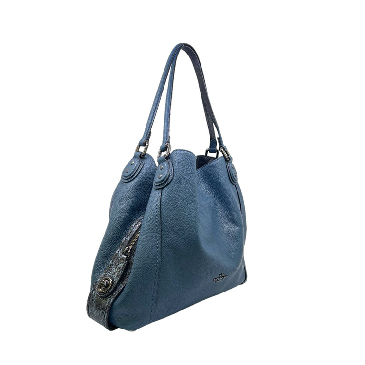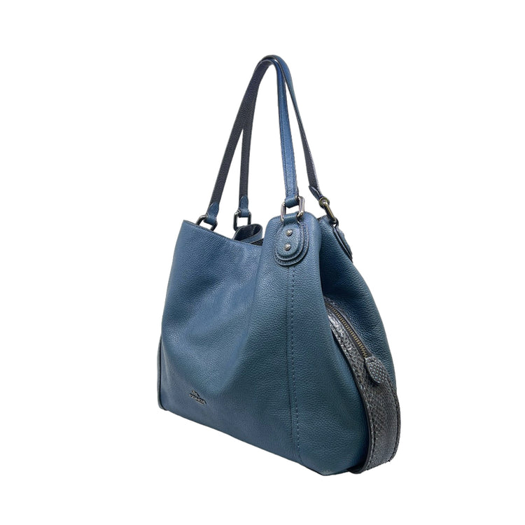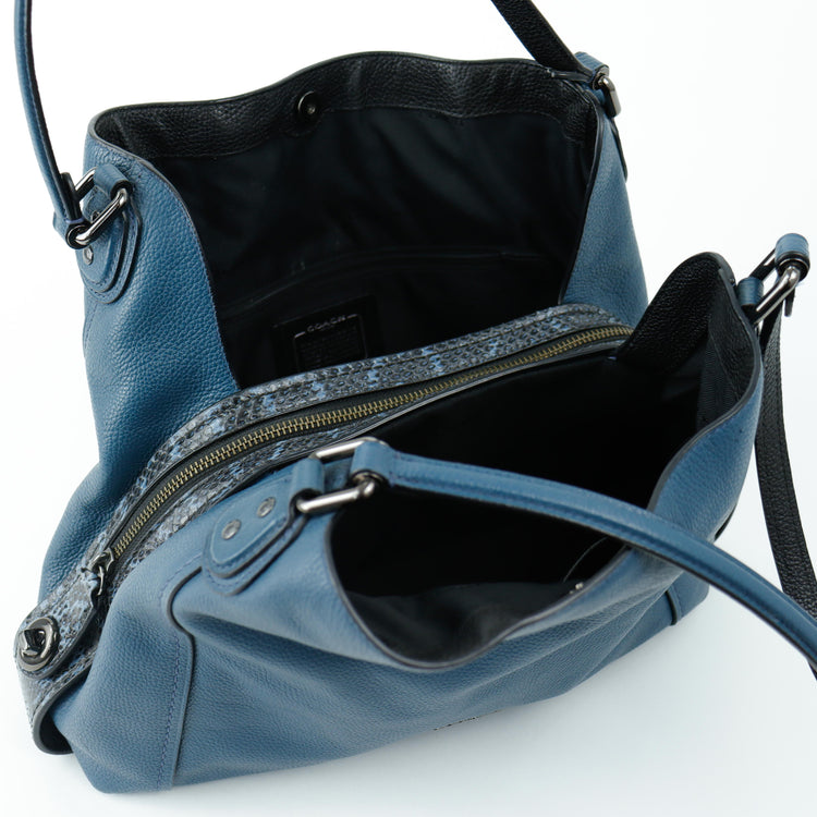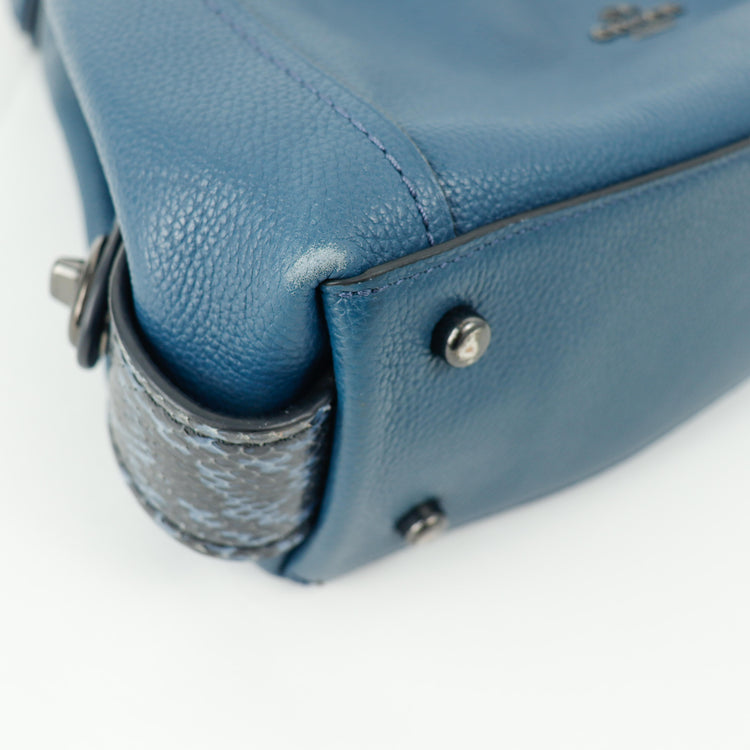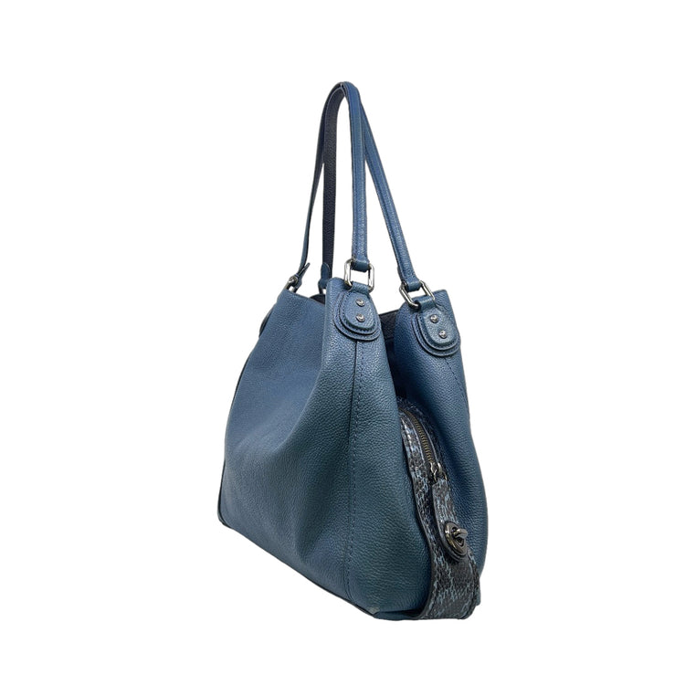 Bolso Coach, confeccionado en piel color azul con detalles en animal print, con 2 asas superiores semirrígidas y bolsillo intermedio con cierre de cremallera, herrajes en color grafito, detalles en las esquinas por poco uso.