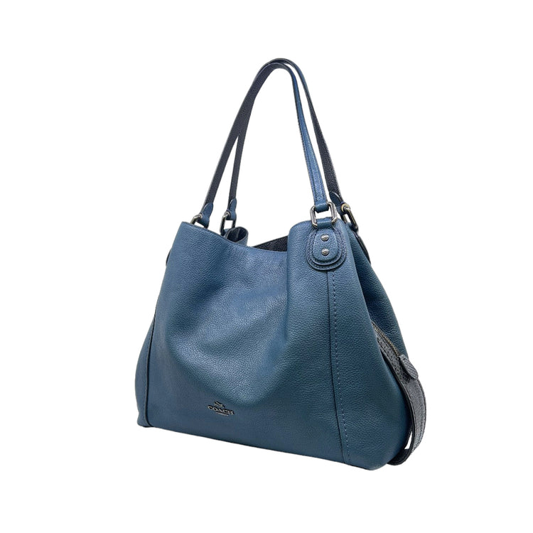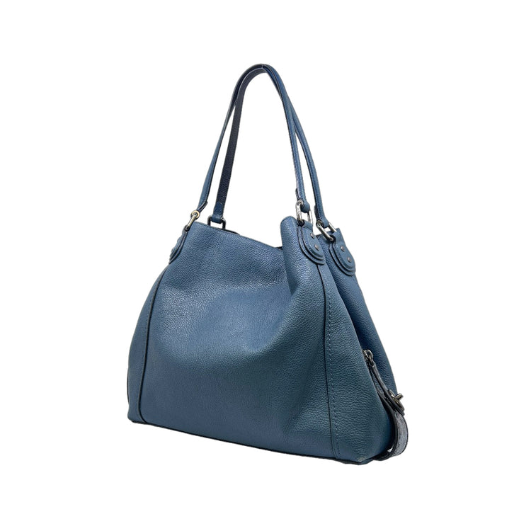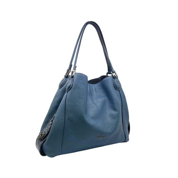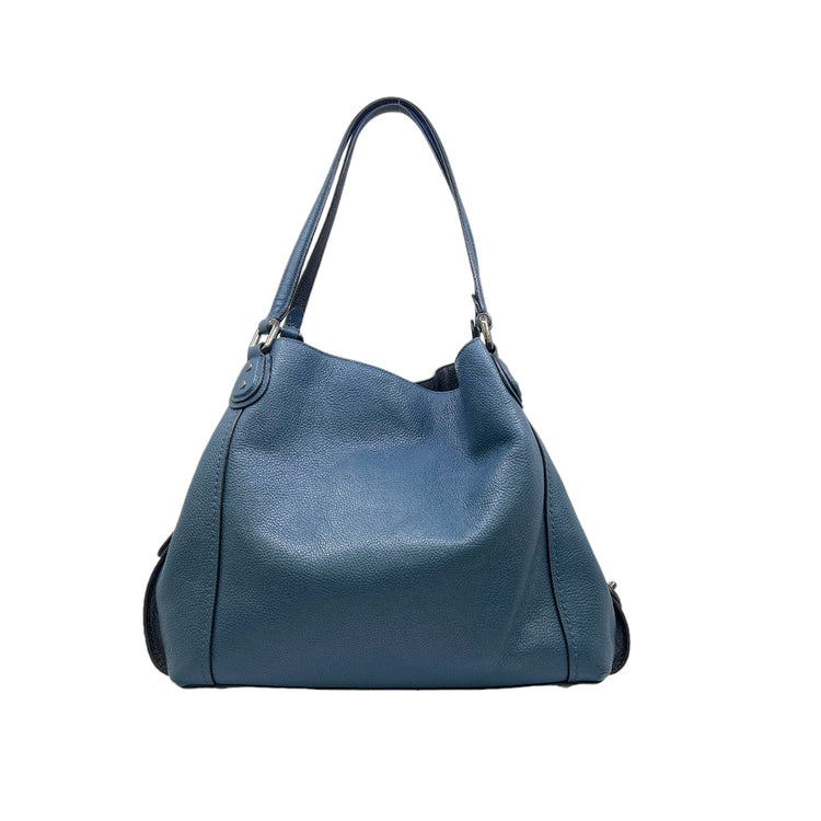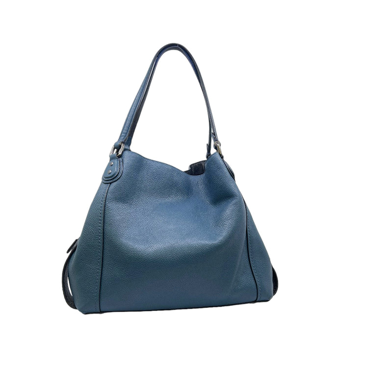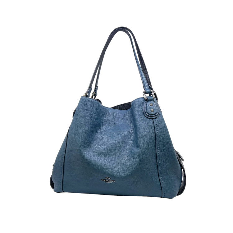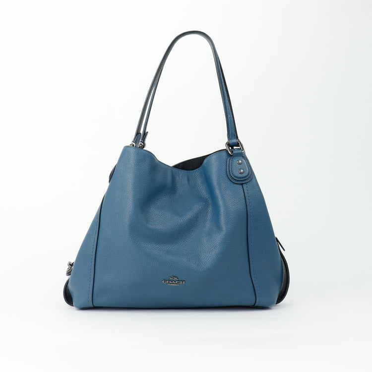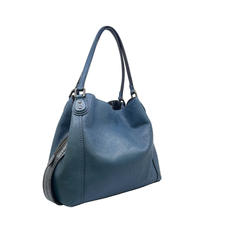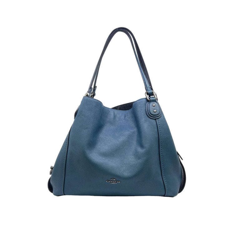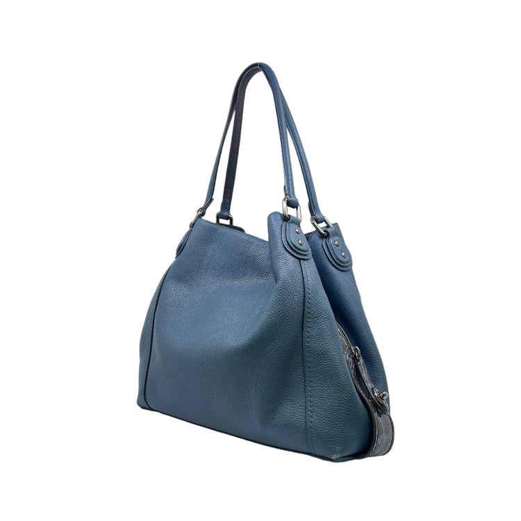 Bolso Coach, confeccionado en piel color azul con detalles en animal print, con 2 asas superiores semirrígidas y bolsillo intermedio con cierre de cremallera, herrajes en color grafito, detalles en las esquinas por poco uso.