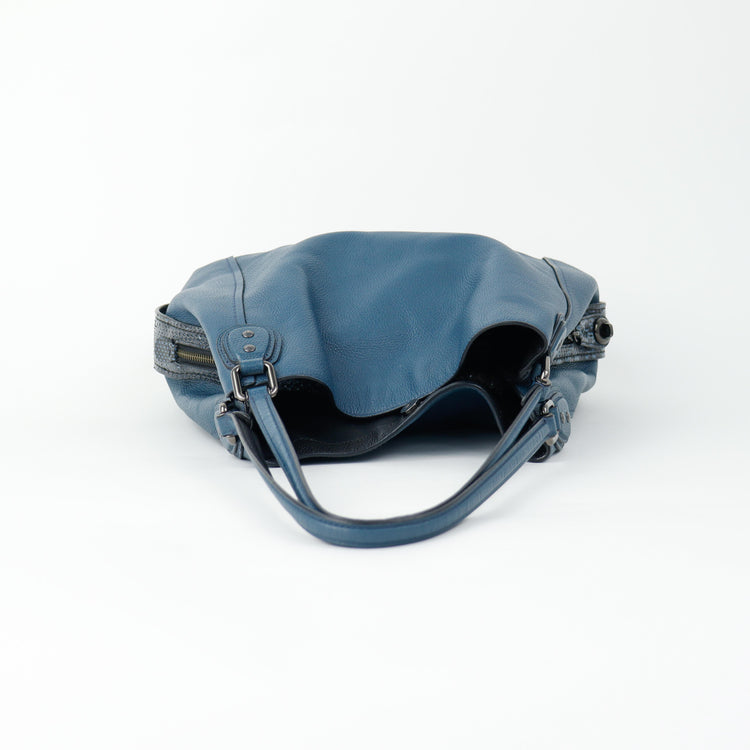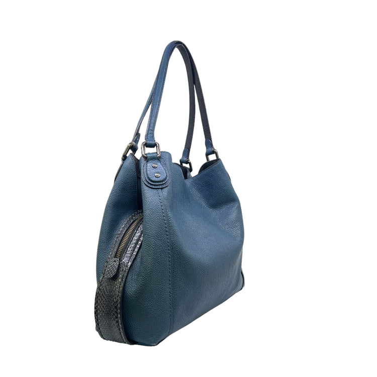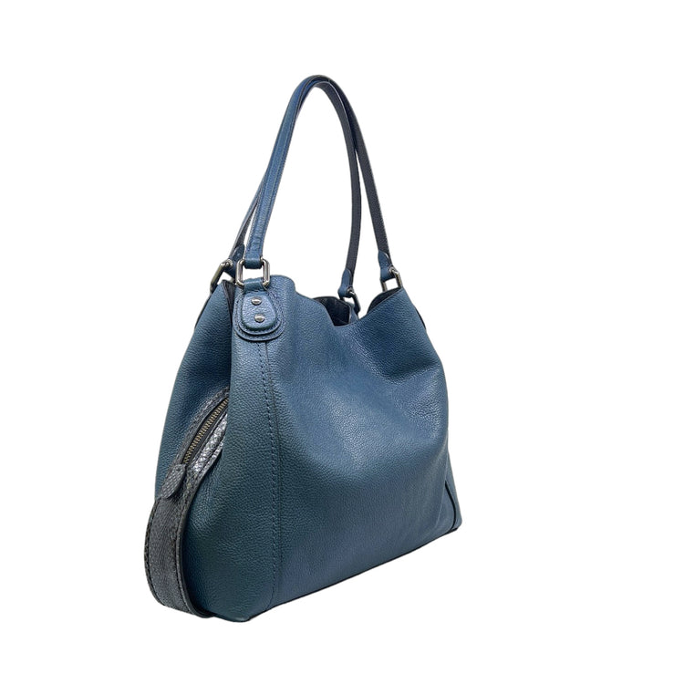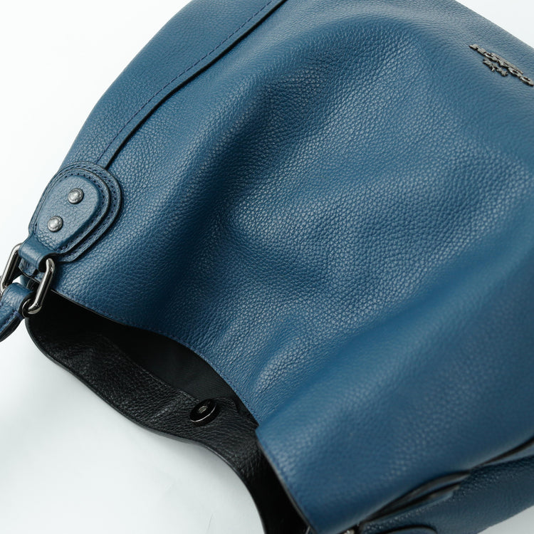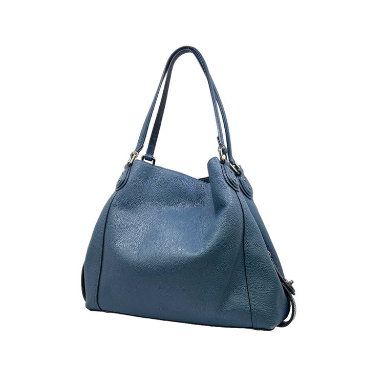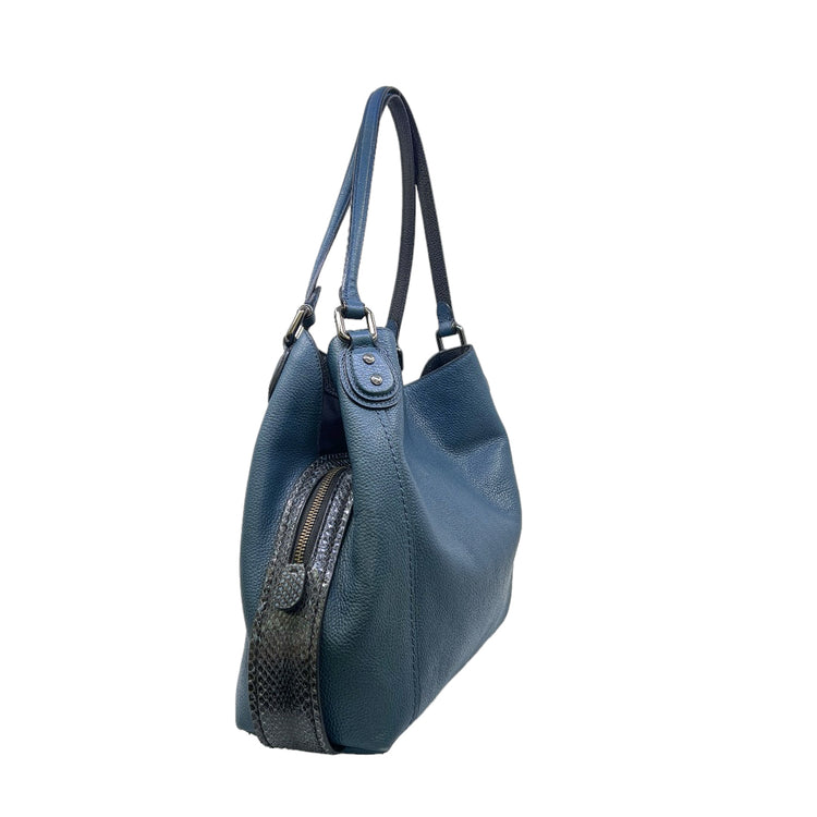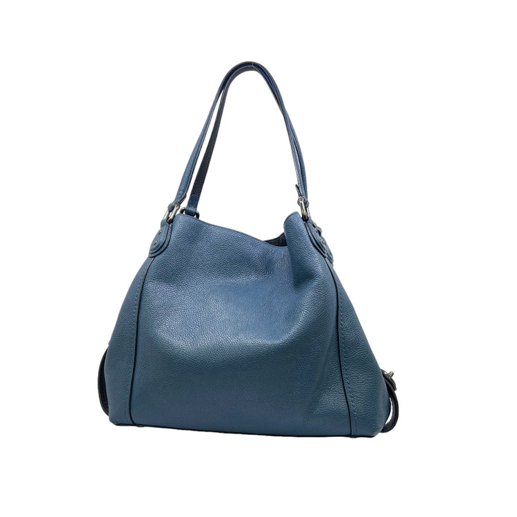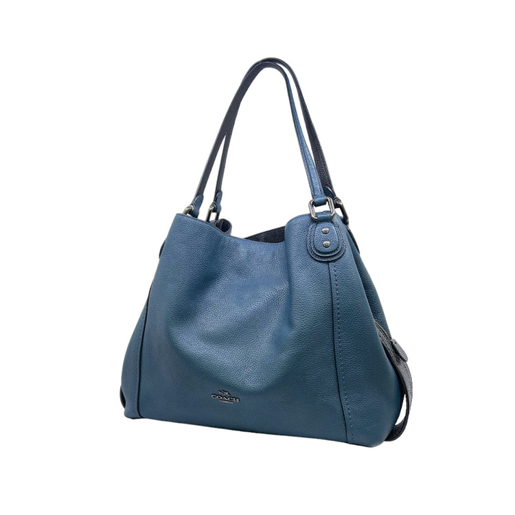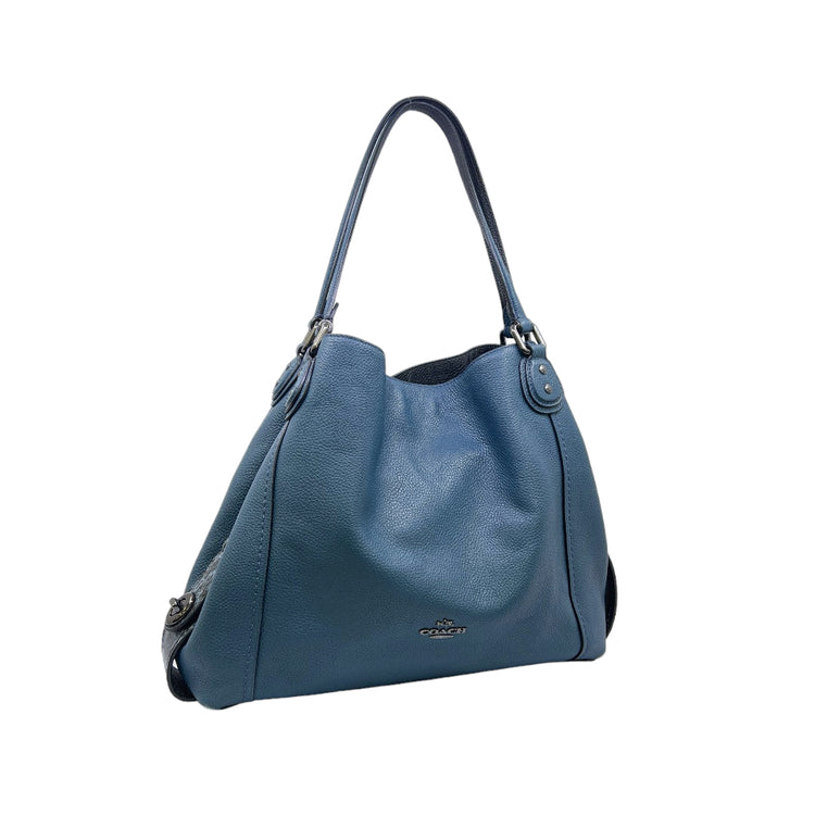 Bolso Coach, confeccionado en piel color azul con detalles en animal print, con 2 asas superiores semirrígidas y bolsillo intermedio con cierre de cremallera, herrajes en color grafito, detalles en las esquinas por poco uso.