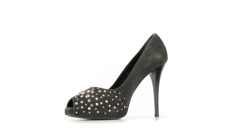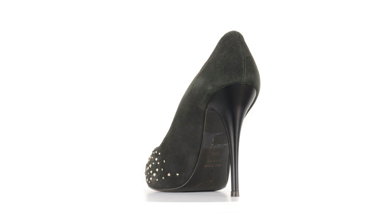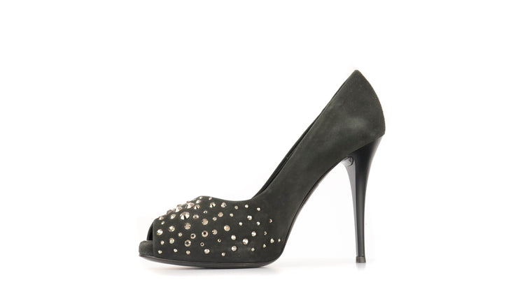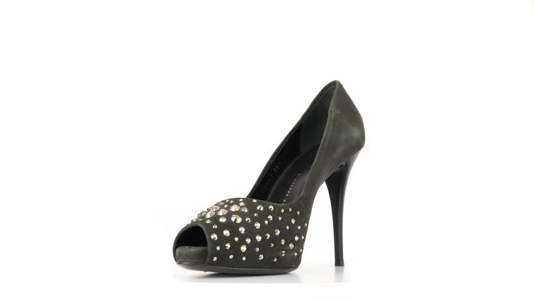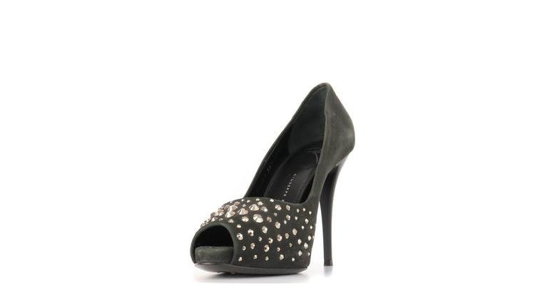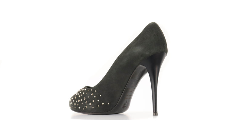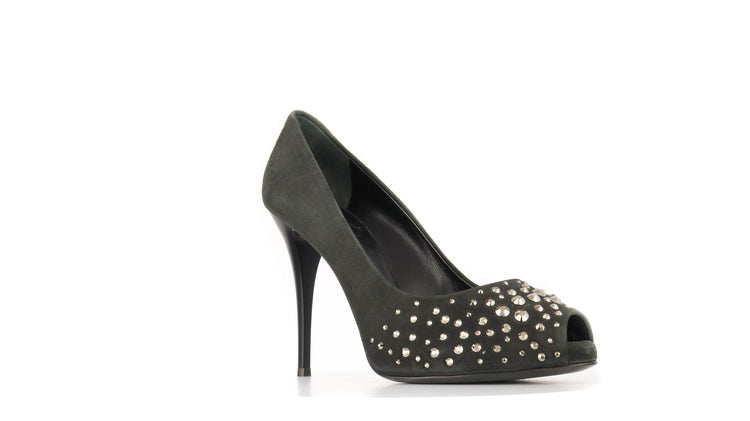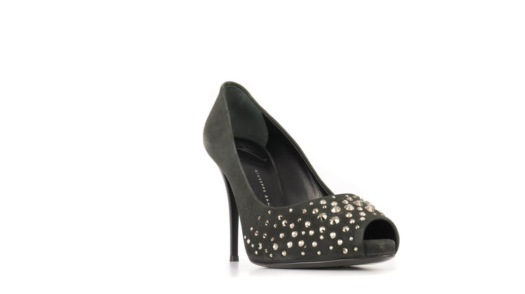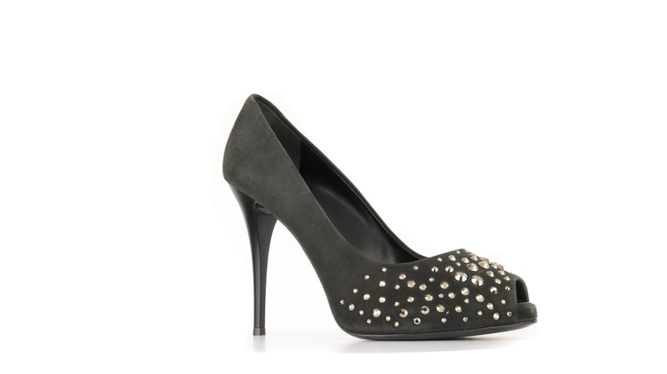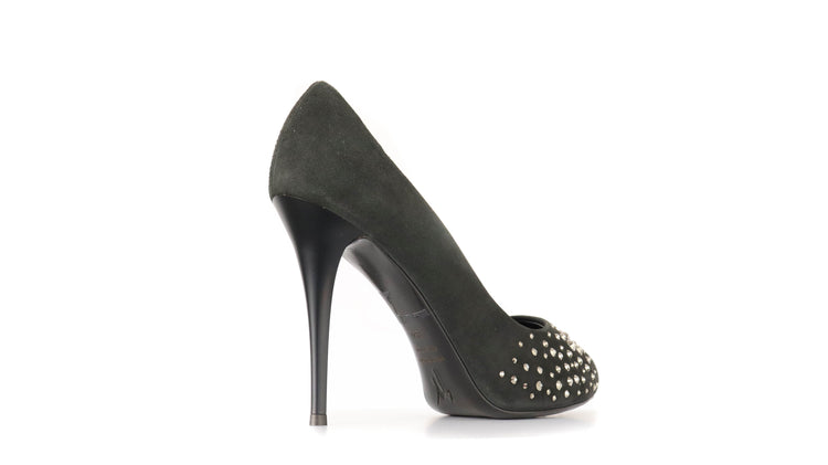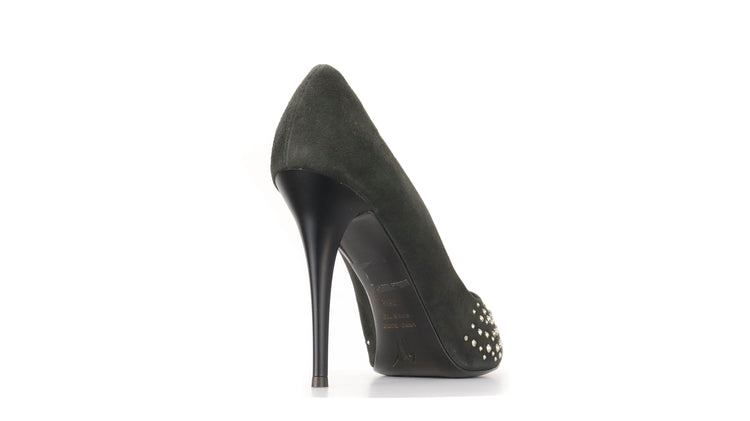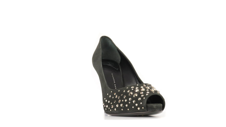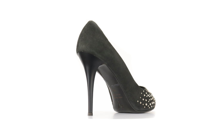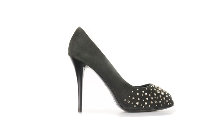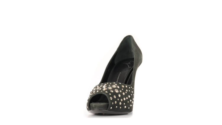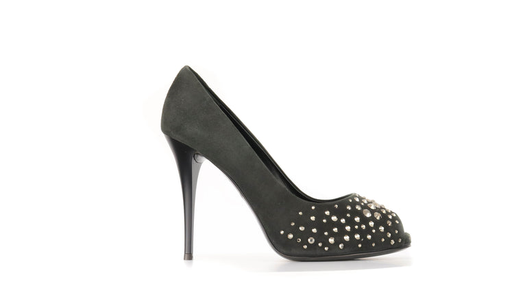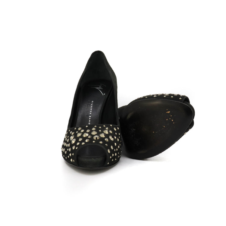 Tacones Giuseppe Zanotti, elaborados en gamuza color negro, con detalles de estoperoles en la parte frontal.