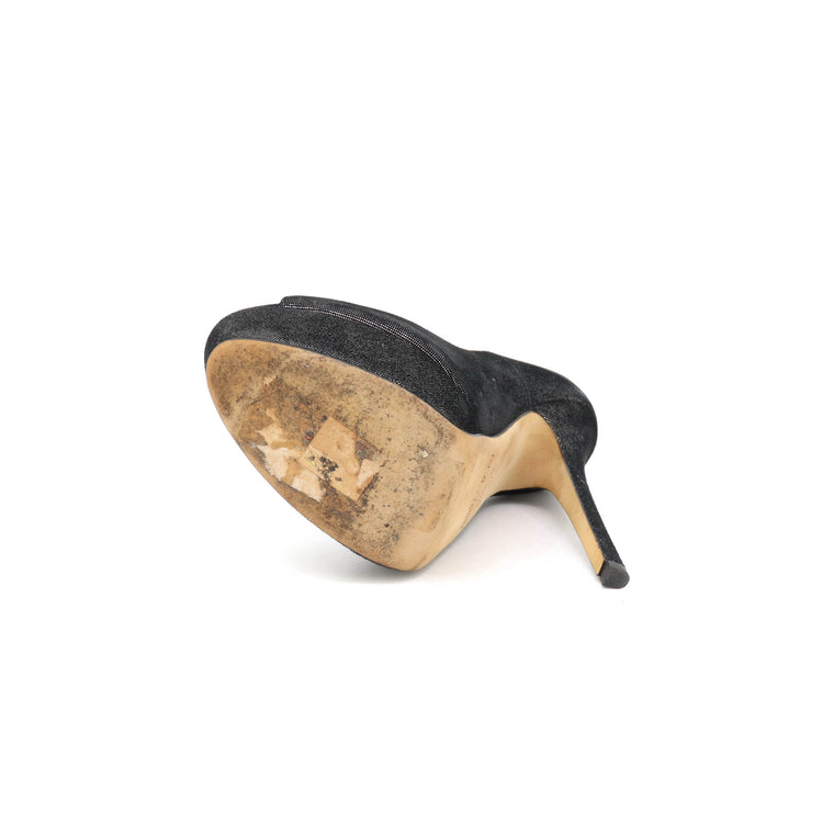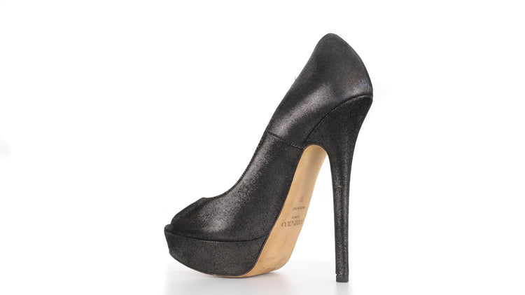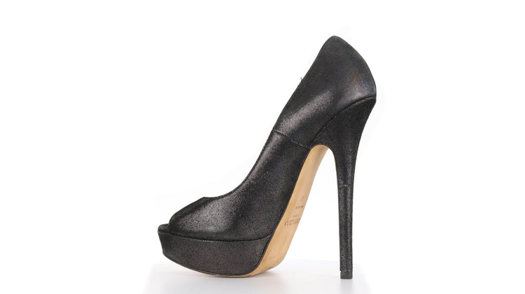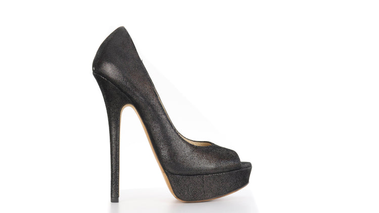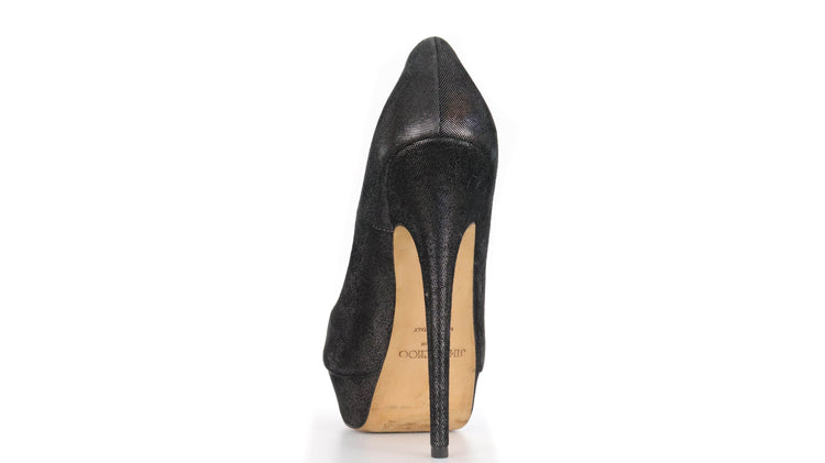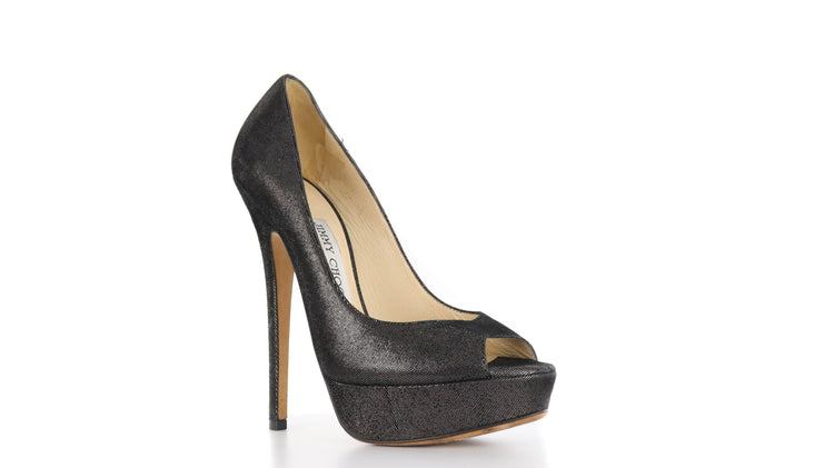 Tacones Jimmy Choo, elaborados en tela color negro y efecto metálico.