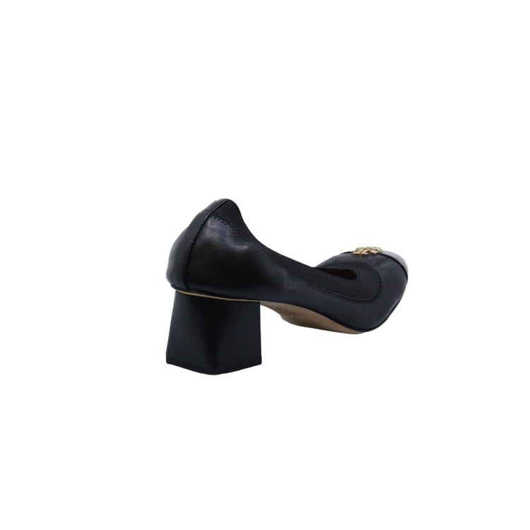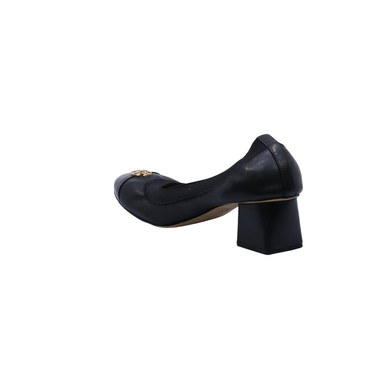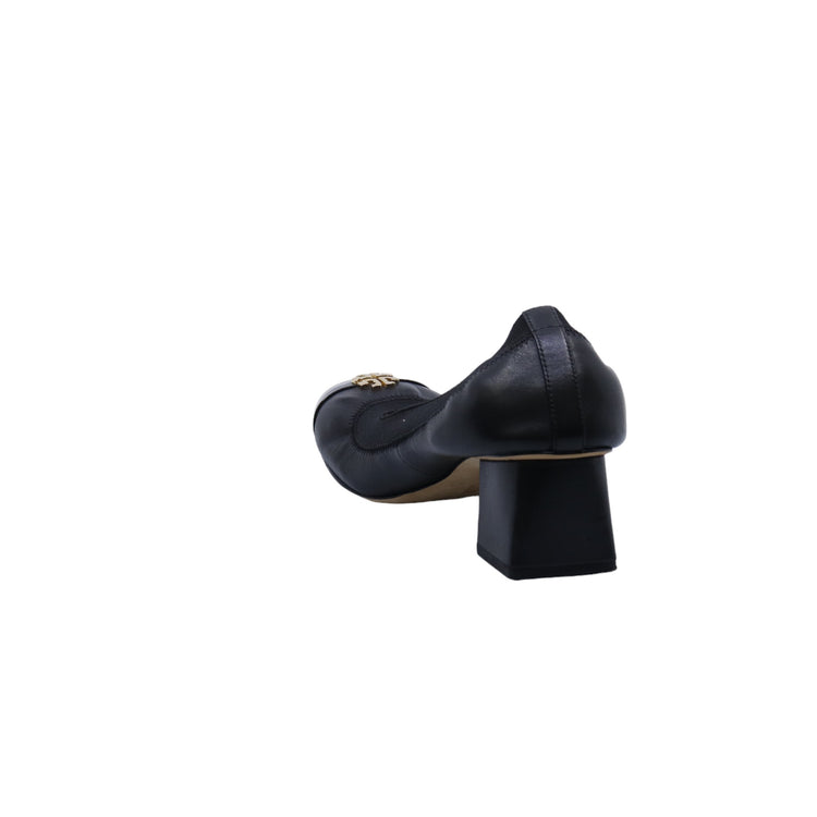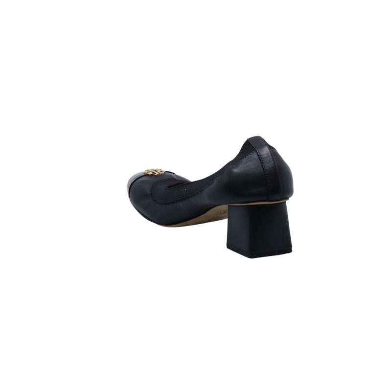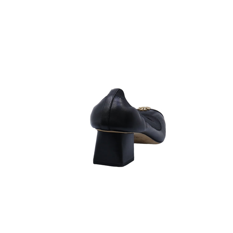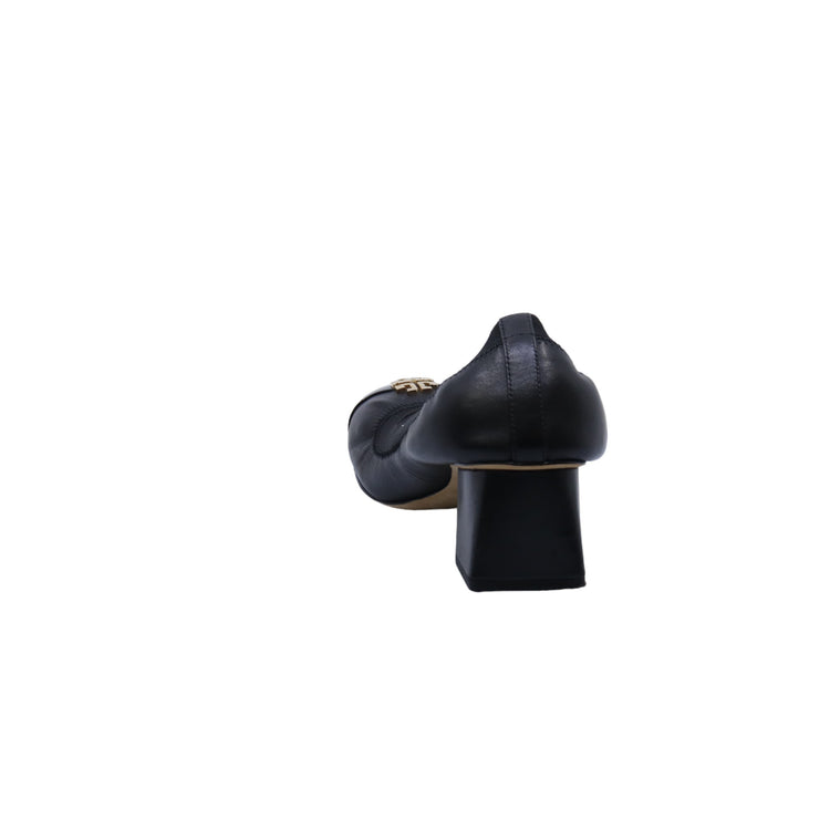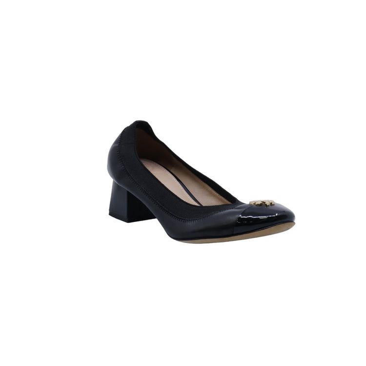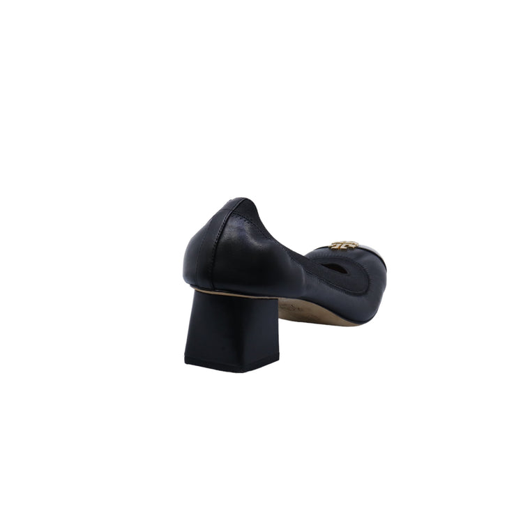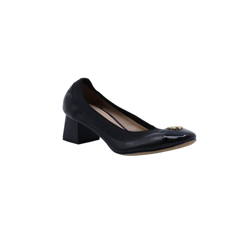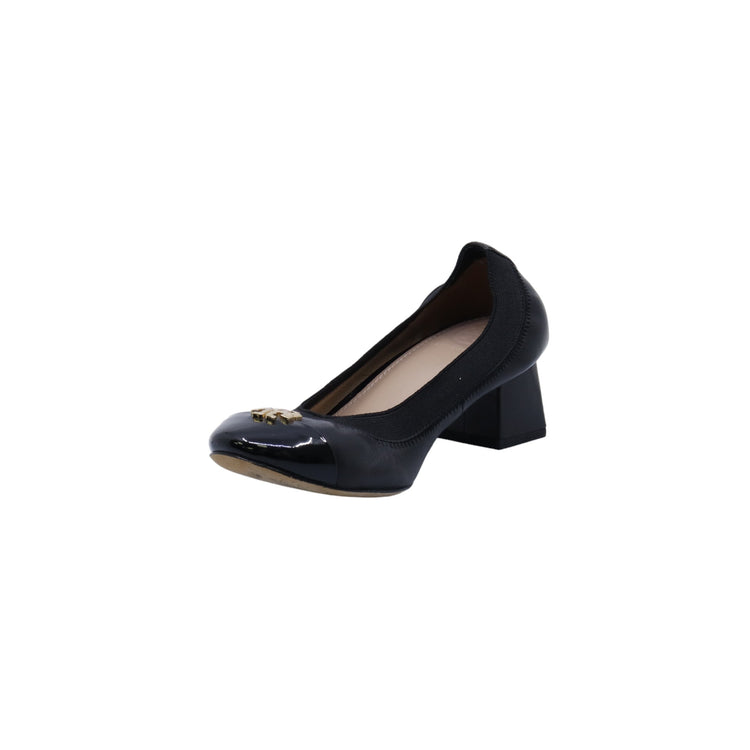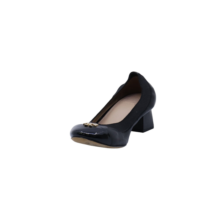 Zapatos con tacón bajo de la marca Tory Burch, confeccionados en piel color negro con ajuste elástico en empeine, puntera redonda en charol con el logotipo de la marca en metal dorado.