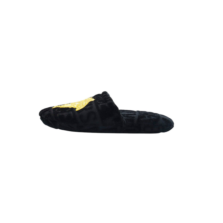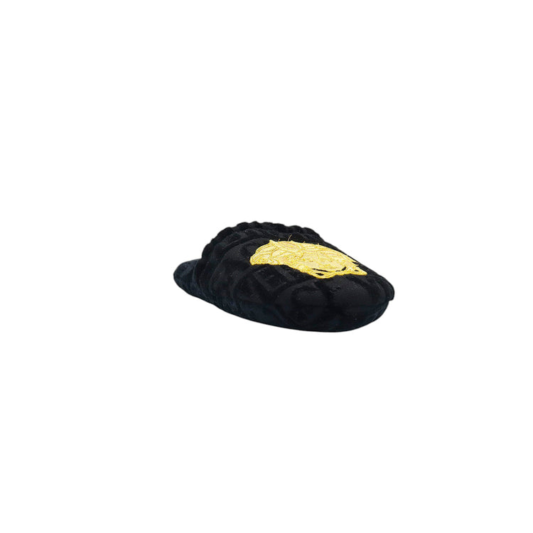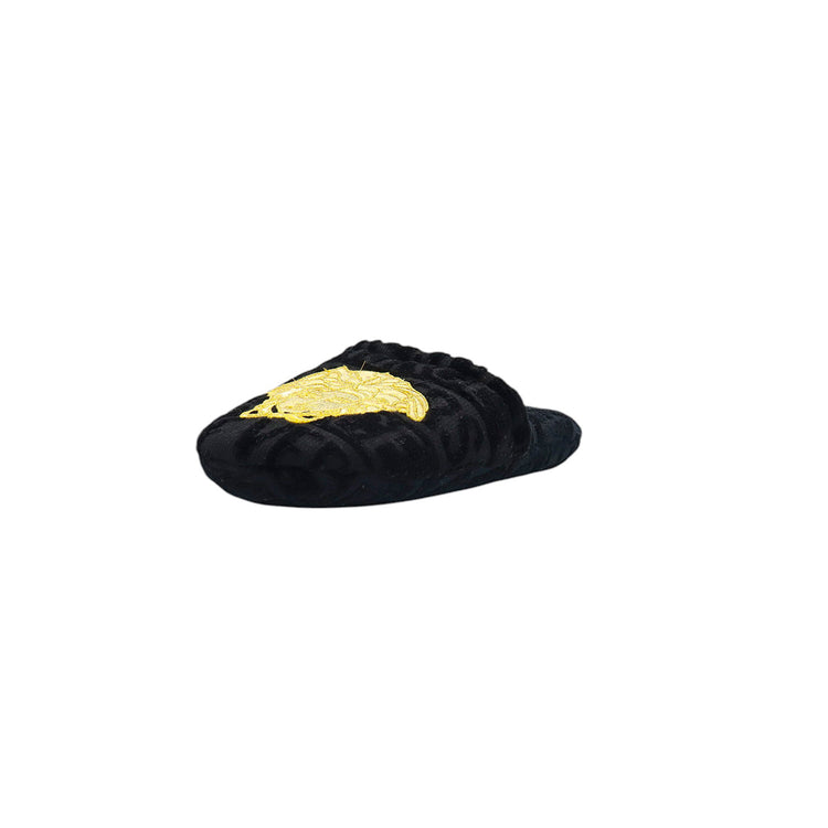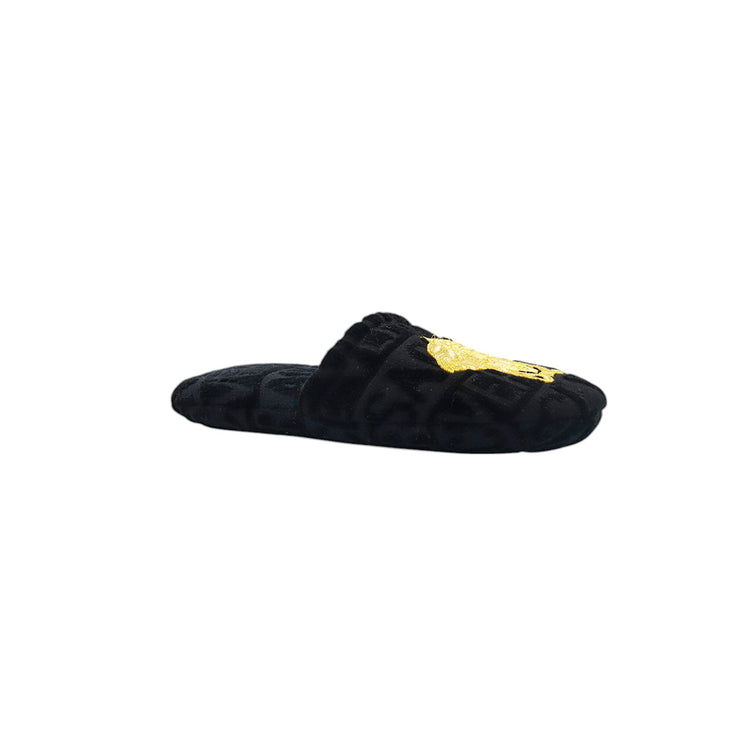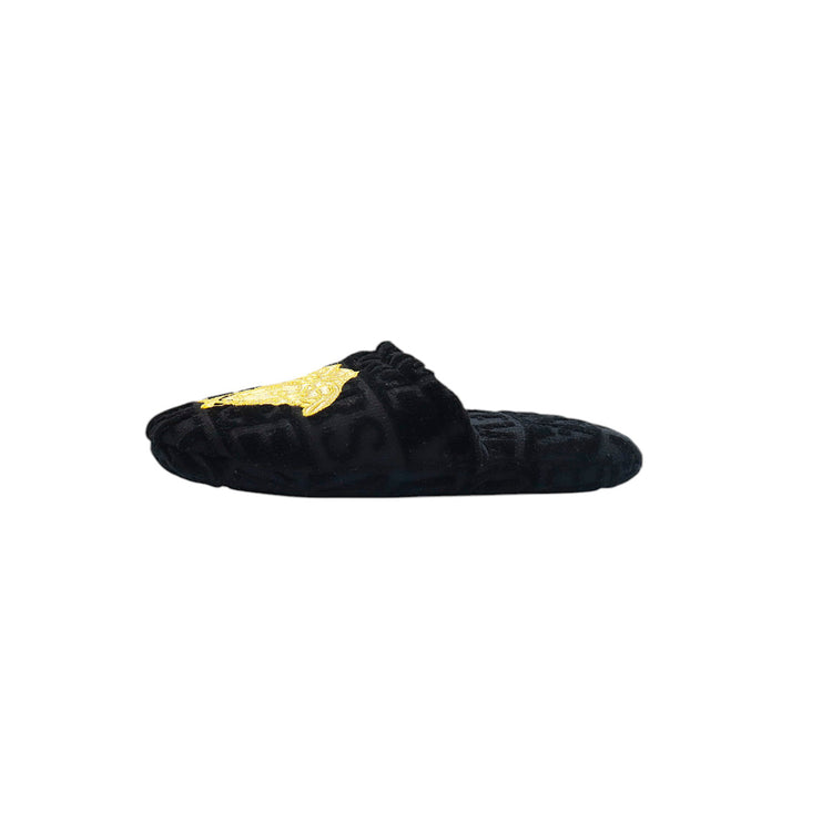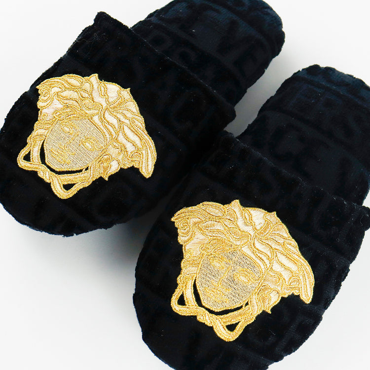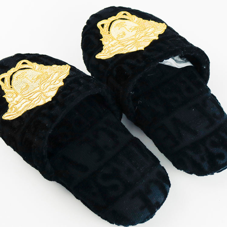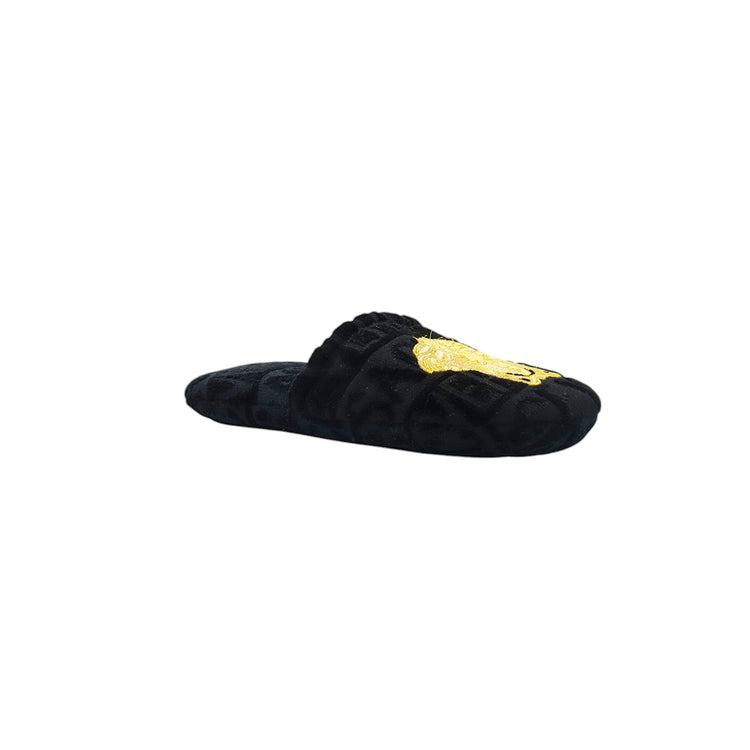 Slippers marca Versace, confeccionados en toalla textil con el estampado Versace Allover en toda la zapatilla, con el bordado de medusa en color dorado sobre el empeine.