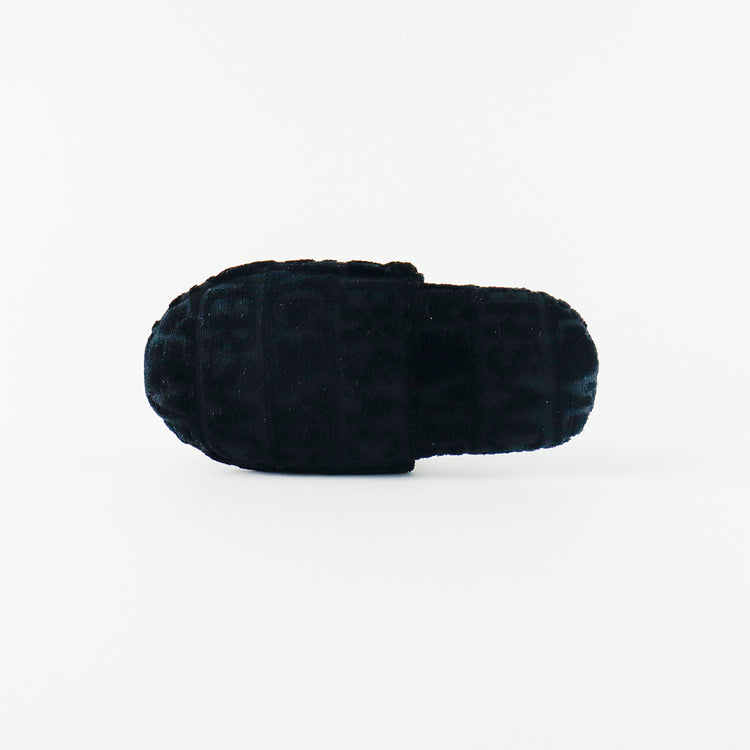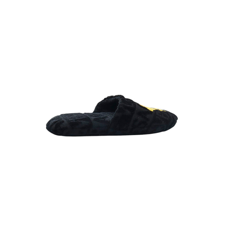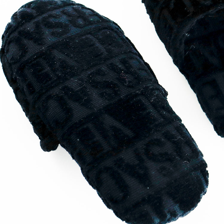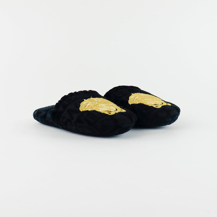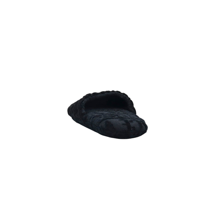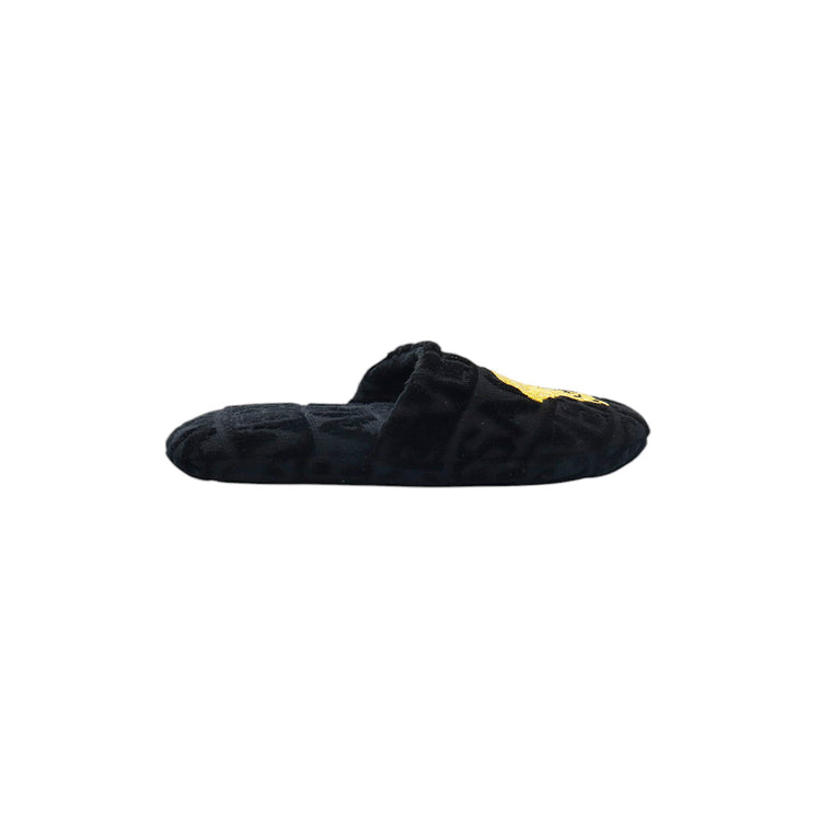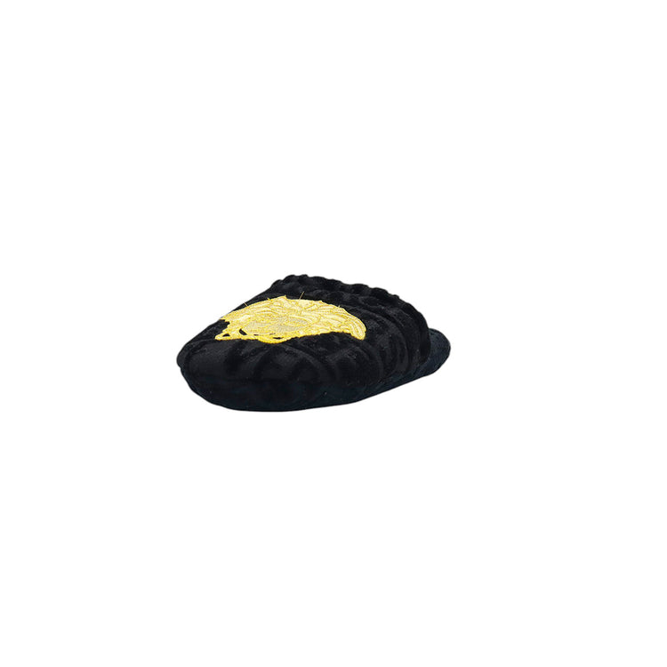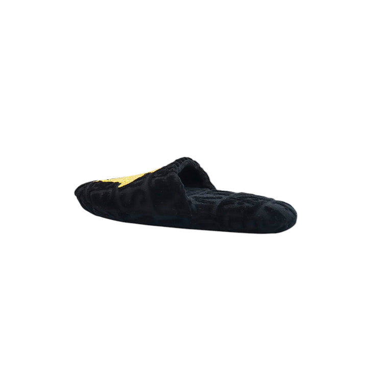 Slippers marca Versace, confeccionados en toalla textil con el estampado Versace Allover en toda la zapatilla, con el bordado de medusa en color dorado sobre el empeine.